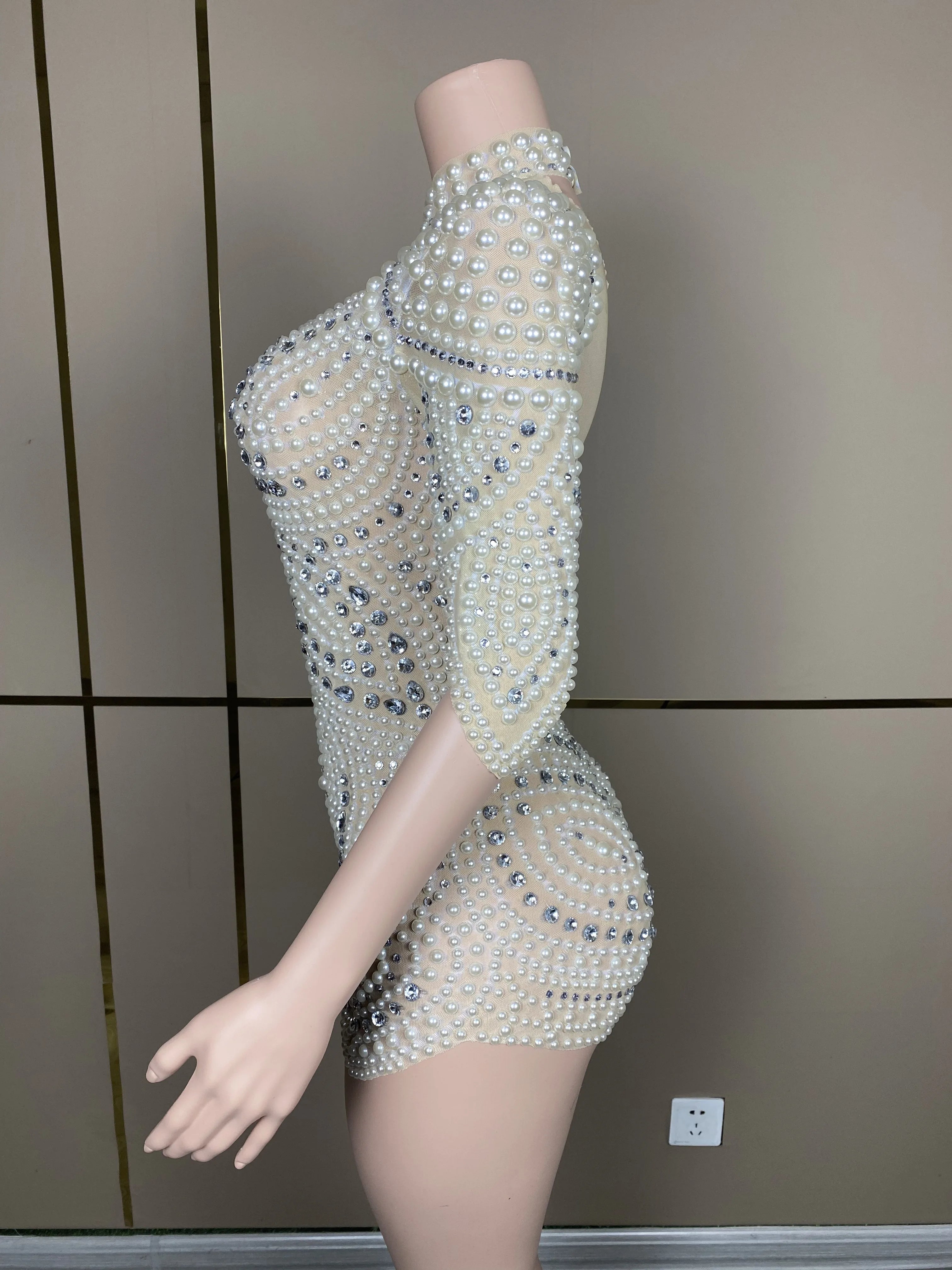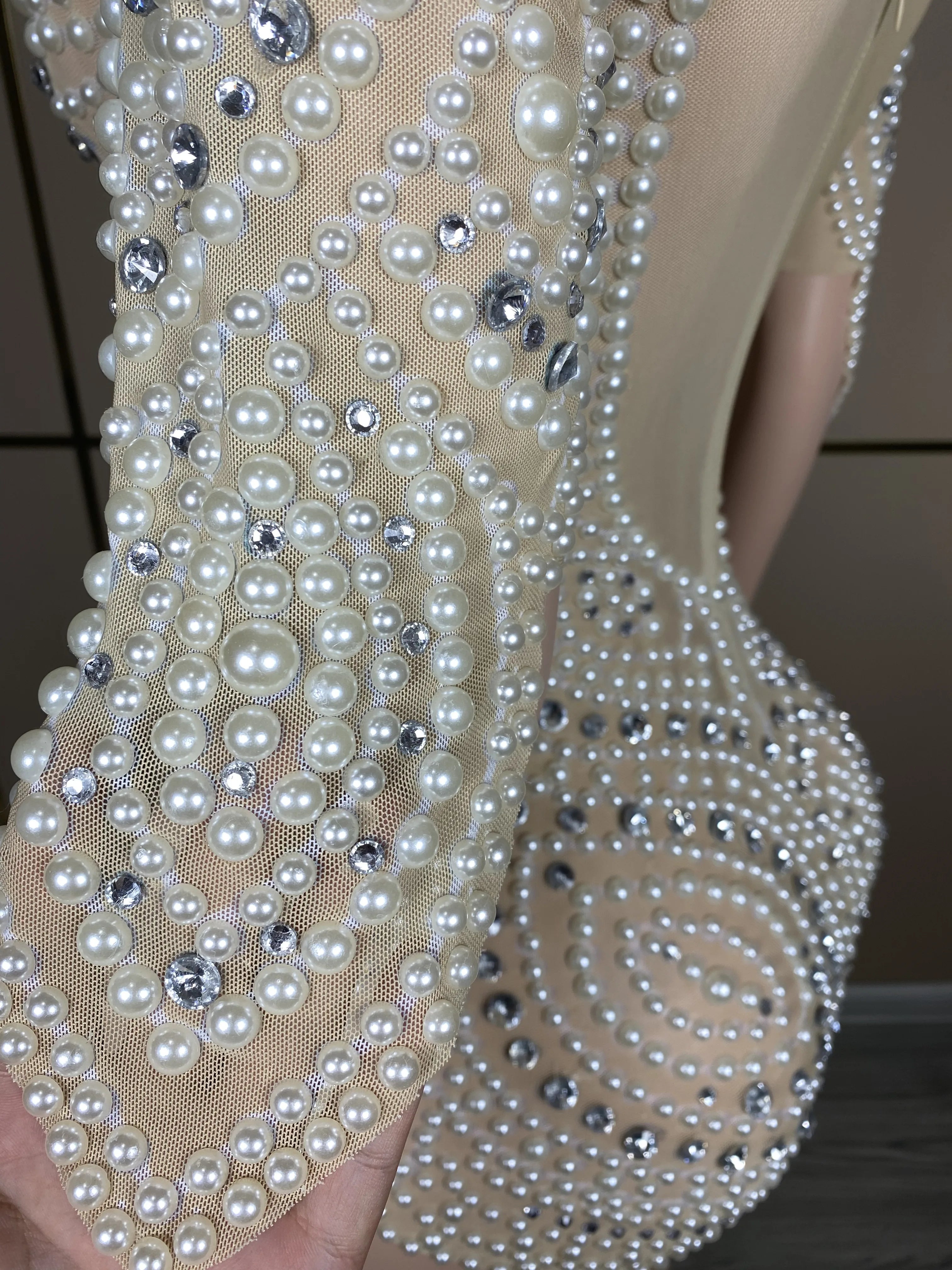 Designed Shining Silver Rhinestones Pearls Long Sleeves Celebrate Dress Birthday Sexy Stretch Costume Outfit Prom Party Wear
