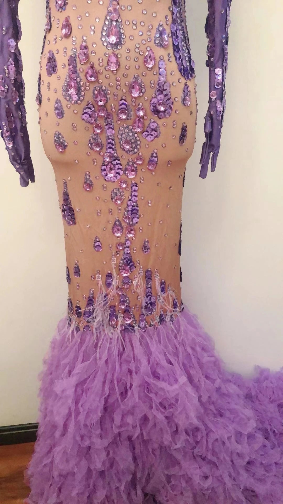 This Designer Purple Rhinestone Evening Party Dress is a stunning choice for birthday celebrations, evening parties, and stage performances. The mermaid-style dress is designed to hug your curves and create a glamorous silhouette. Adorned with shimmering rhinestones, this floor-length dress is perfect for singers and performers who want to make a statement on stage. Celebrate in style with this elegant and eye-catching dress that is sure to turn heads.