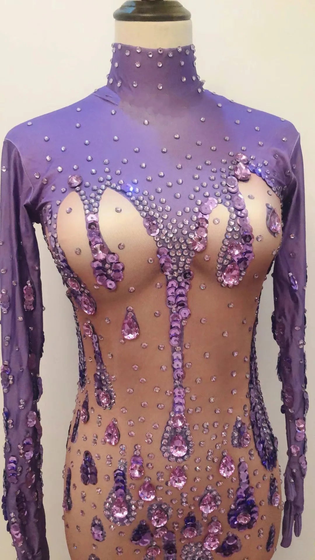 Designer Purple Rhinestone Evening Party Dress Women Stretch Birthday Celebration Mermaid Dress Singer Stage Floor Length Dress