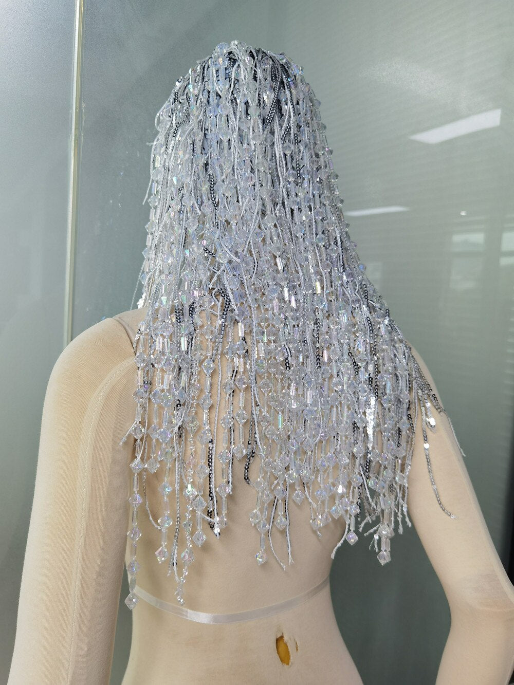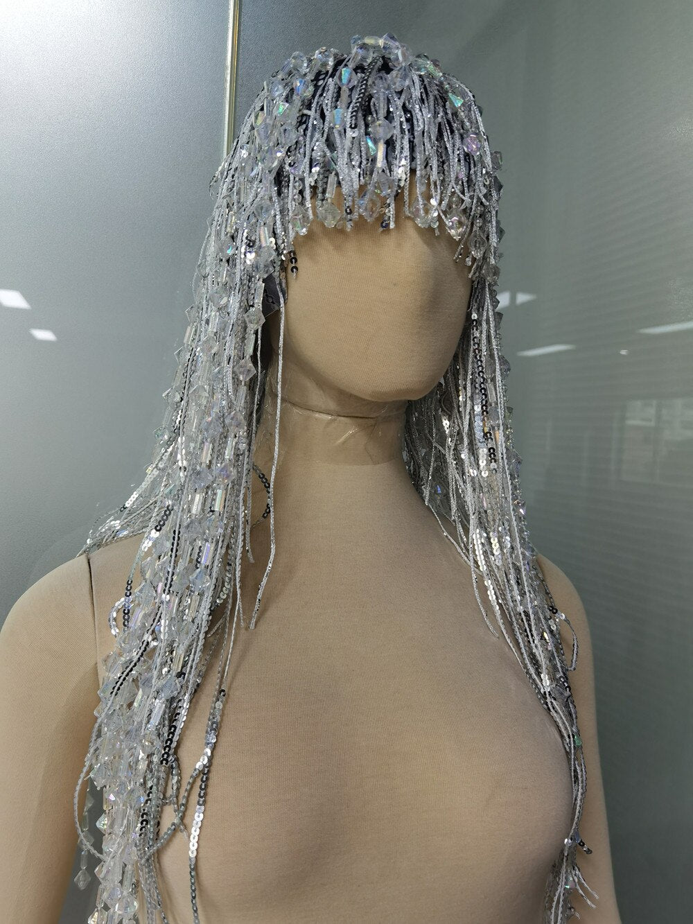 Designer Silver Sequin Crystal Tassel Wigs Women Birthday Party Rhinestone Fringes Headwear Club Stage Dancer Singer Accessories
