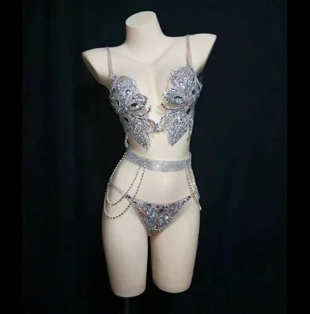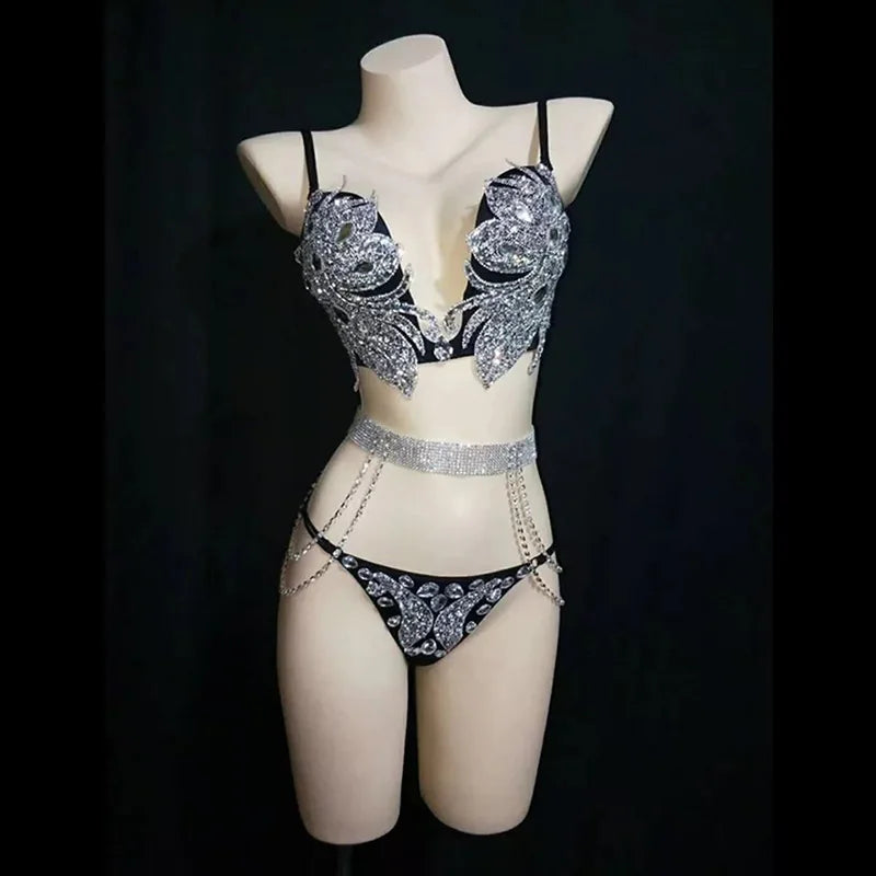 Diamond Bra Gold Black Silver Rhinestones Bikini Set DJ Nightclub Bar Sexy Performance Costume Women Stage Wear Pole Dancing