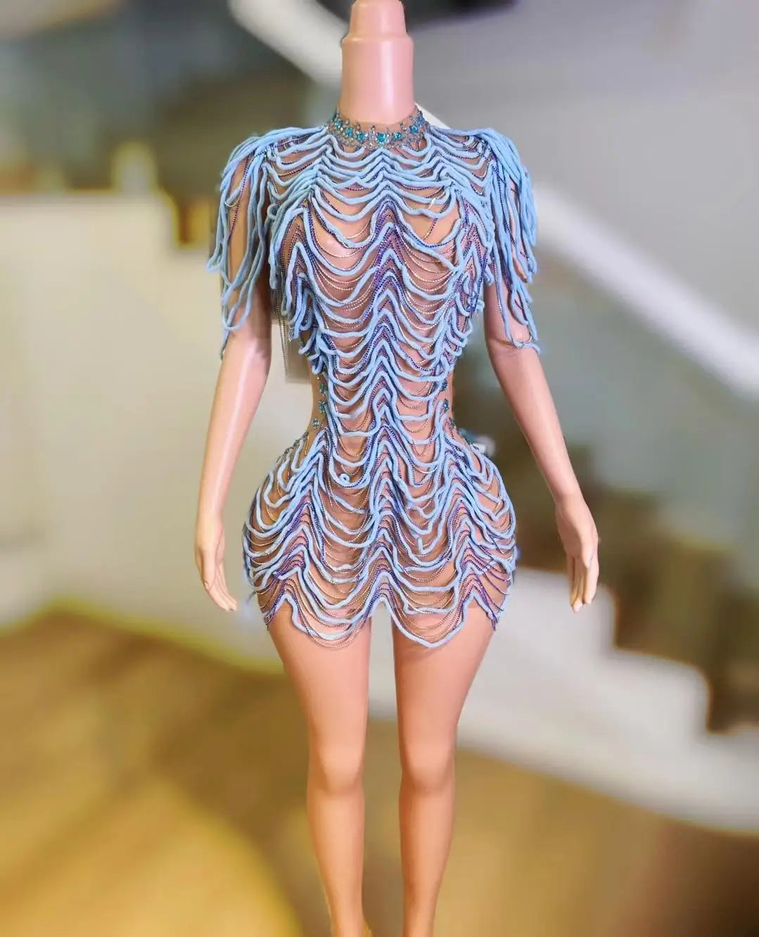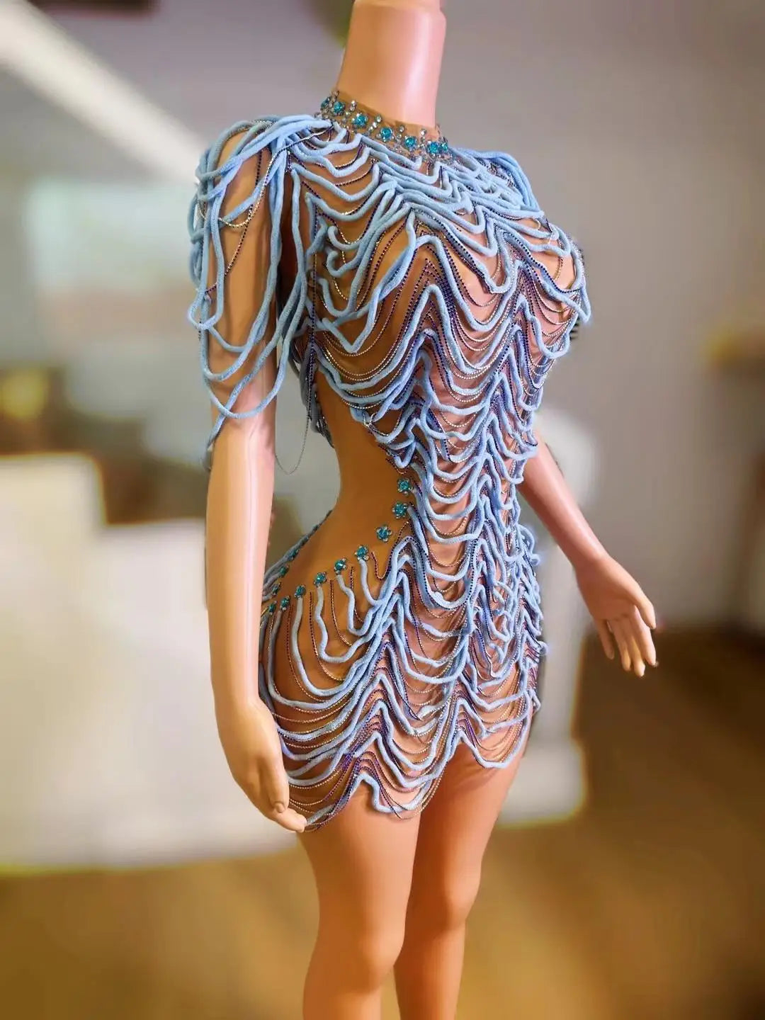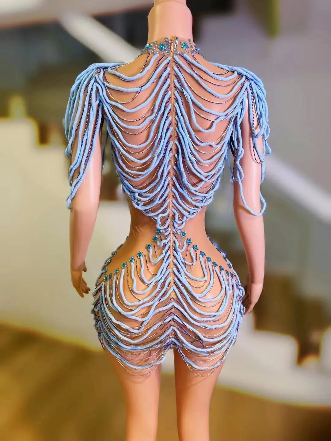 Capture the crowd with this daring and dynamic performance piece: an Elastic Mesh, Tight‑Fitting Colorful Diamond Dress featuring chain accents and a short acrobatic skirt. Designed for aerialists, dancers, club performers, and stage artists, this costume combines high‑stretch performance fabrics with eye‑catching embellishments that move with the body and read clearly under stage lights.