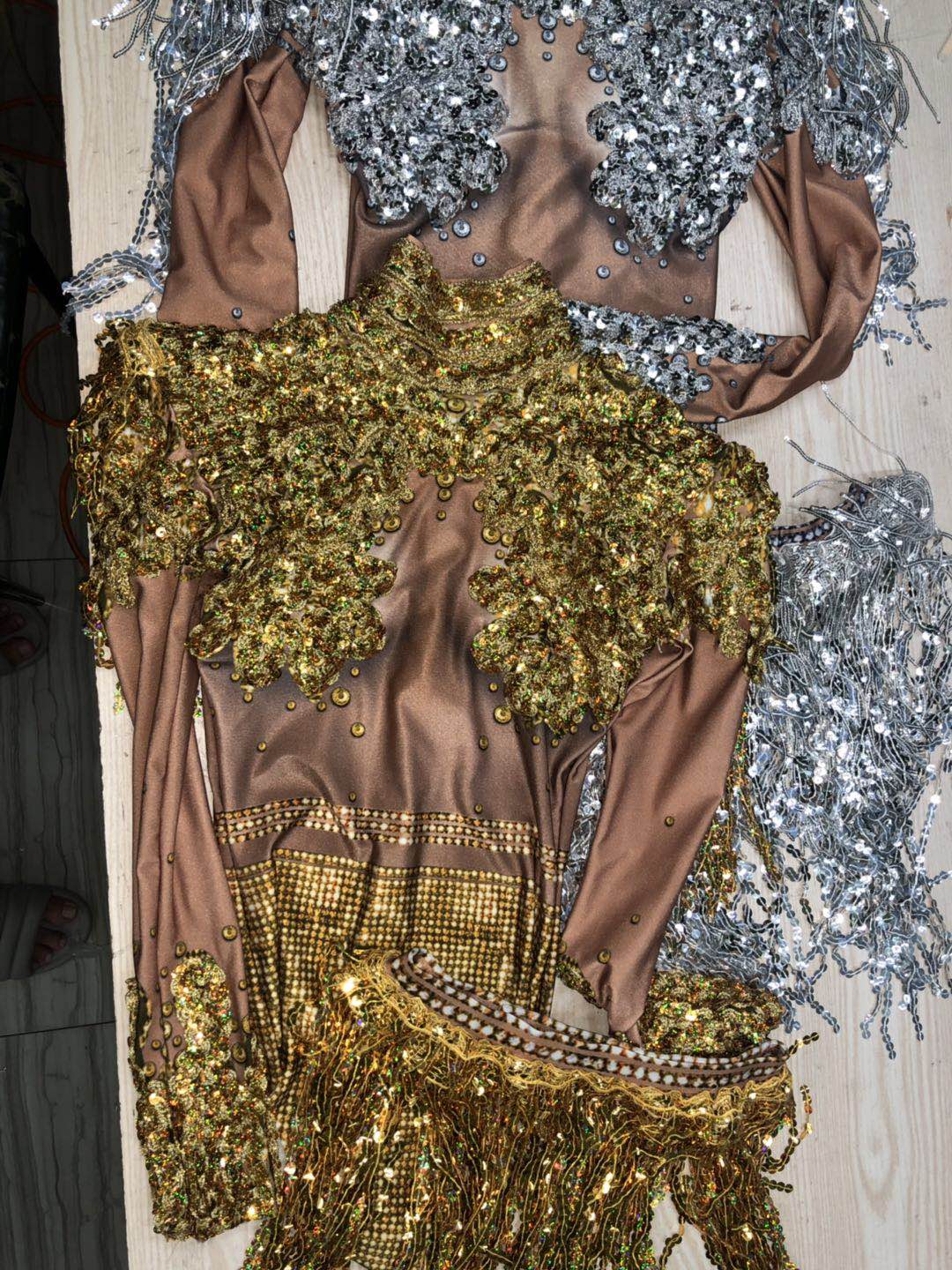 Elastic Nude Rhinestone Tassel Party Bodysuit Outfit Set Women Nightclub Prom Crystal Fringe Leotard DS Dance Stage Wear