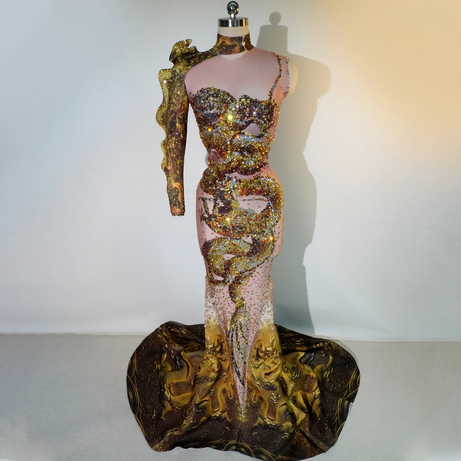 Step into elegance with this stunning long mermaid dress, featuring a luxurious rhinestone design and a chic one-shoulder neckline. Adorned with eye-catching 3D prints and radiant gold accents, this dress is the perfect choice for prom, stage performances, and dance events. Its sexy silhouette is ideal for clubs and festivals, ensuring you capture the spotlight and leave a lasting impression wherever you go.