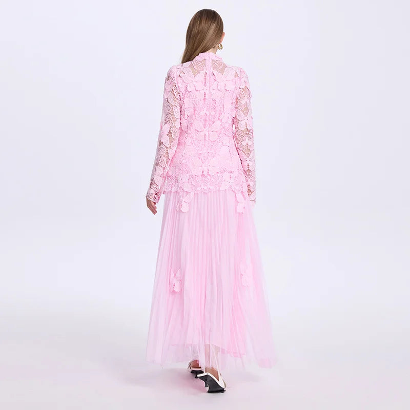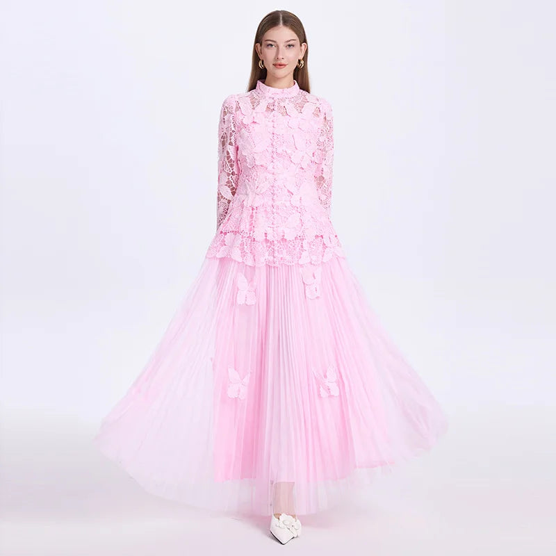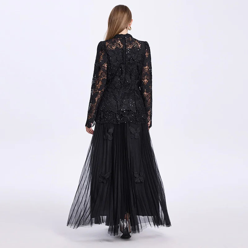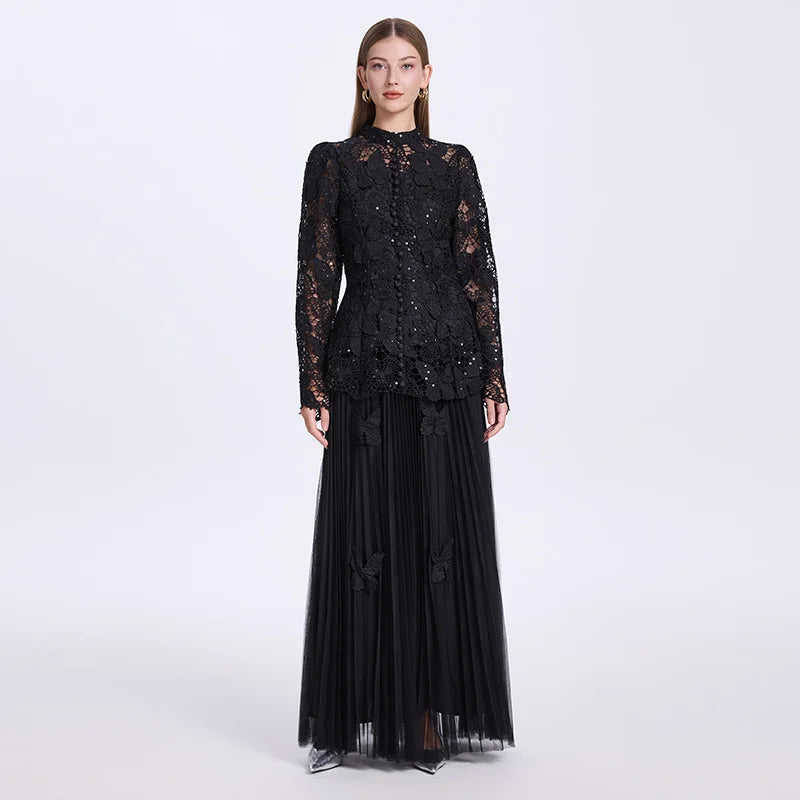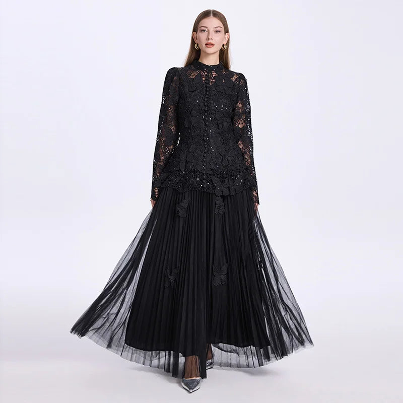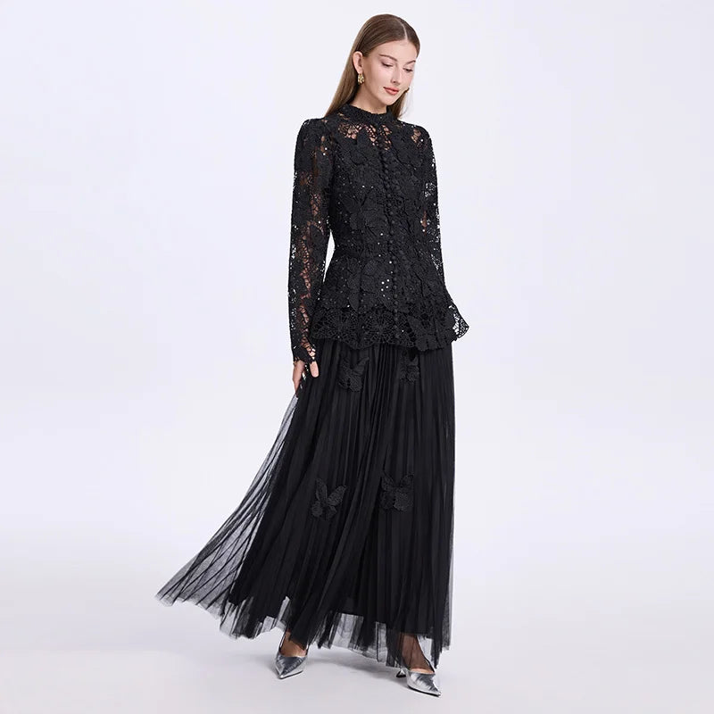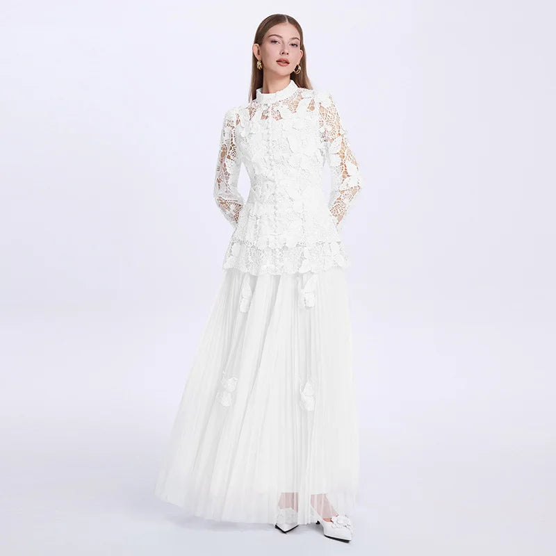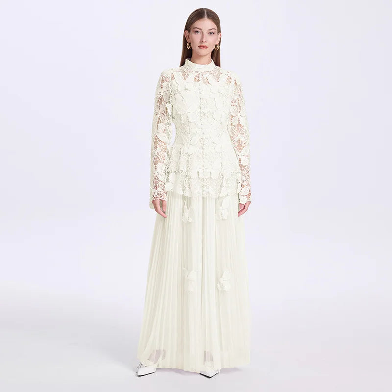 Elegant Long Maxi Dress 2 Piece Sets Women Spring Summer Holiday Embroidery Pearls Hollow Out Party Crop Tops Skirts Suits
