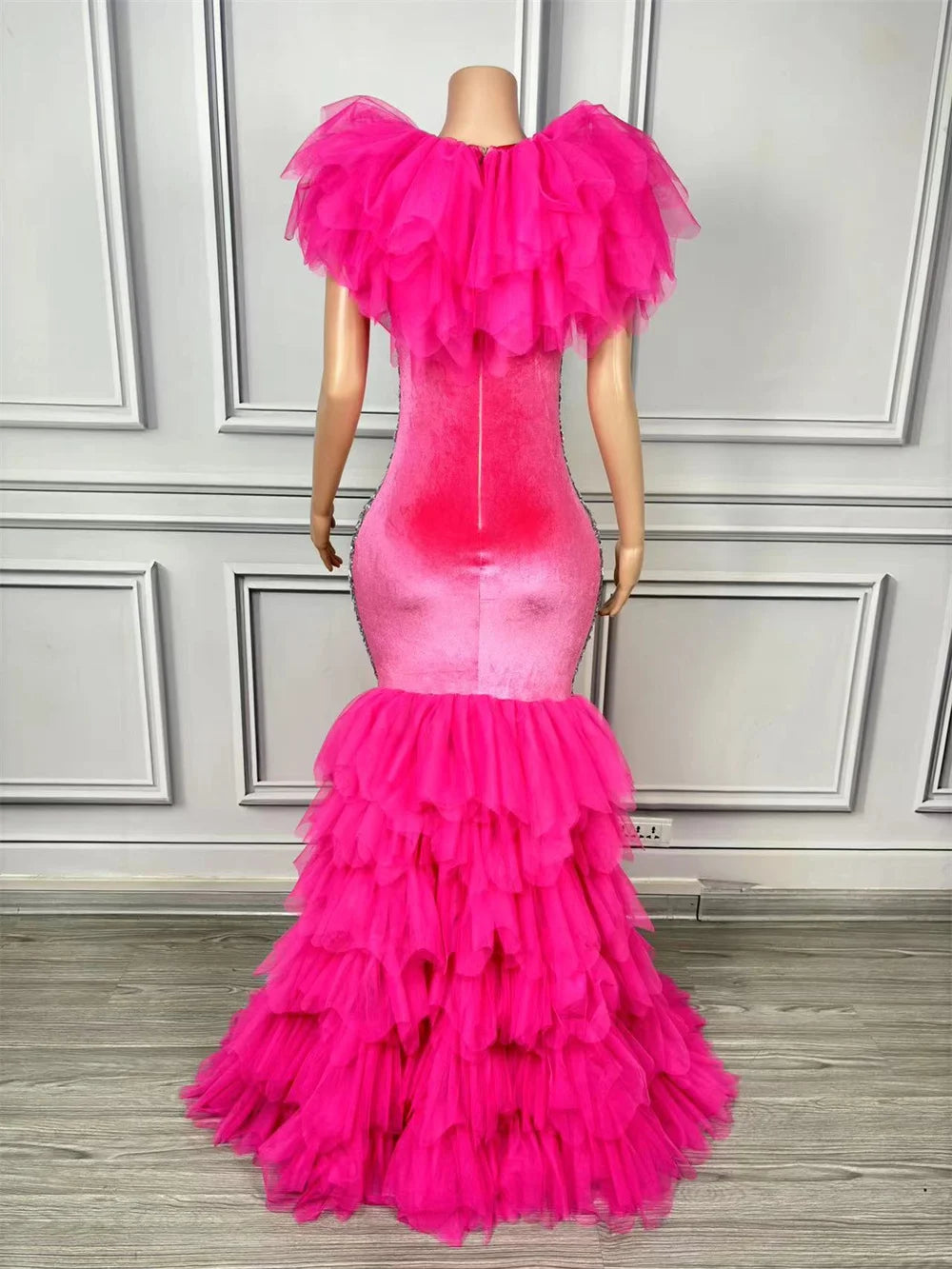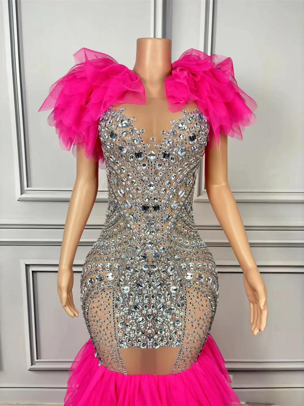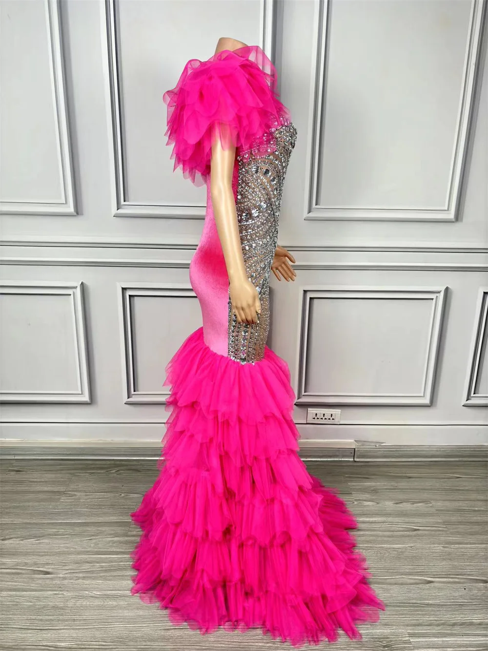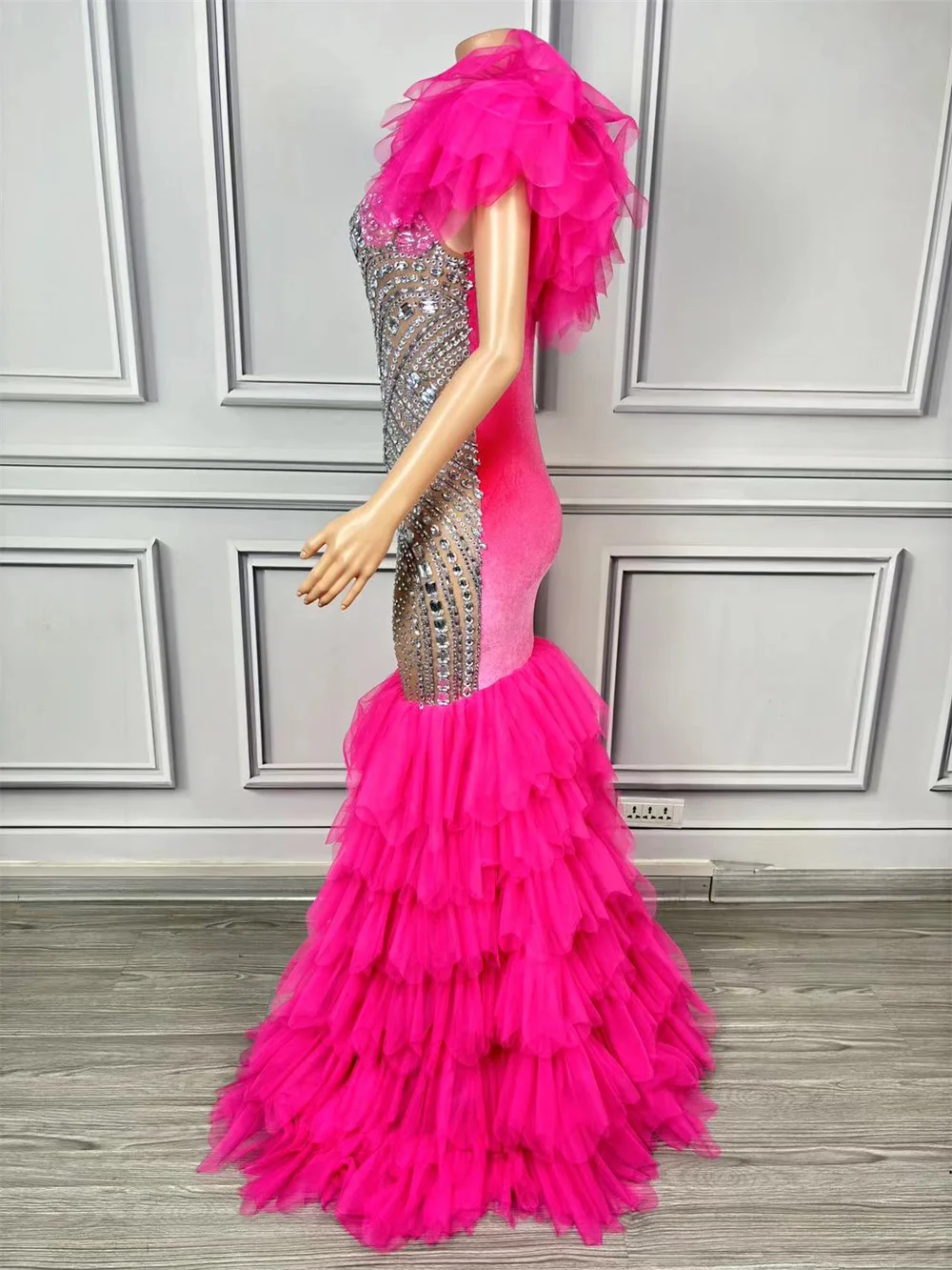 Elegant Rose Red Ruffle Floor Length Dress for Women Rhinestone Sparkly Dressy Singer Wedding Evening Stage Wear Drag Queen
