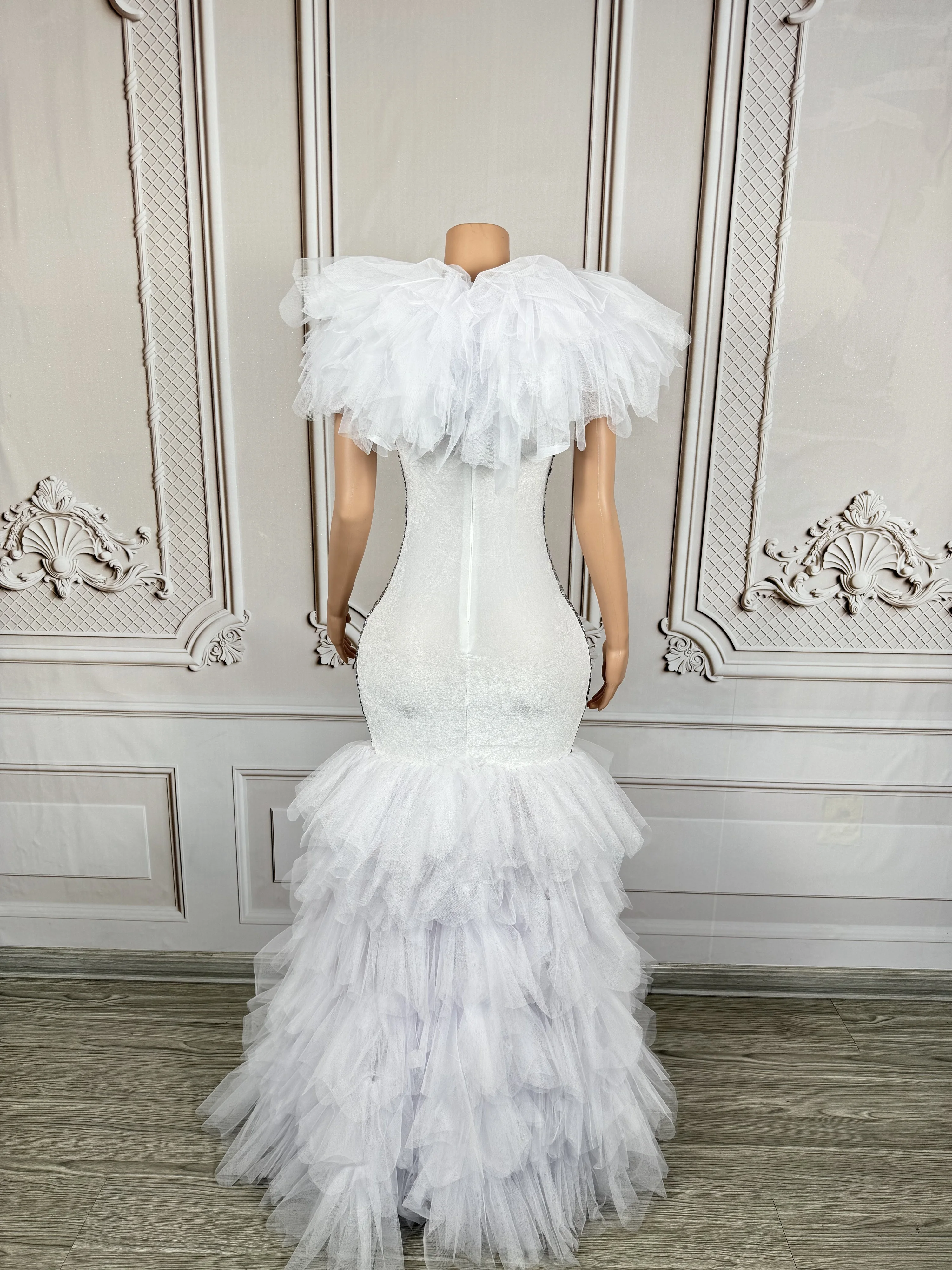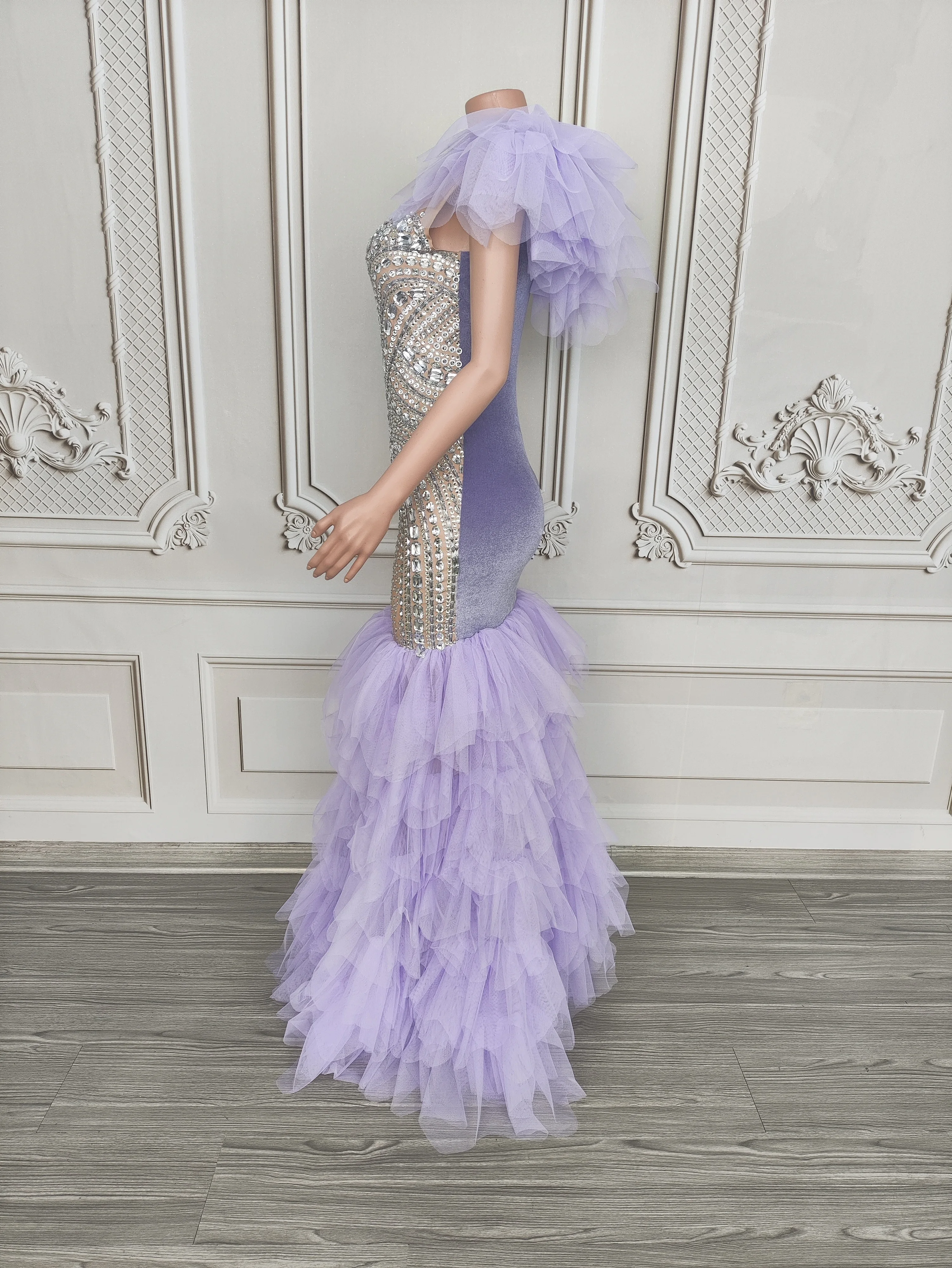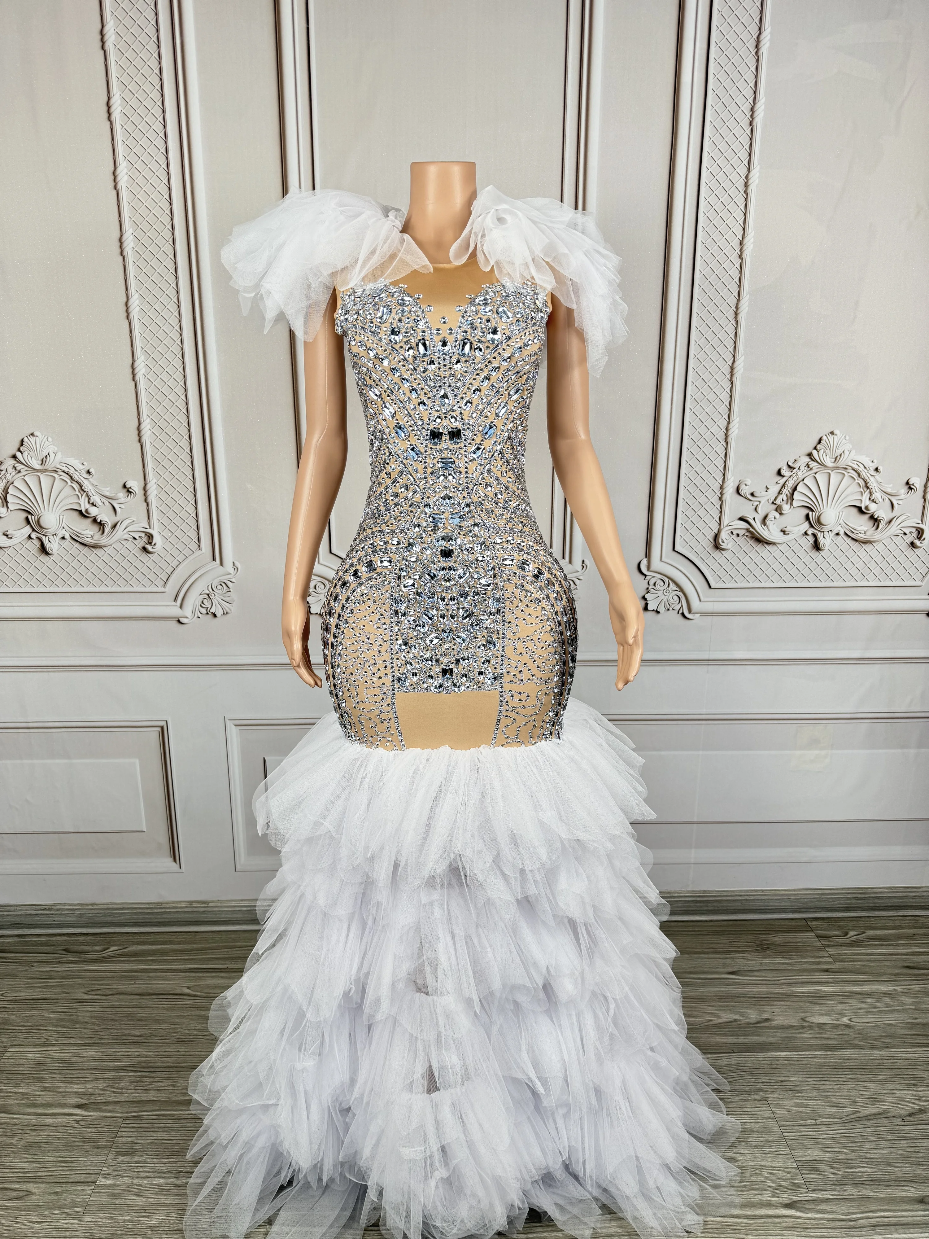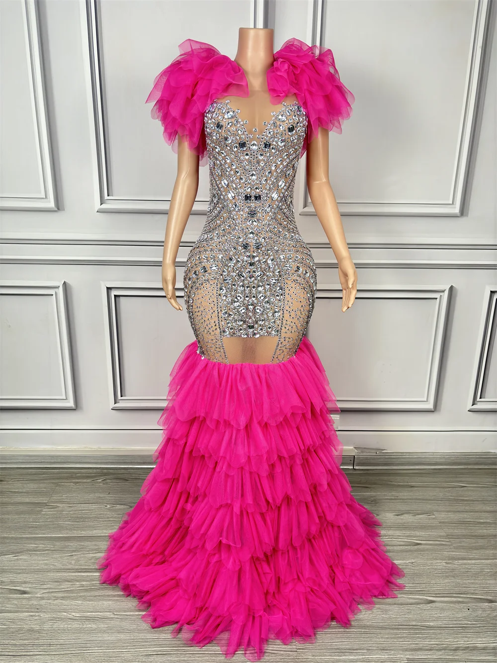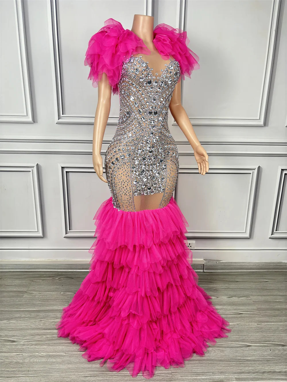 Elegant Rose Red Ruffle Floor Length Dress for Women Rhinestone Sparkly Dressy Singer Wedding Evening Stage Wear Drag Queen