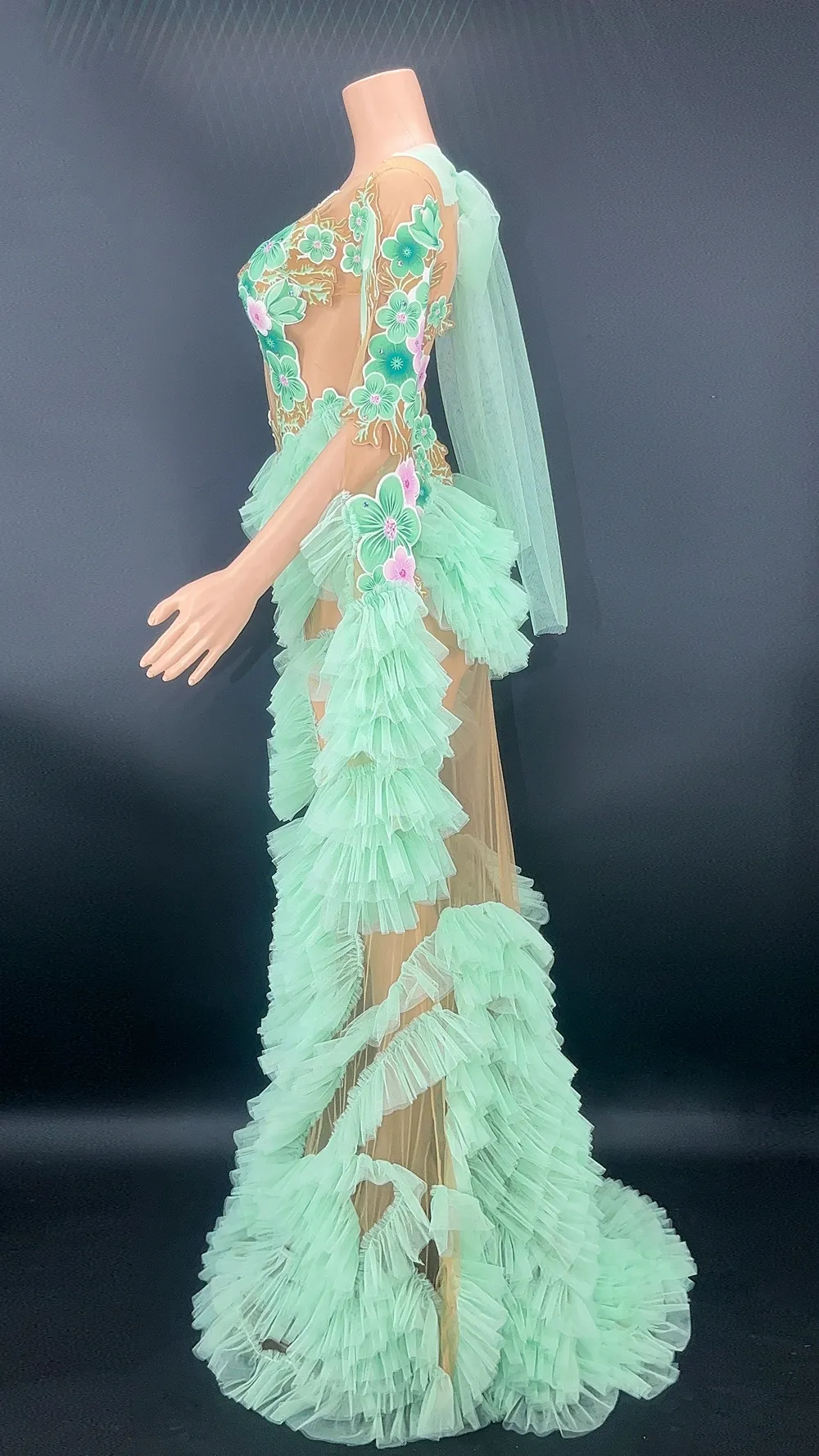 Evening Wedding Birthday Celebrate Gown Dress Sexy Flowers Mesh Transparent Long Train Dress Show Stage Wear Performance Costume