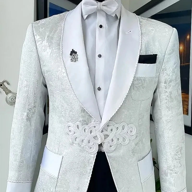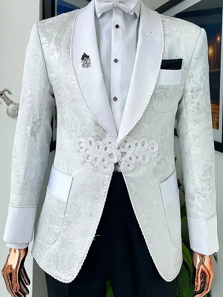 Experience luxury with this exquisite 2-piece custom men's suit featuring a blazer and pants. The Chinese button and satin fabric add a touch of elegance, while the wide lapel exudes sophistication, making it perfect for formal events, weddings, host attire, and special occasions. Available in plus sizes and tailored for a custom fit, this suit is a statement piece that will elevate your style and make you stand out at any formal event.