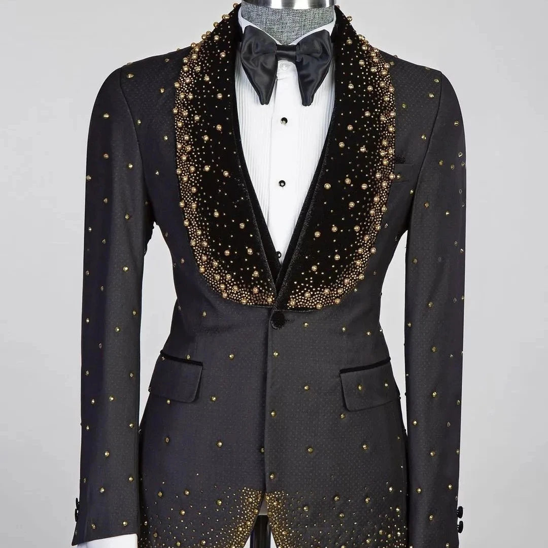 Exquisite Beads Pearls 3 Pieces Blazer Vest Pants Men Suits One Button Peaked Lapel Formal Prom Wedding Groom Plus Size Tailored
