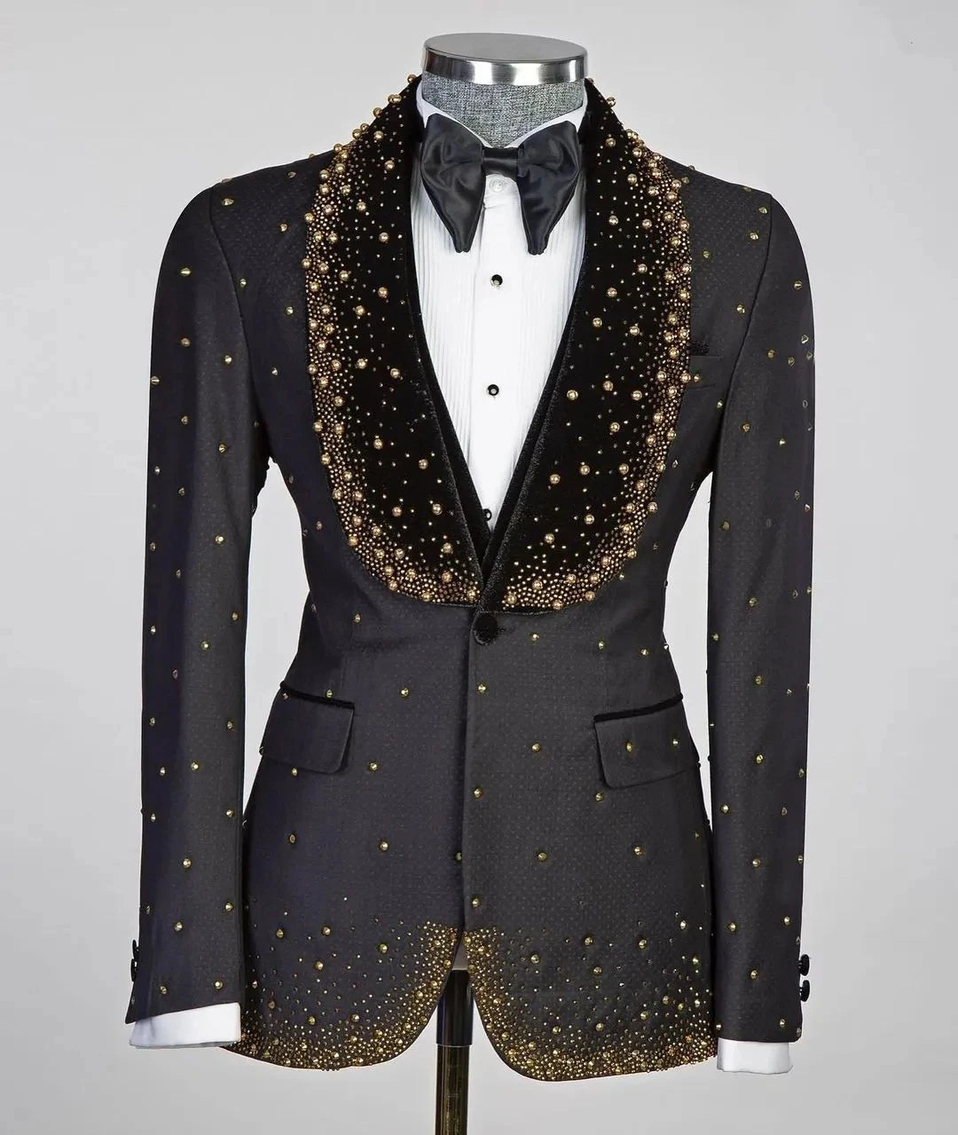 This exquisite 3-piece men's suit set features intricate beads and pearls embellishments on the blazer, vest, and pants. With a one-button design and peaked lapel, this suit is perfect for formal events, proms, weddings, and tailored for plus sizes. Ideal for a stylish groom or any special occasion.