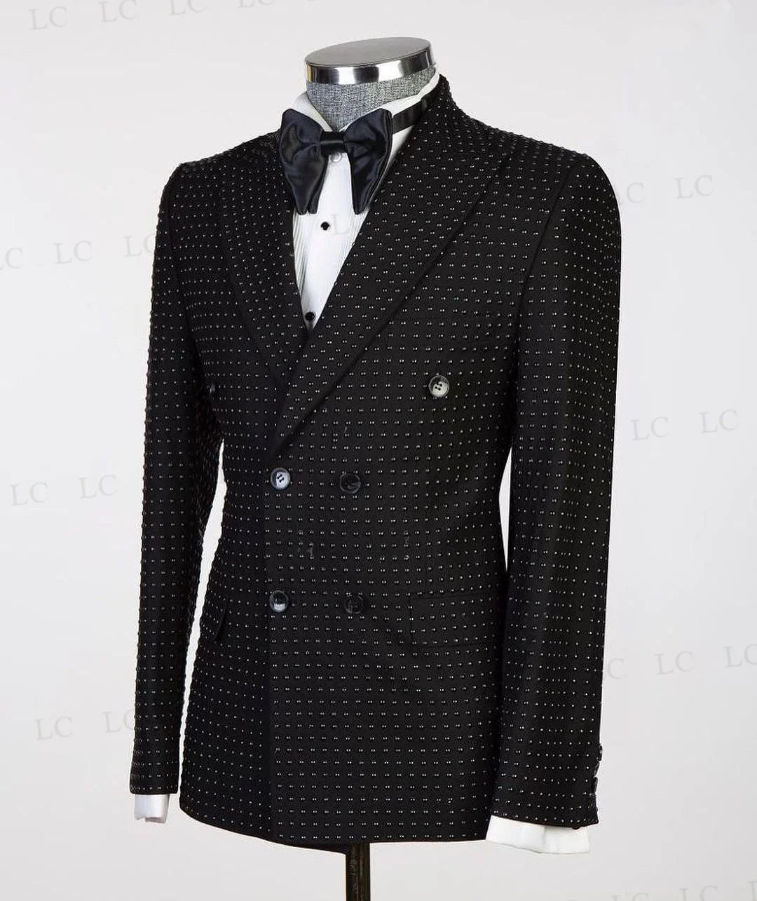 Make a statement with this exquisite 2-piece men's suit set in black, featuring a blazer and pants adorned with beadings, pearls, and exquisite buttons. Ideal for weddings, prom, formal events, and groom attire. Available in plus sizes and tailored for a perfect fit.
