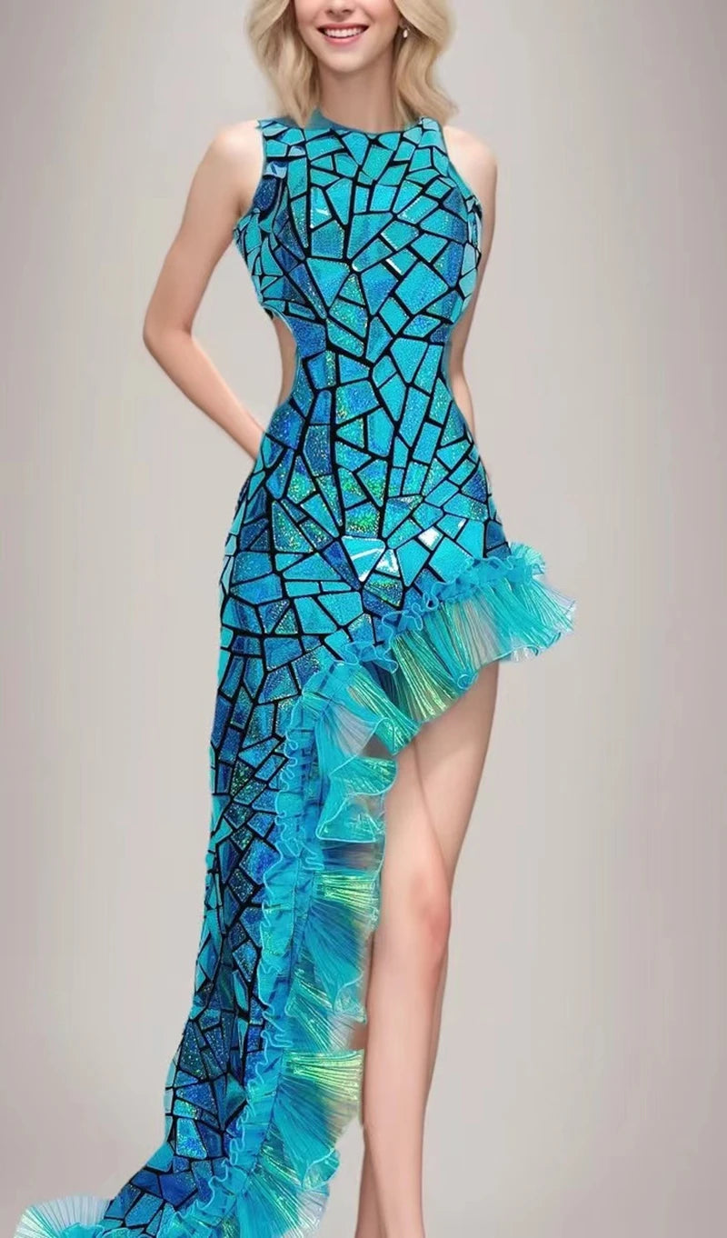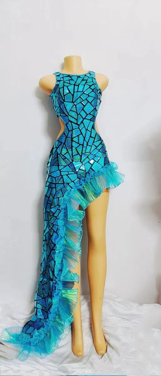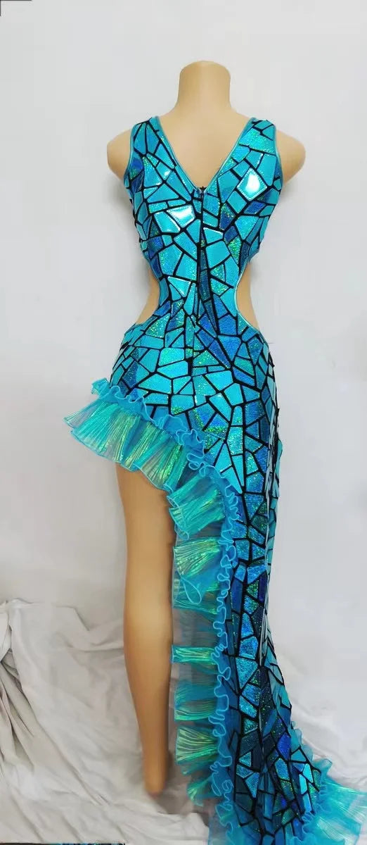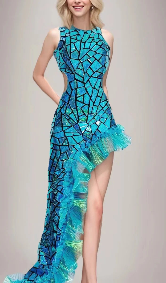 Elevate your stage presence with thisFantasy Blue Laser Mirror Sequin Irregular Floor-Length Dress, a couture-inspired performance gown designed for female singers, stage performers, and any entertainer who wants a dramatic, camera-ready look. Combining iridescent laser mirror sequins with an asymmetric, flowing silhouette, this dress is crafted to catch every light source — from spotlights and strobes to camera flashes — turning movement into a cascade of sparkling reflections.