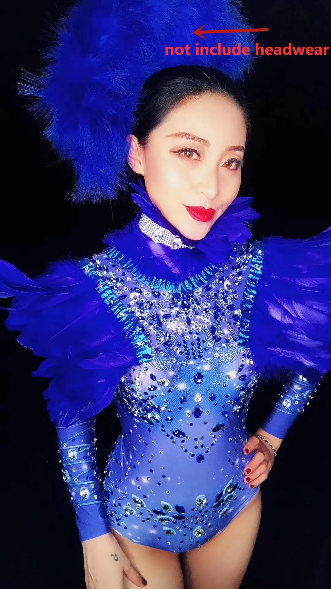 Fashion Blue Feathers Rhinestone Party Bodysuit Women Elastic Tights Crystal Dance Leotard Nightclub Show Singer Stage Costumes