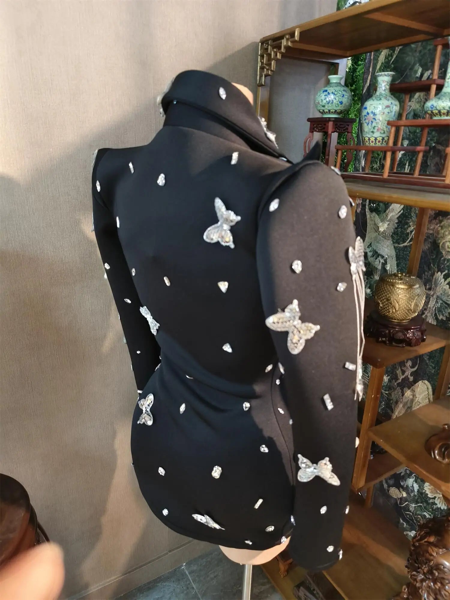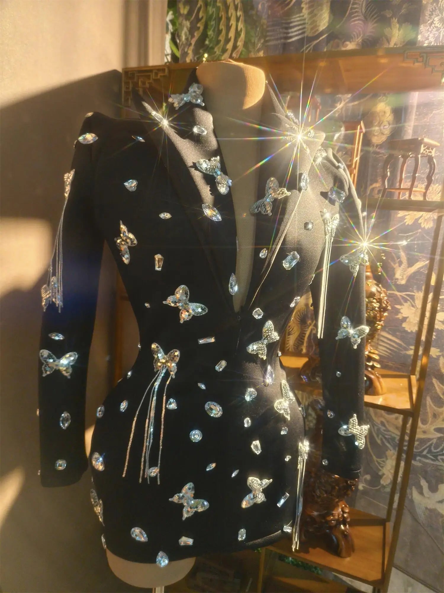 Add a touch of glamour and sparkle to your wardrobe with this stunning black butterfly crystal dress. Perfect for club parties, birthdays, performances, drag queen shows, or festival stages, this outfit is sure to make a statement.