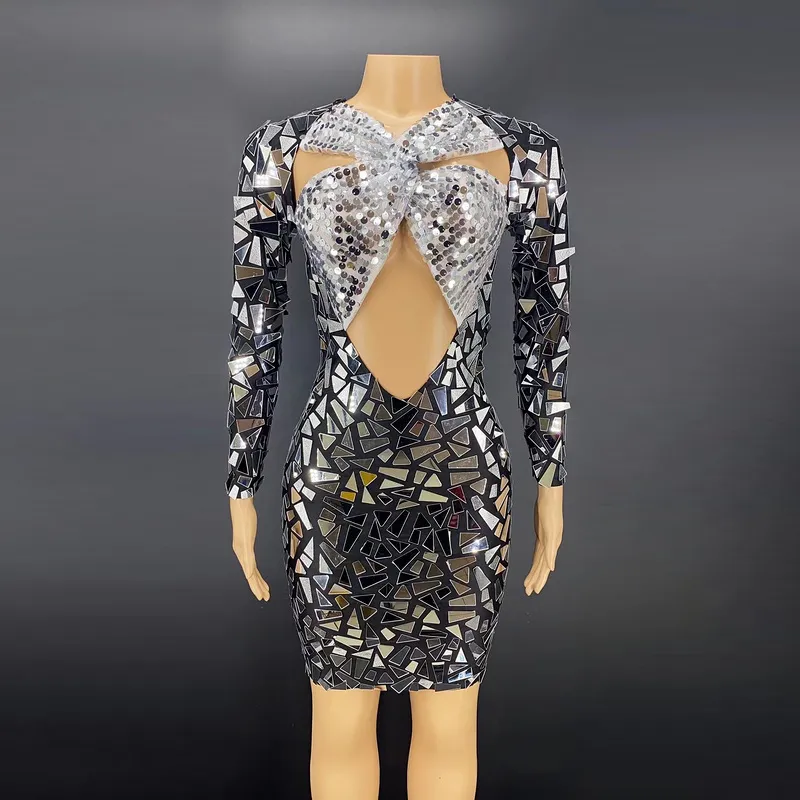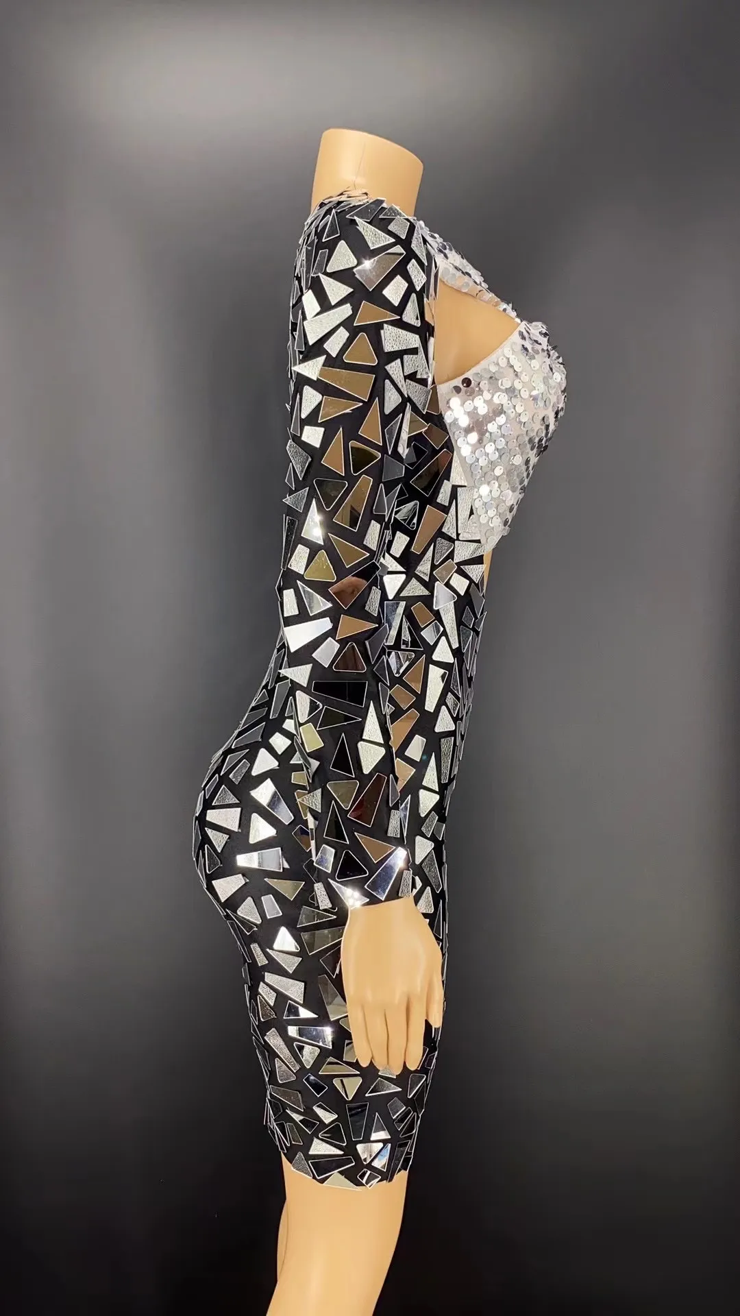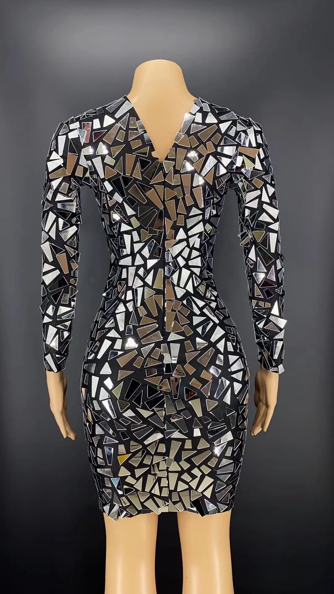 Women Sexy Flashing Mirror Sequin Mesh Black Dress Designer Clothing Singer Stage Show wear