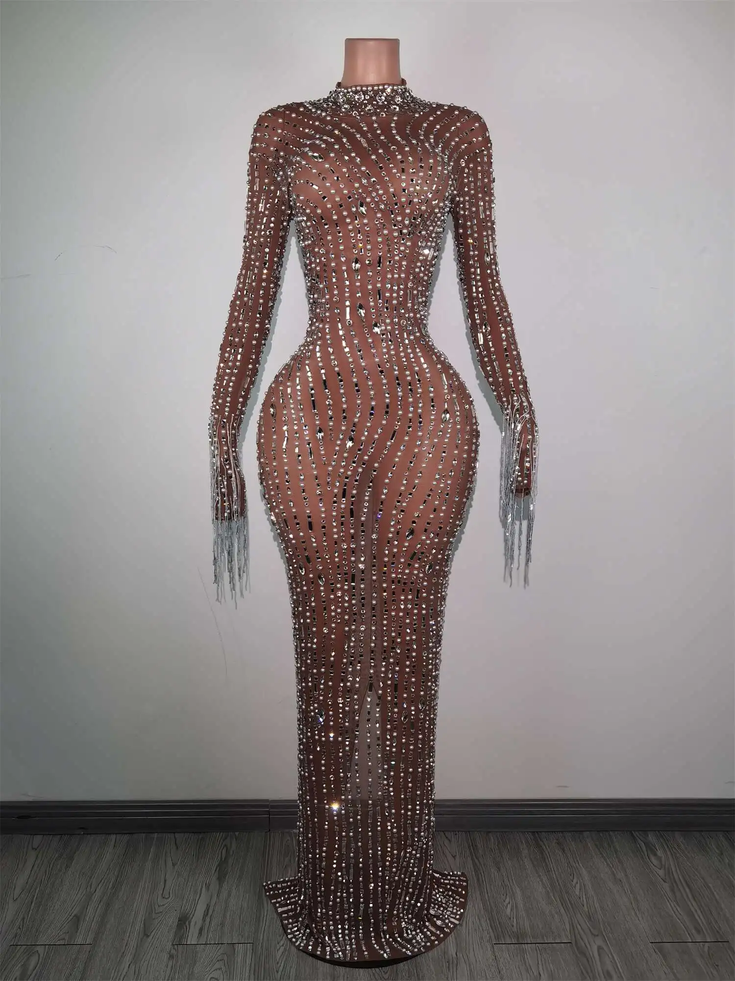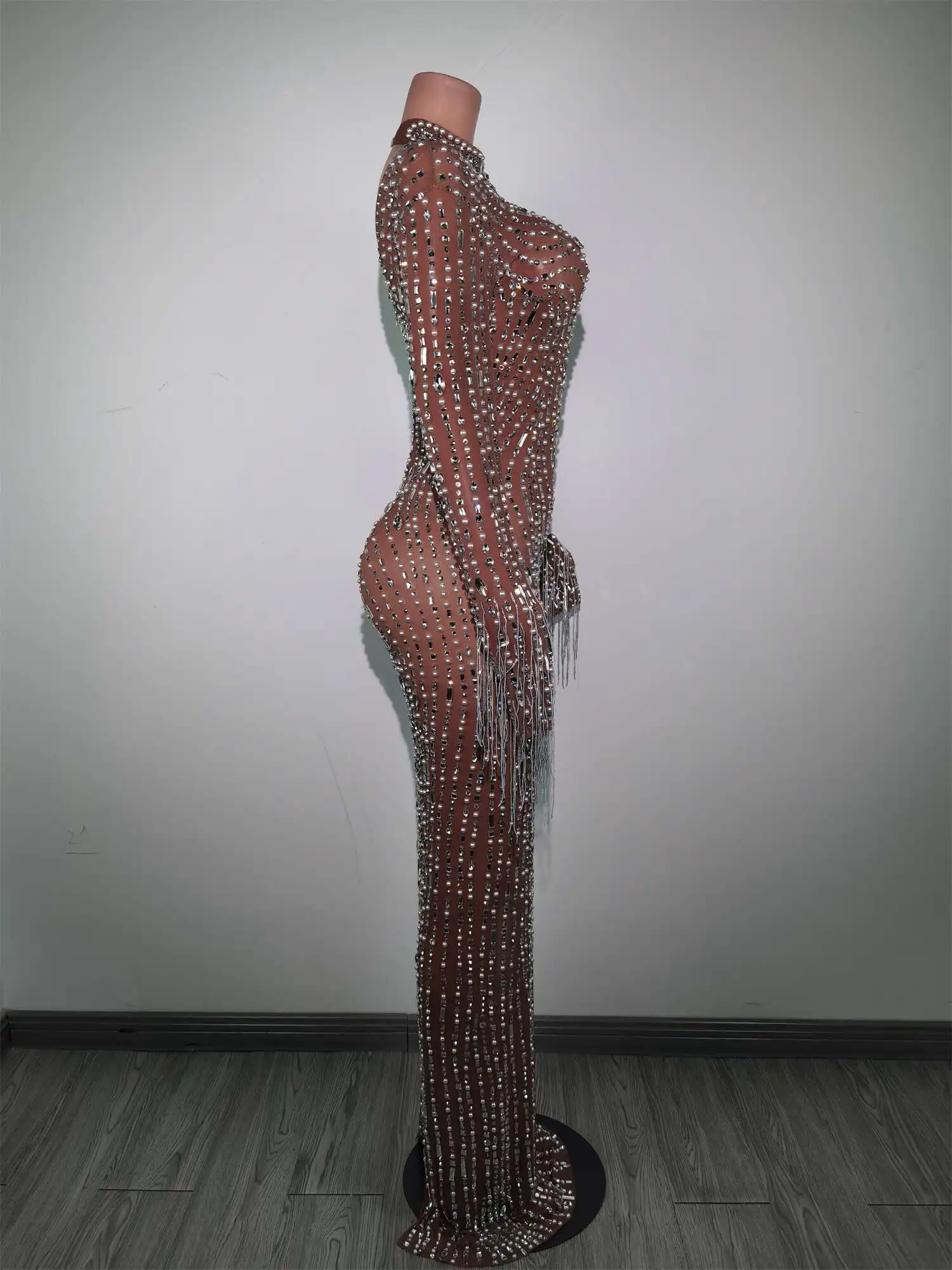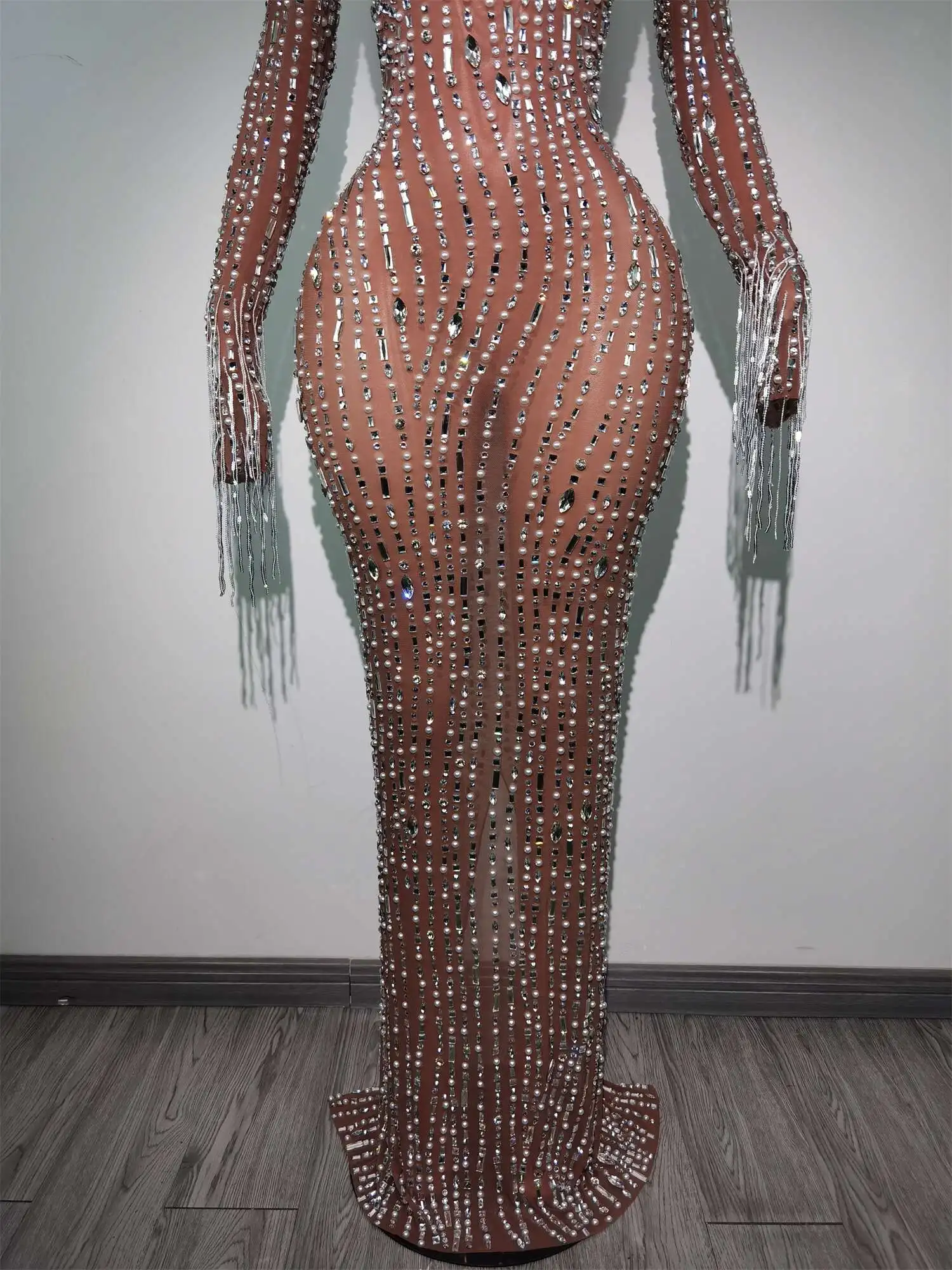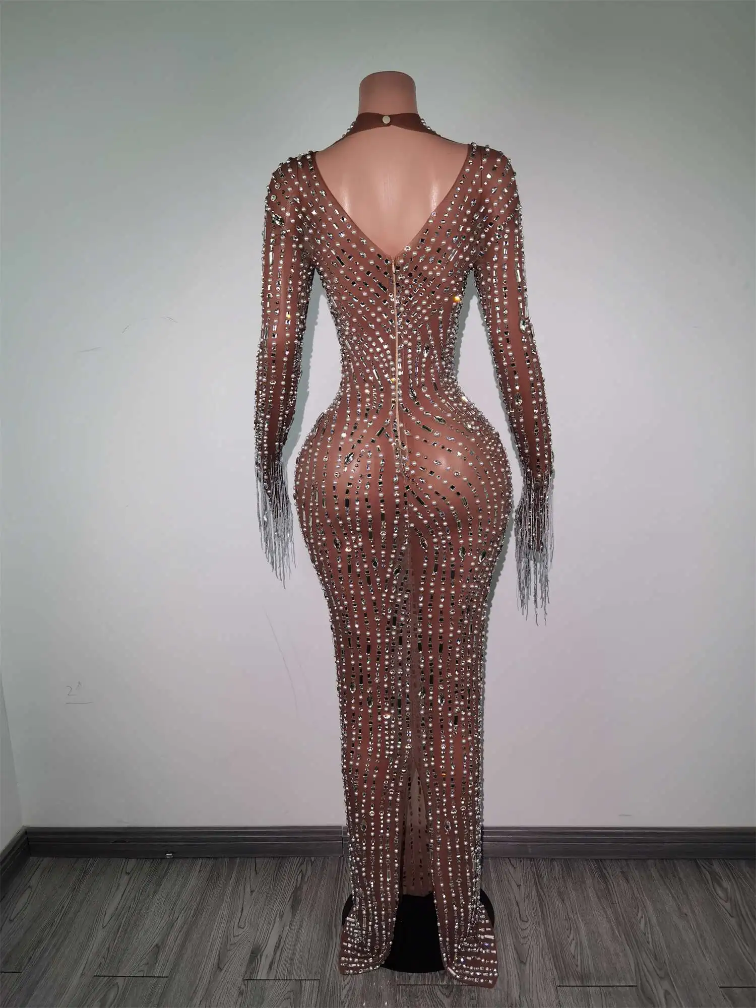 Fashion Glisten Diamonds Tassel Perspective Dress Woman Singer Bar Birthday Celebrate Party Costume Mesh Long Prom Gown Qingliu