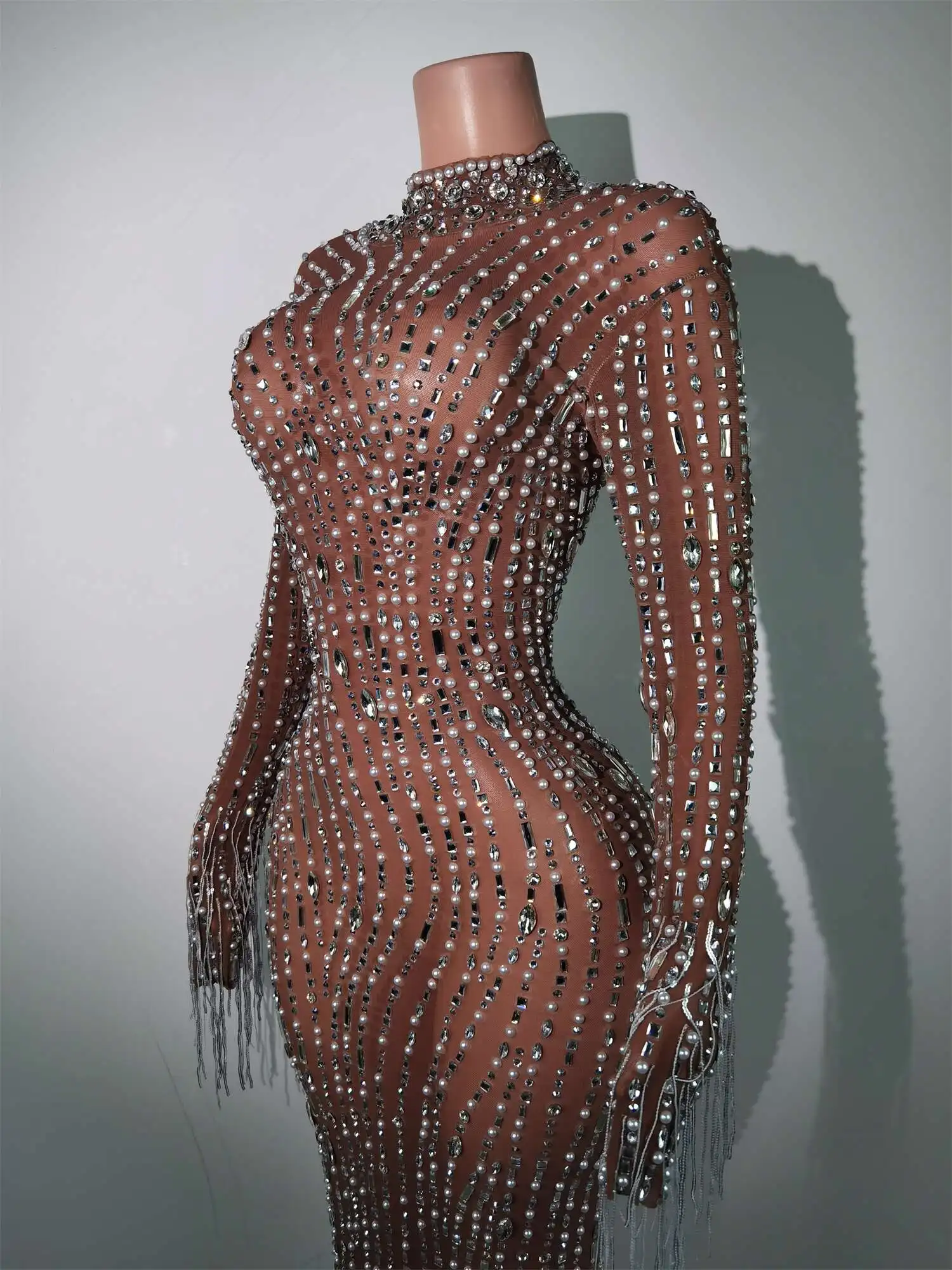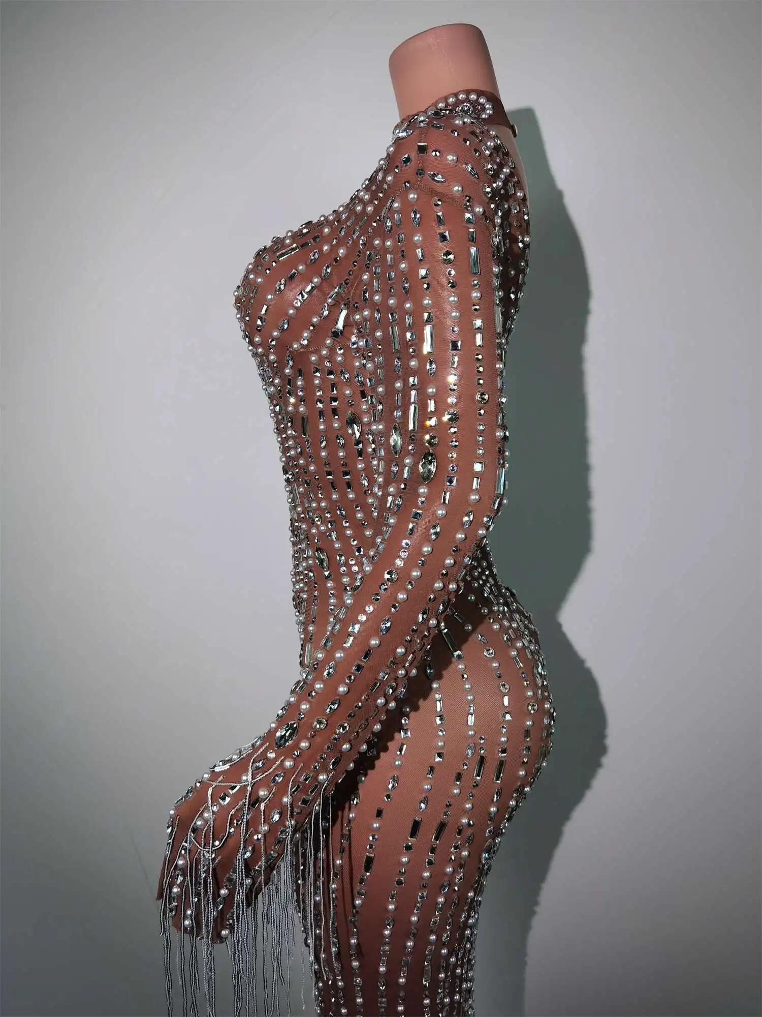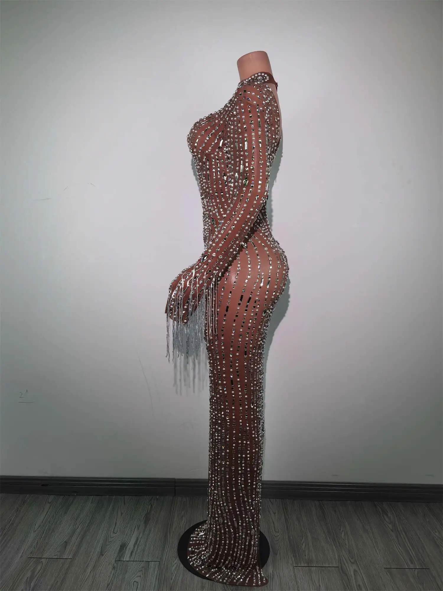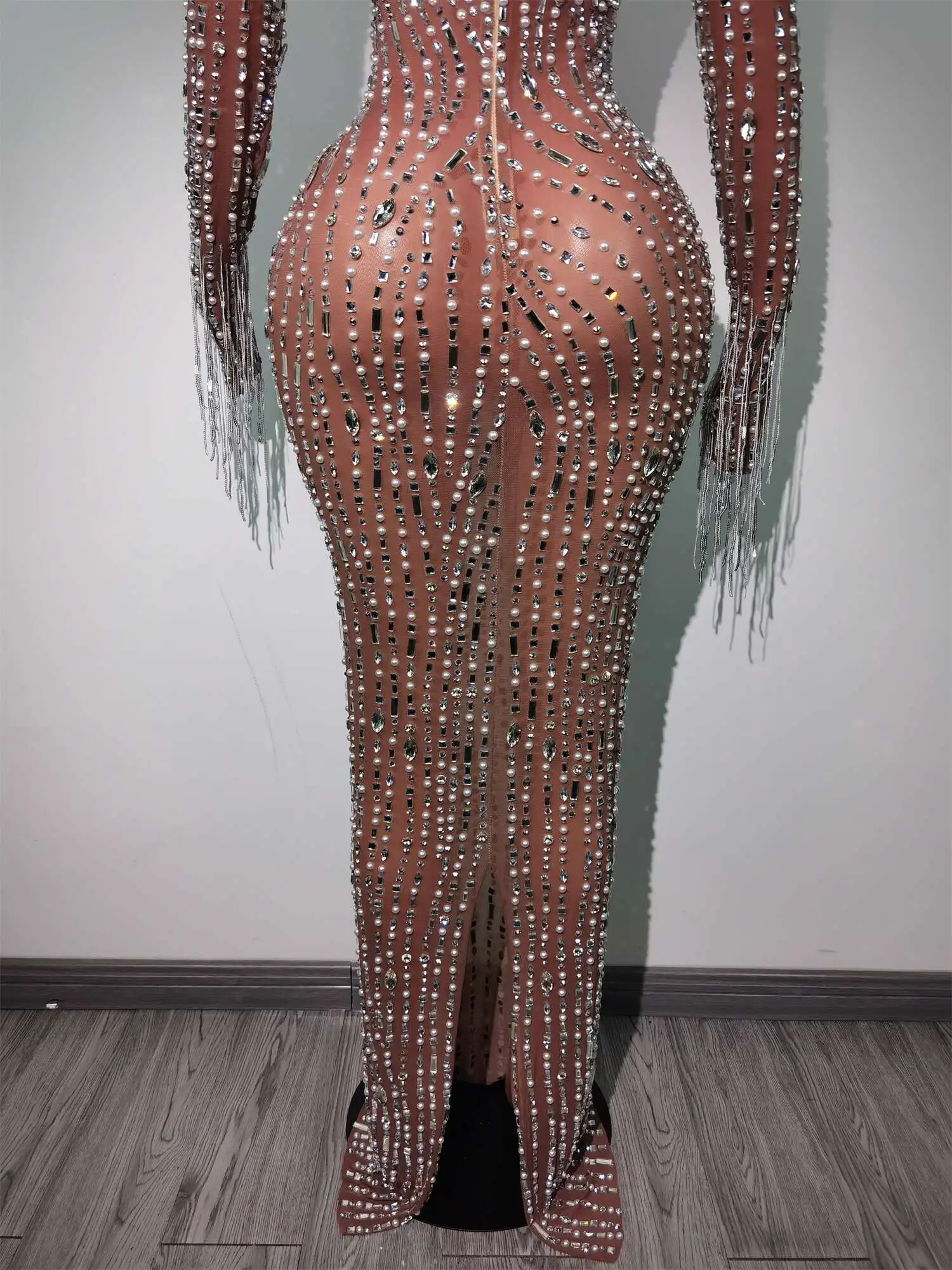 Fashion Glisten Diamonds Tassel Perspective Dress Woman Singer Bar Birthday Celebrate Party Costume Mesh Long Prom Gown Qingliu