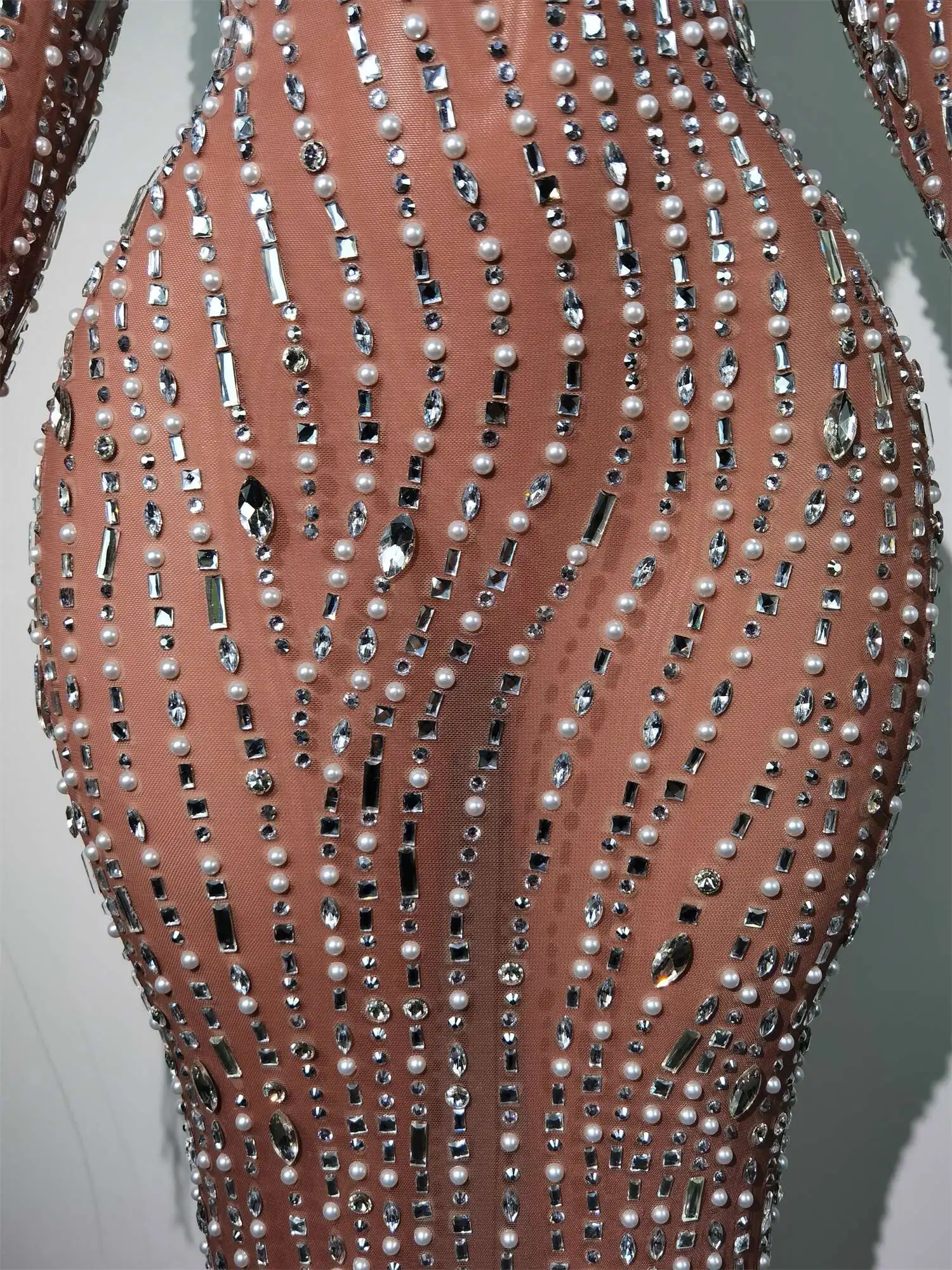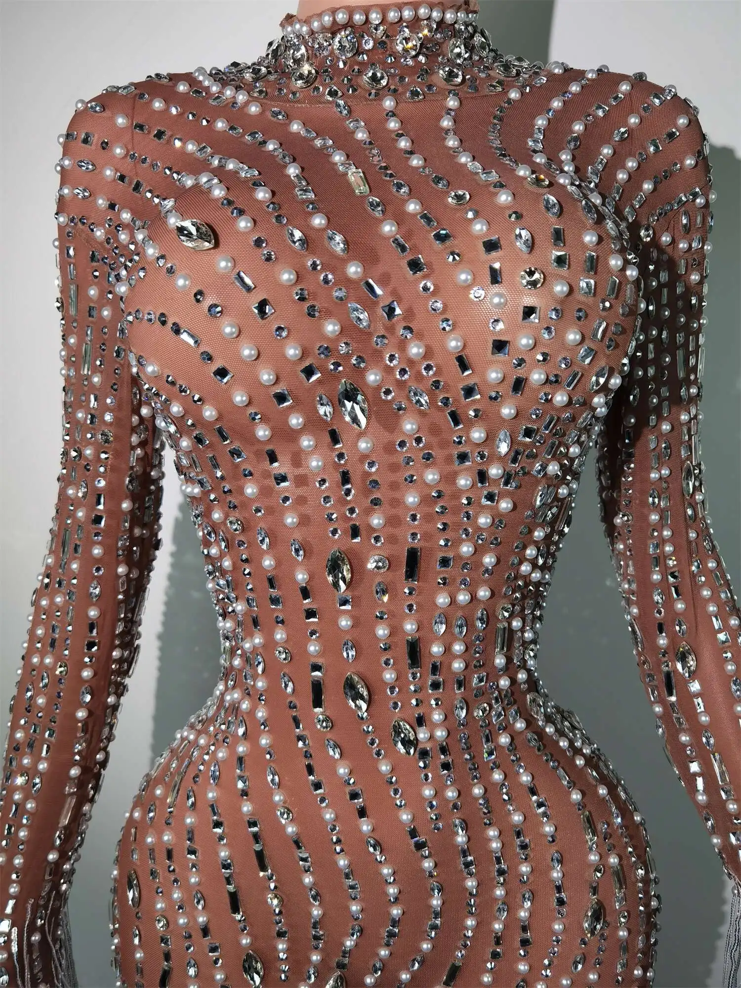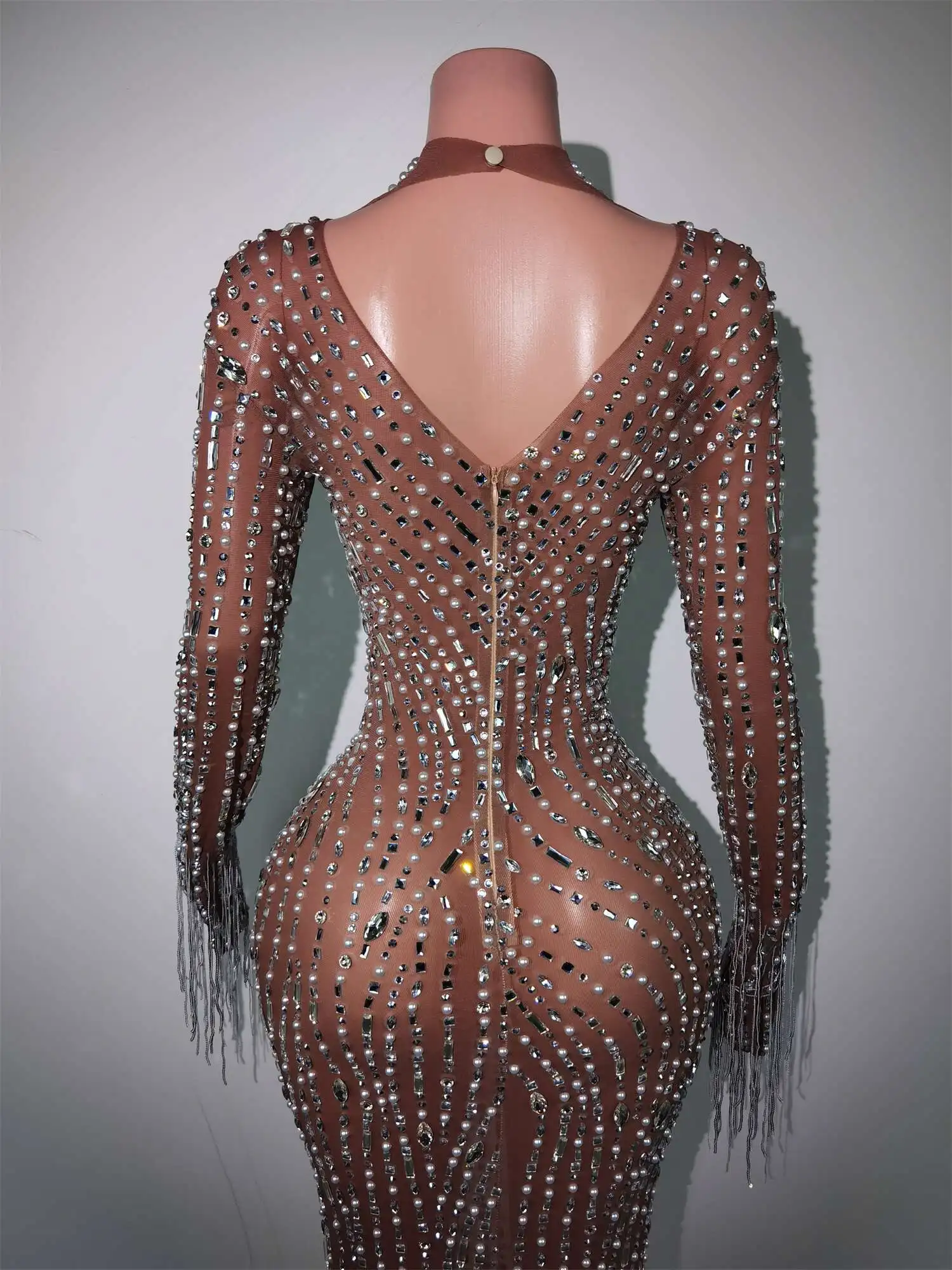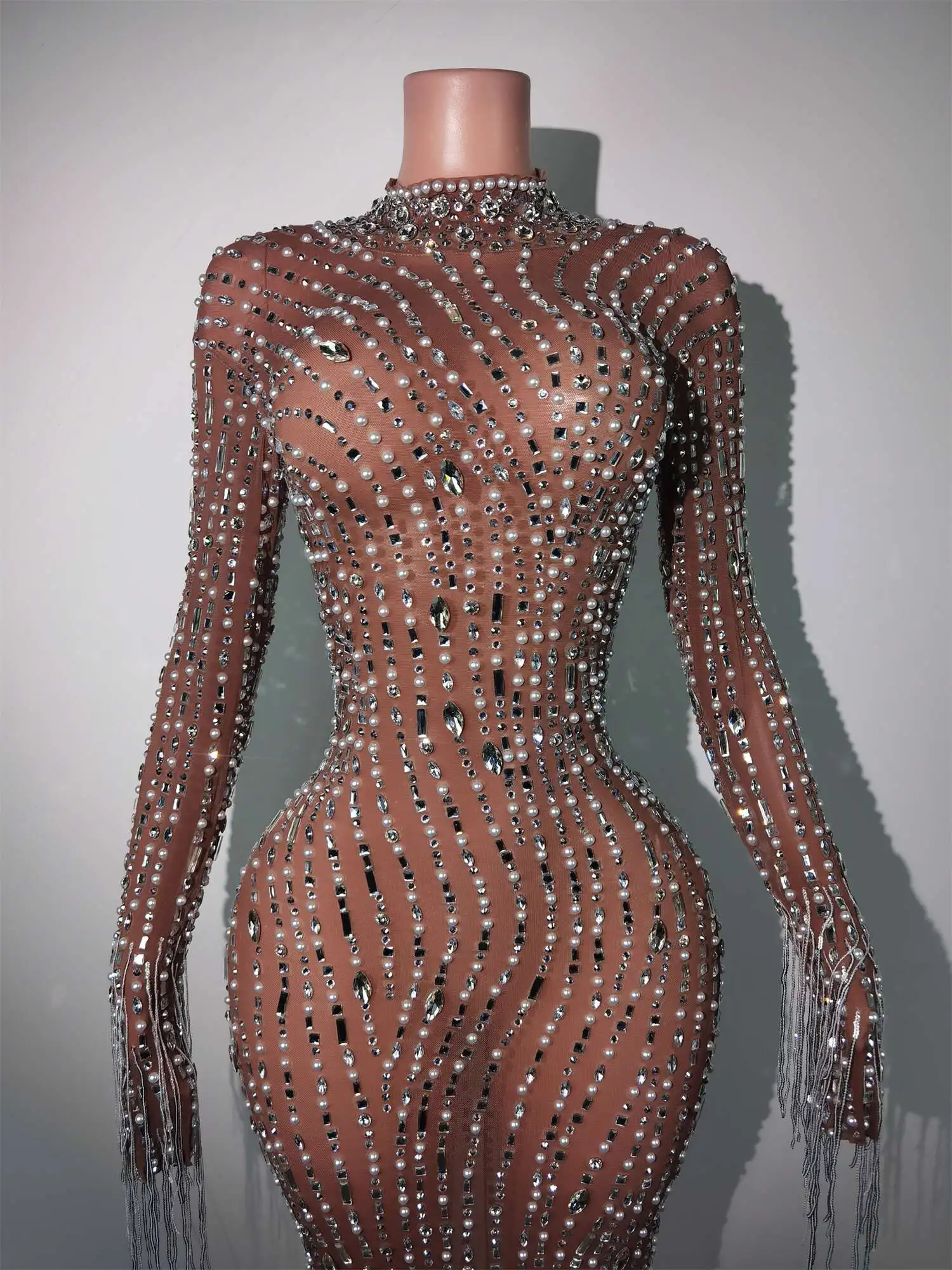 Fashion Glisten Diamonds Tassel Perspective Dress Woman Singer Bar Birthday Celebrate Party Costume Mesh Long Prom Gown Qingliu