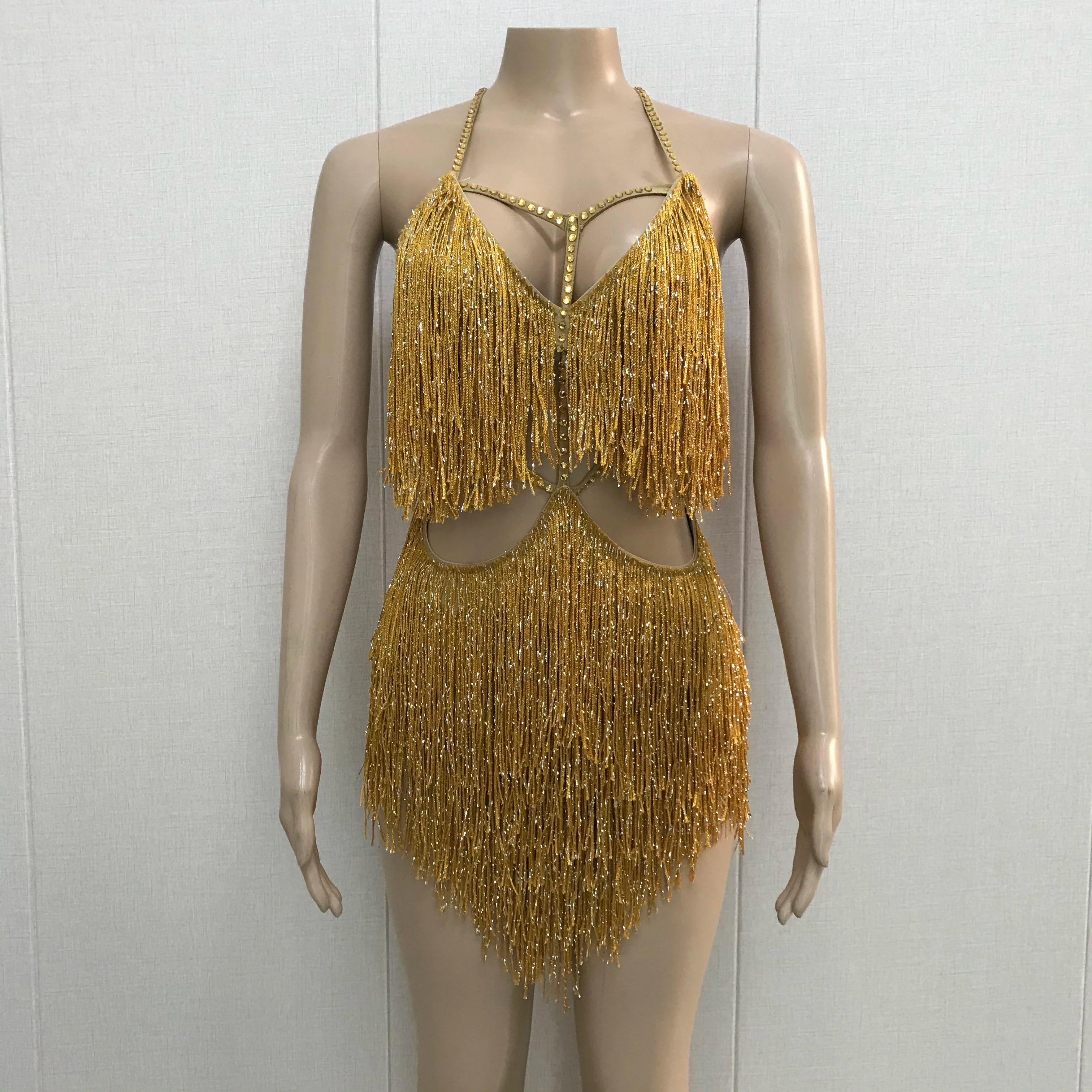 Gold Fringes Costume Outfit Tassel Dress Evening Birthday Party Dance Wear Nightclub Singer Performance CLothing