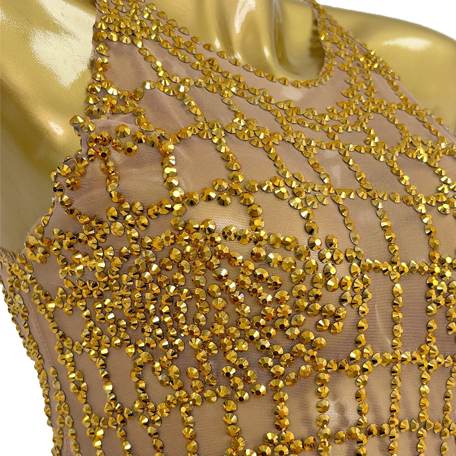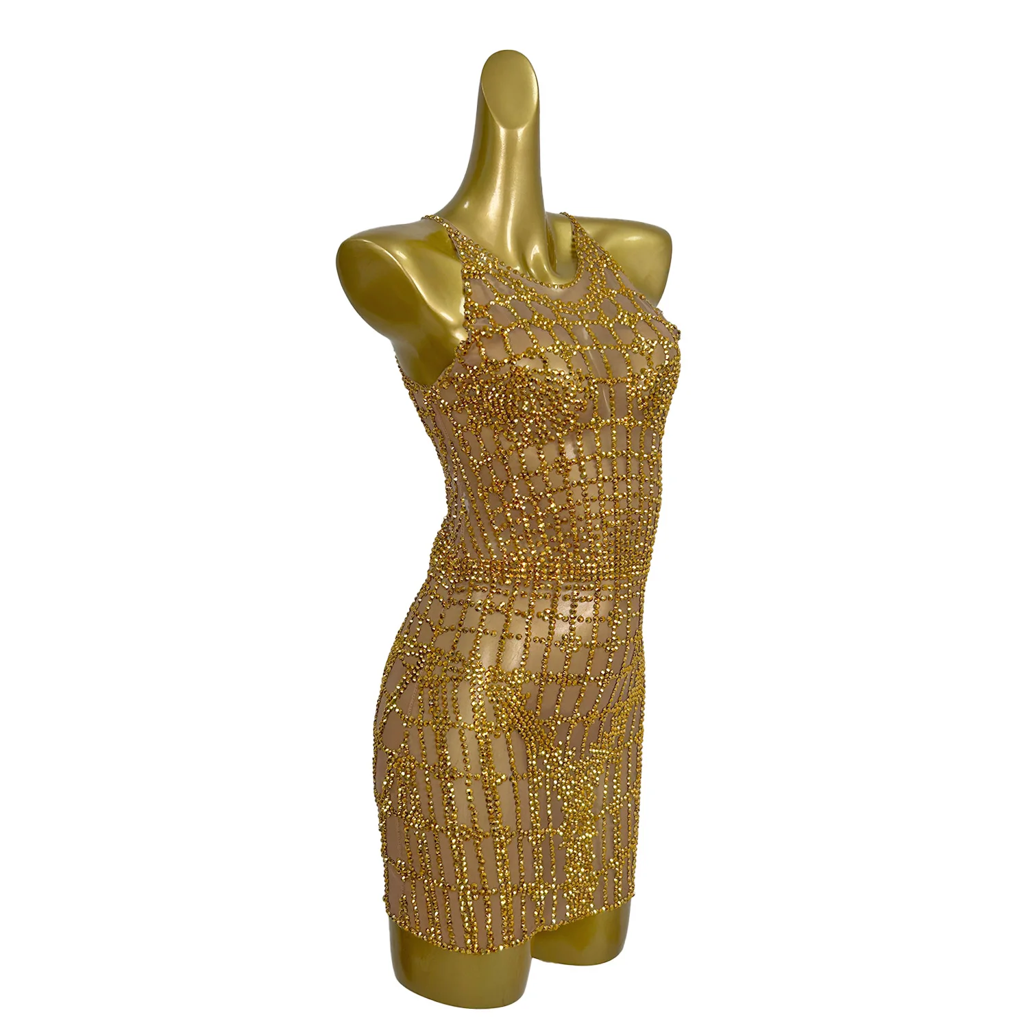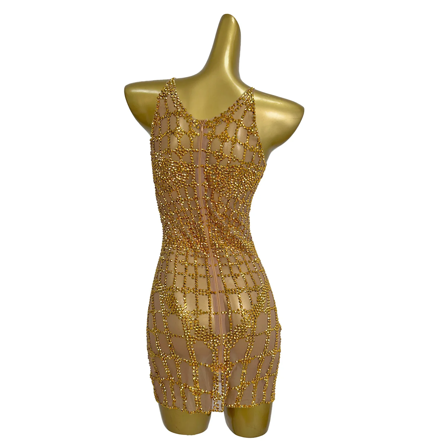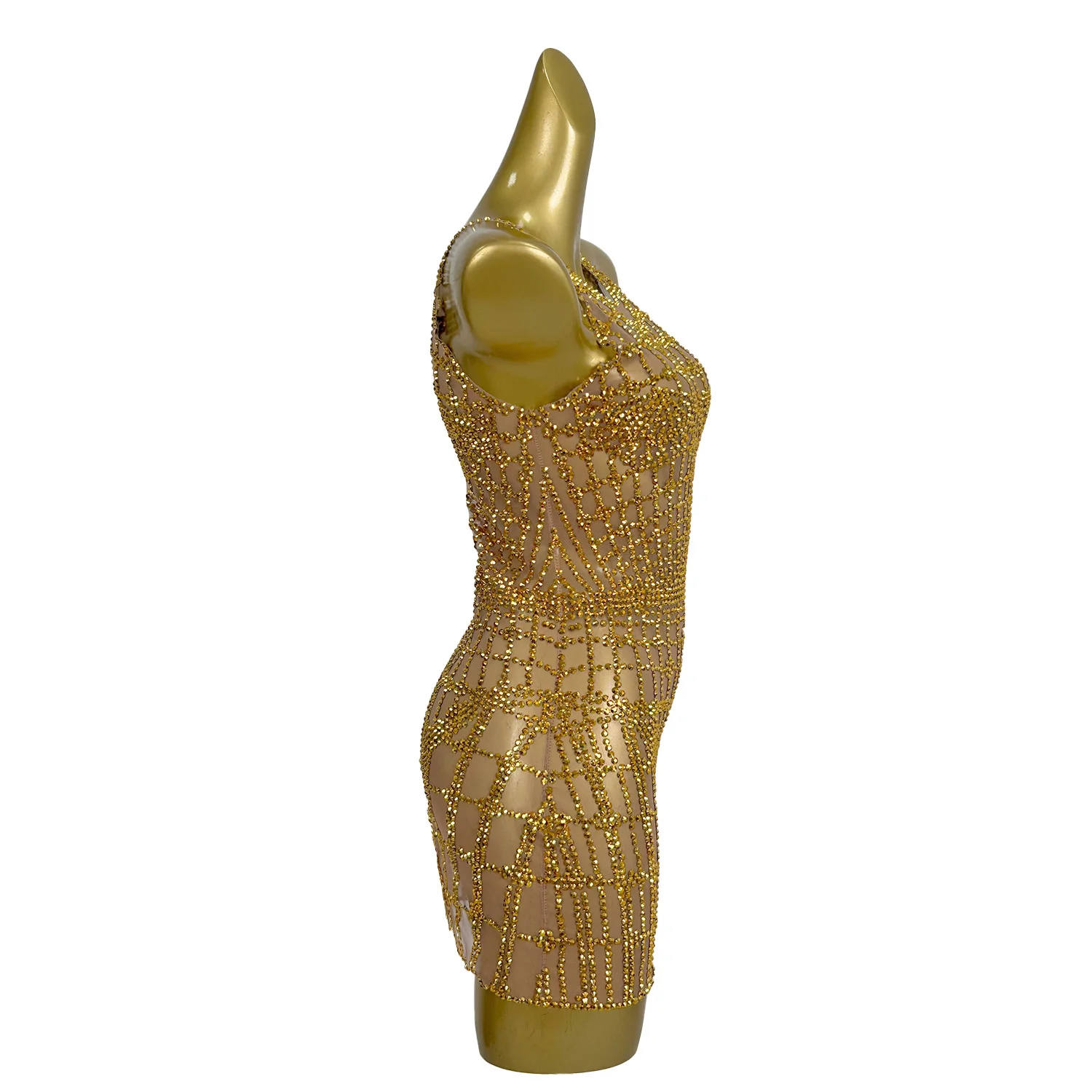 Fashion Gold Rhinestone Prom Club Mini Dresses Ladies Stage Dance Dress Plus Size Sexy Bodycon Casual Dresses for Women Qipan