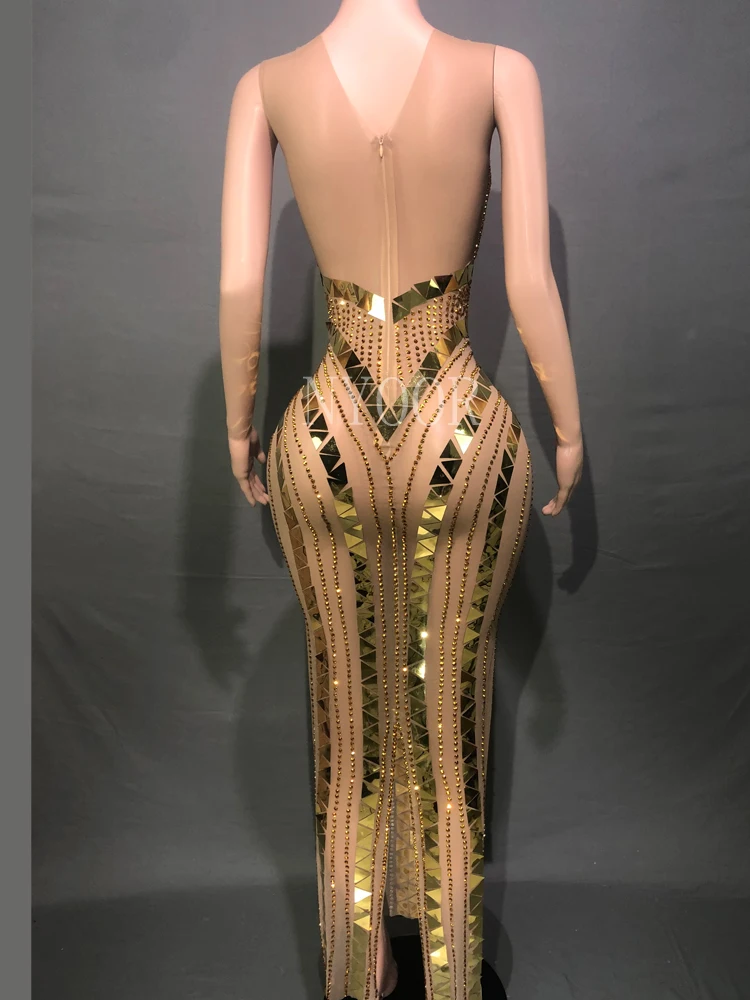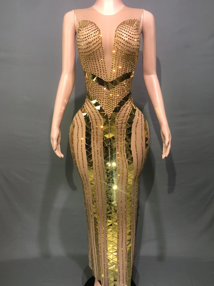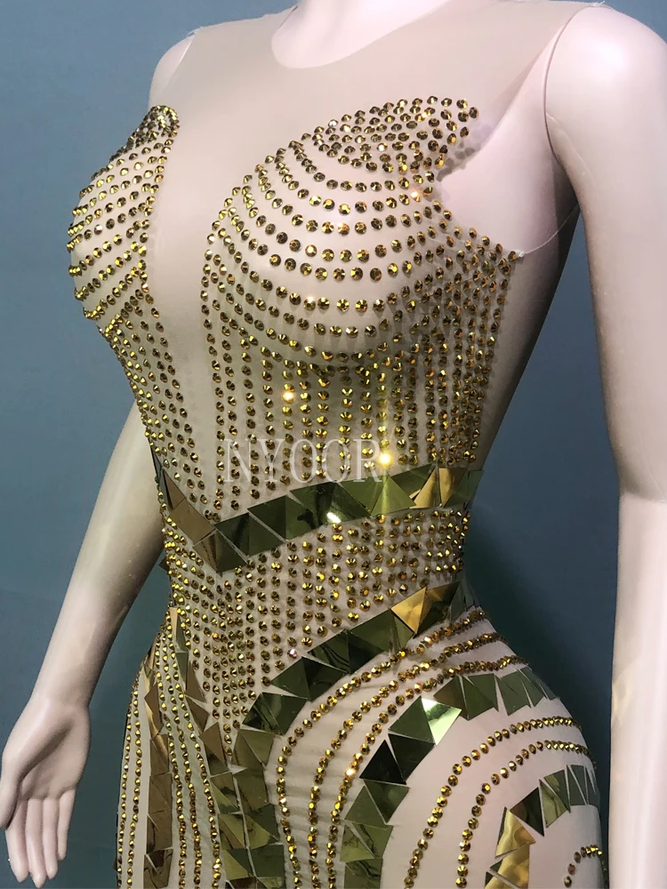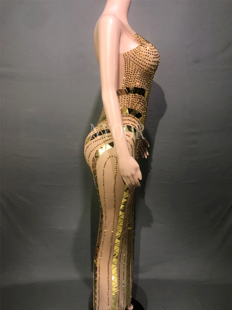 Fashion Golden Rhinestone Glitter Women Long Dress Sleeveless Transparent Mesh Petticoat Party Bar Show Wear Stage Costume