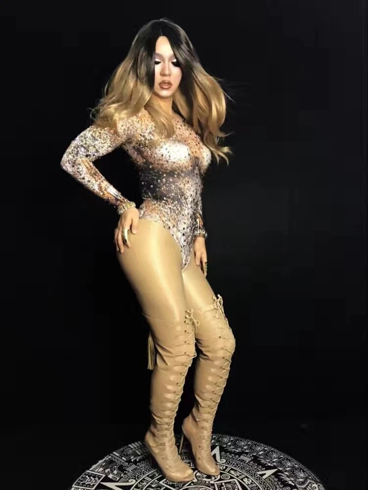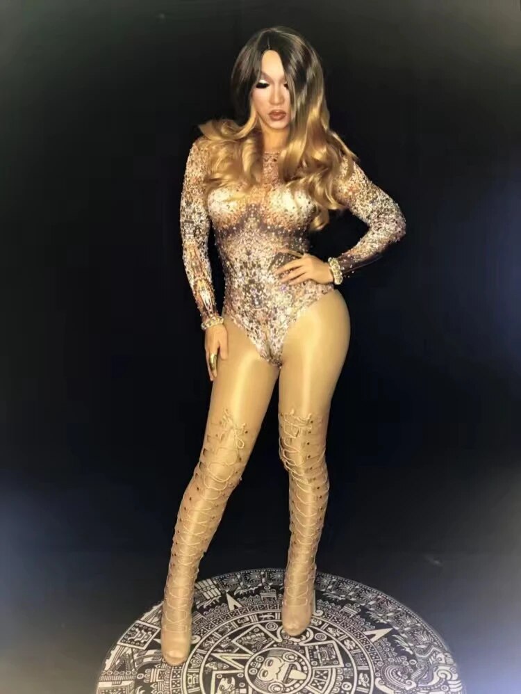 Fashion Nightclub Party Rhinestone Bodysuits Women Sexy Elastic Tights Crystal Jumpsuits DJ Jazz Singer Leotard Stage Costumes
