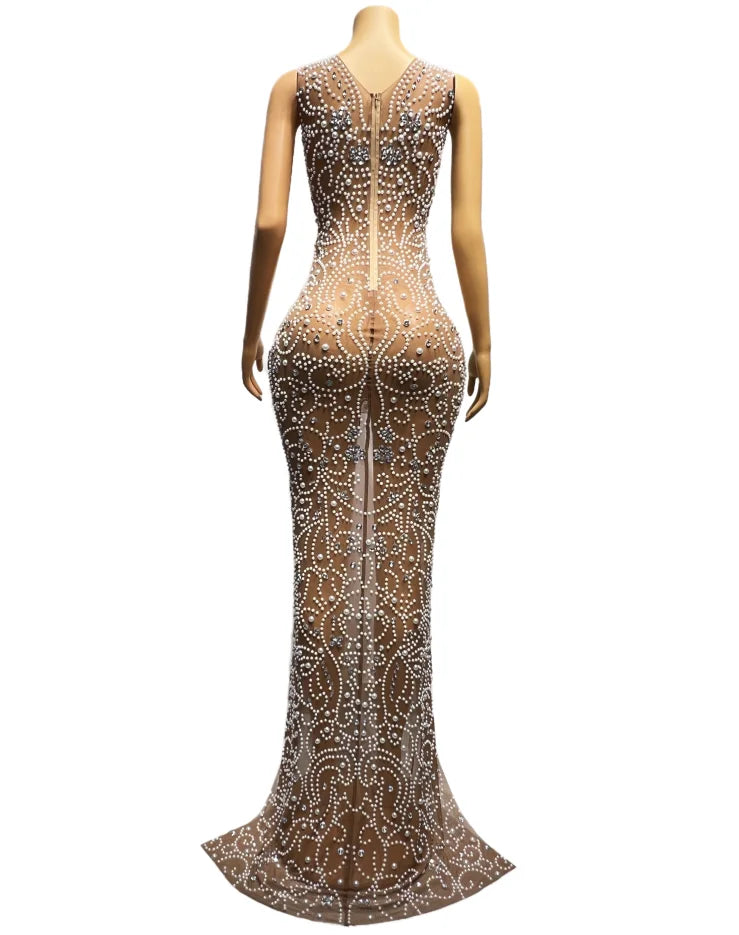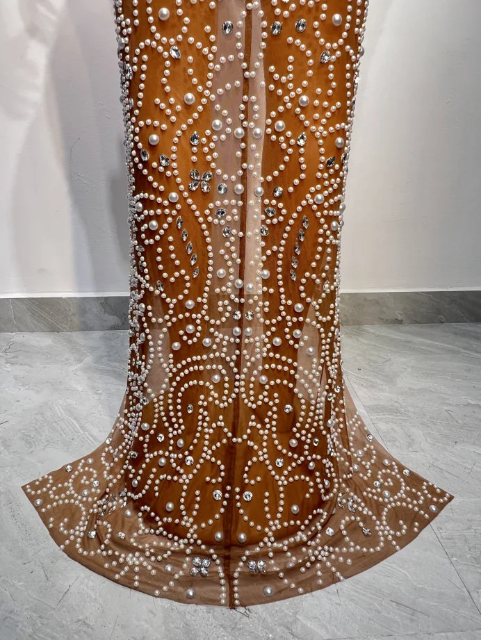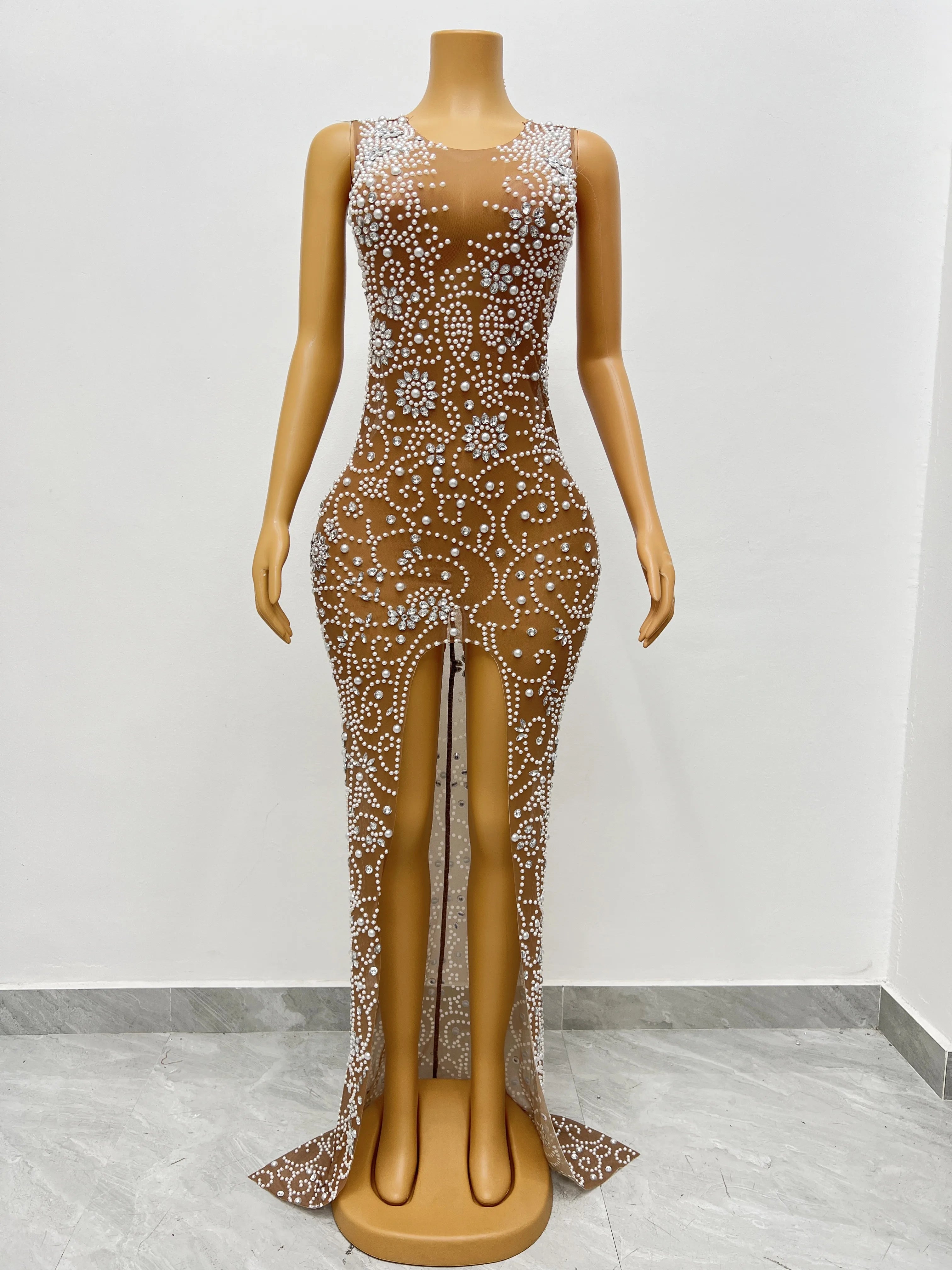 Dress to impress with this Pearls Rhinestones Transparent Tail Dress, an elegant choice for evening events, birthday celebrations, weddings, and as a stunning costume for dancers.