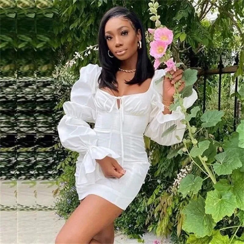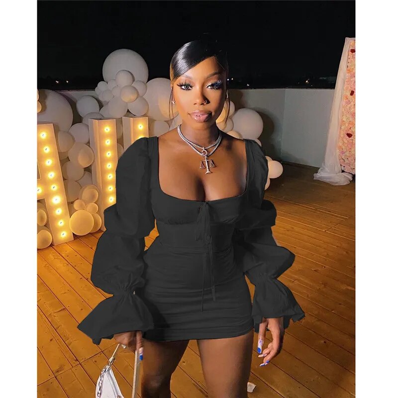 Fashion Puff Sleeve Mini Bodycon Dress Autumn Winter Solid Square Collar White Black Party Clubwear Female Dress Vestidos