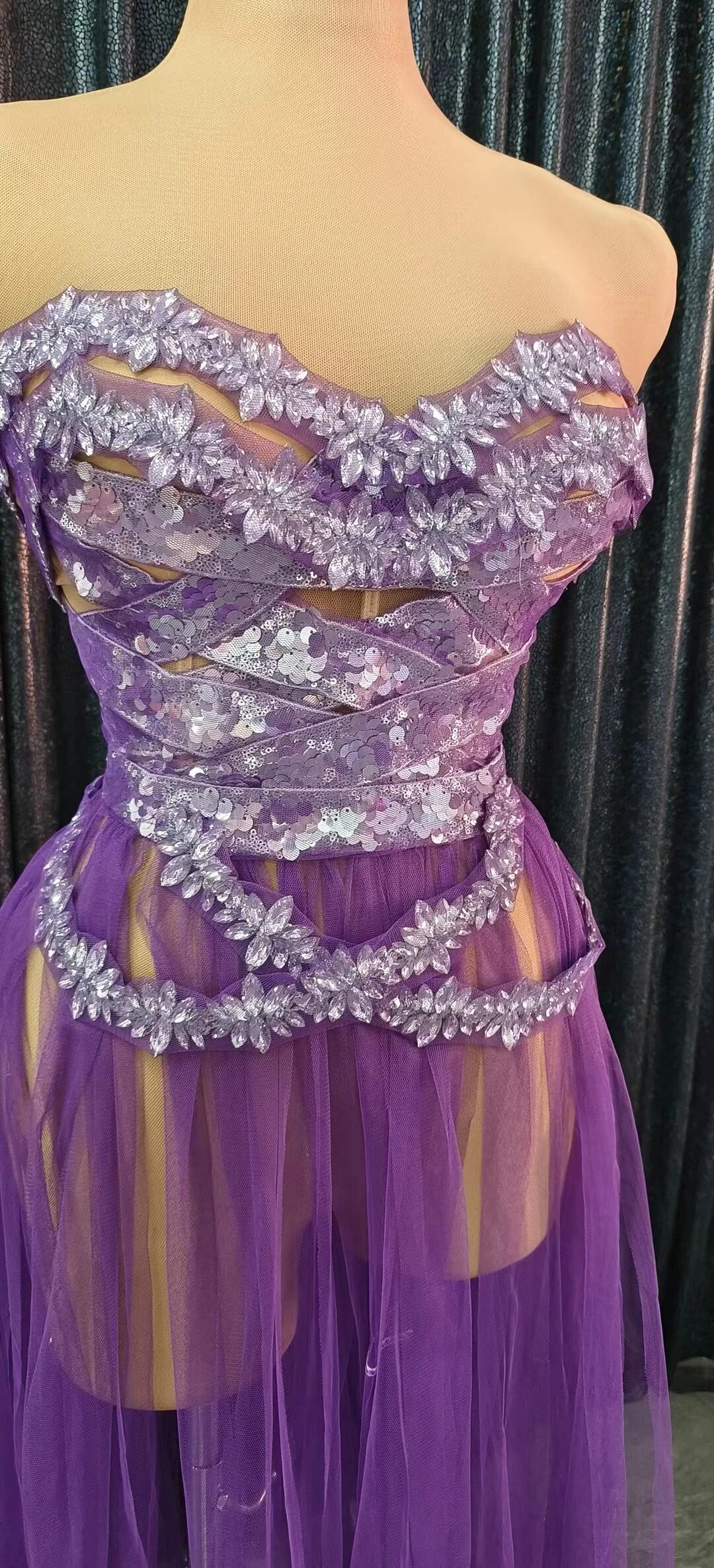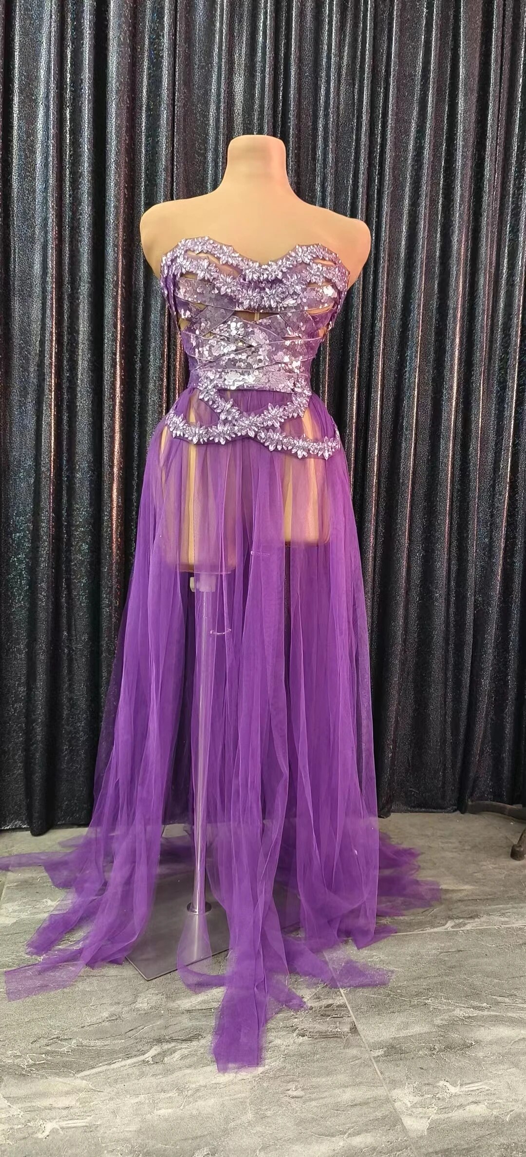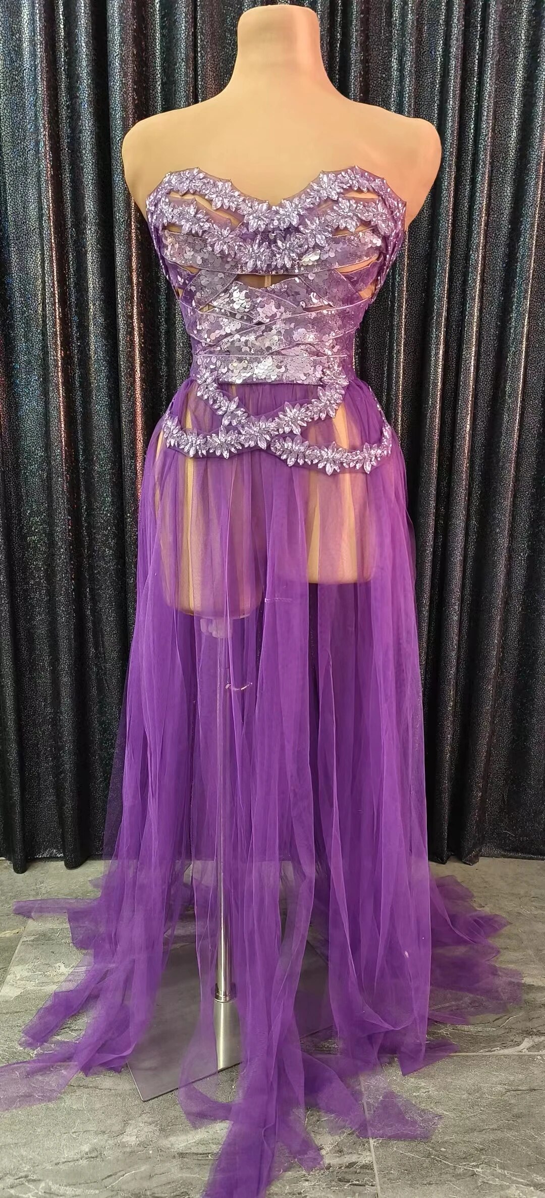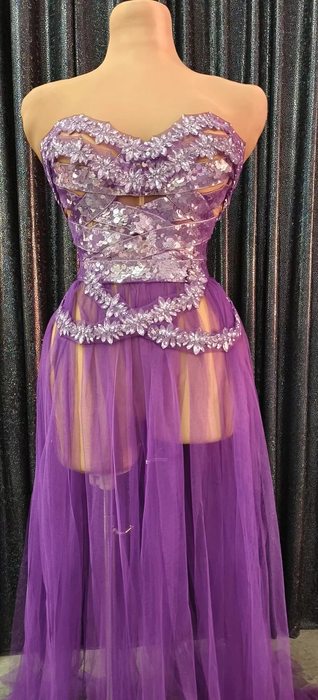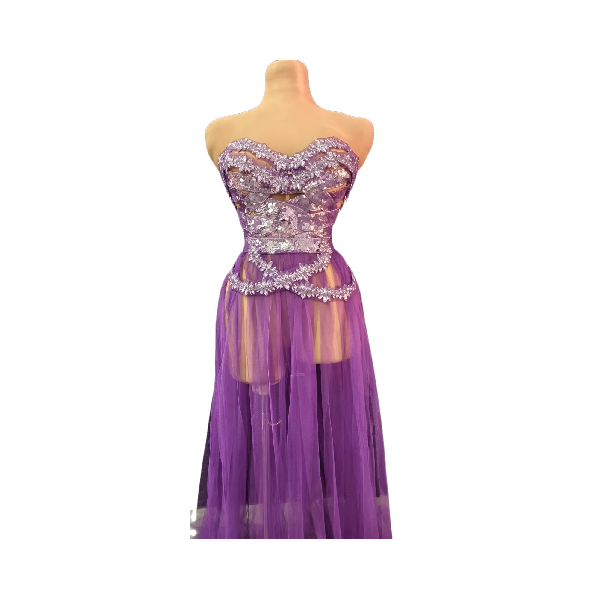 Fashion Purple Rhinestone Dress Sequins Crystasexy Strapless See Through Mesh Party Clubbirthday Wedding Drag Queen Costumes