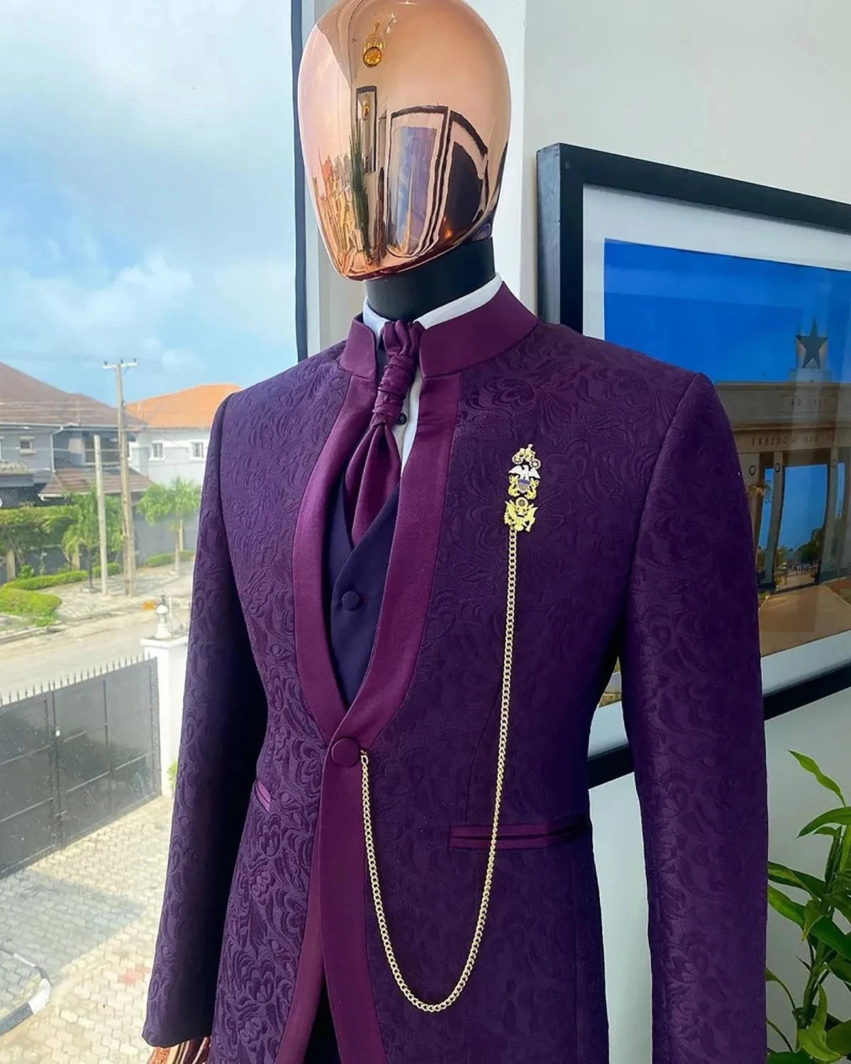 This fashionable men's suit set features a slim-fit design in 3 pieces, including a blazer, vest, and pants. The one-button closure and no lapel create a modern and sleek look, perfect for formal events like proms, weddings, and work wear. Tailored for the fashion-forward groom, this suit is available in plus sizes for a comfortable and stylish fit. Stand out with this contemporary and tailored suit for any occasion.