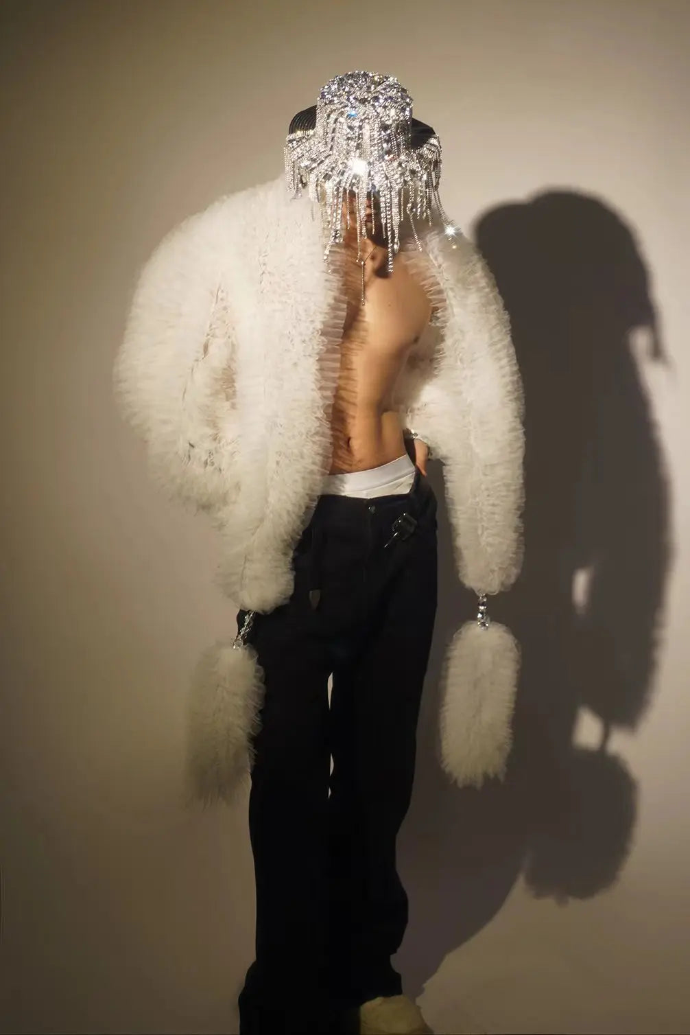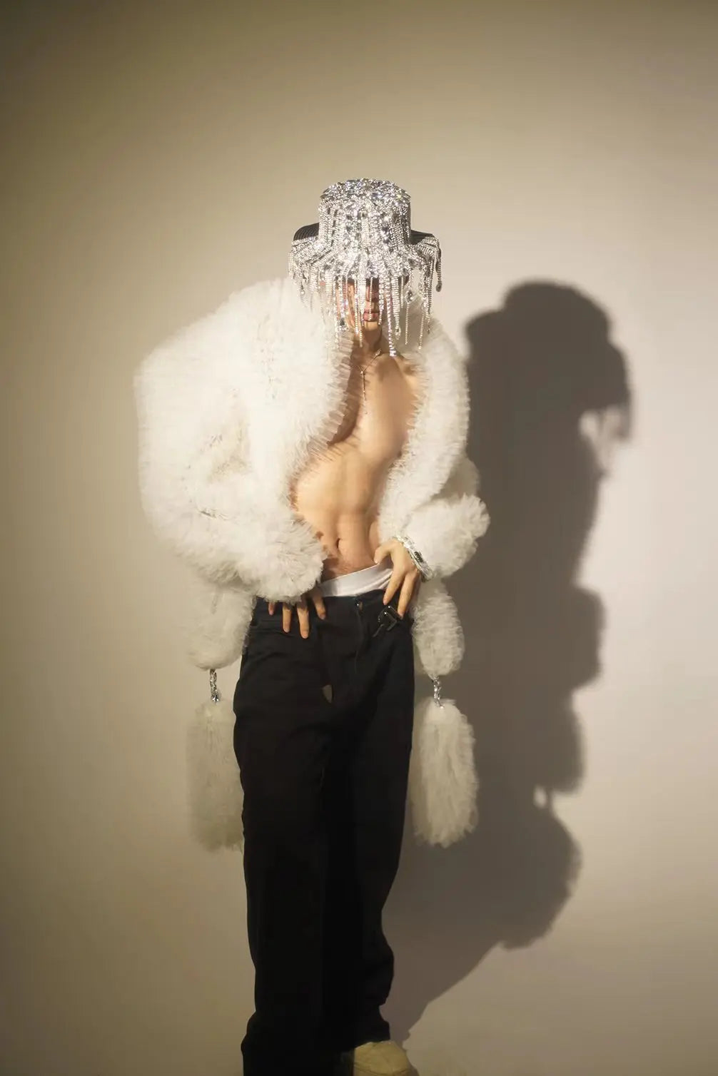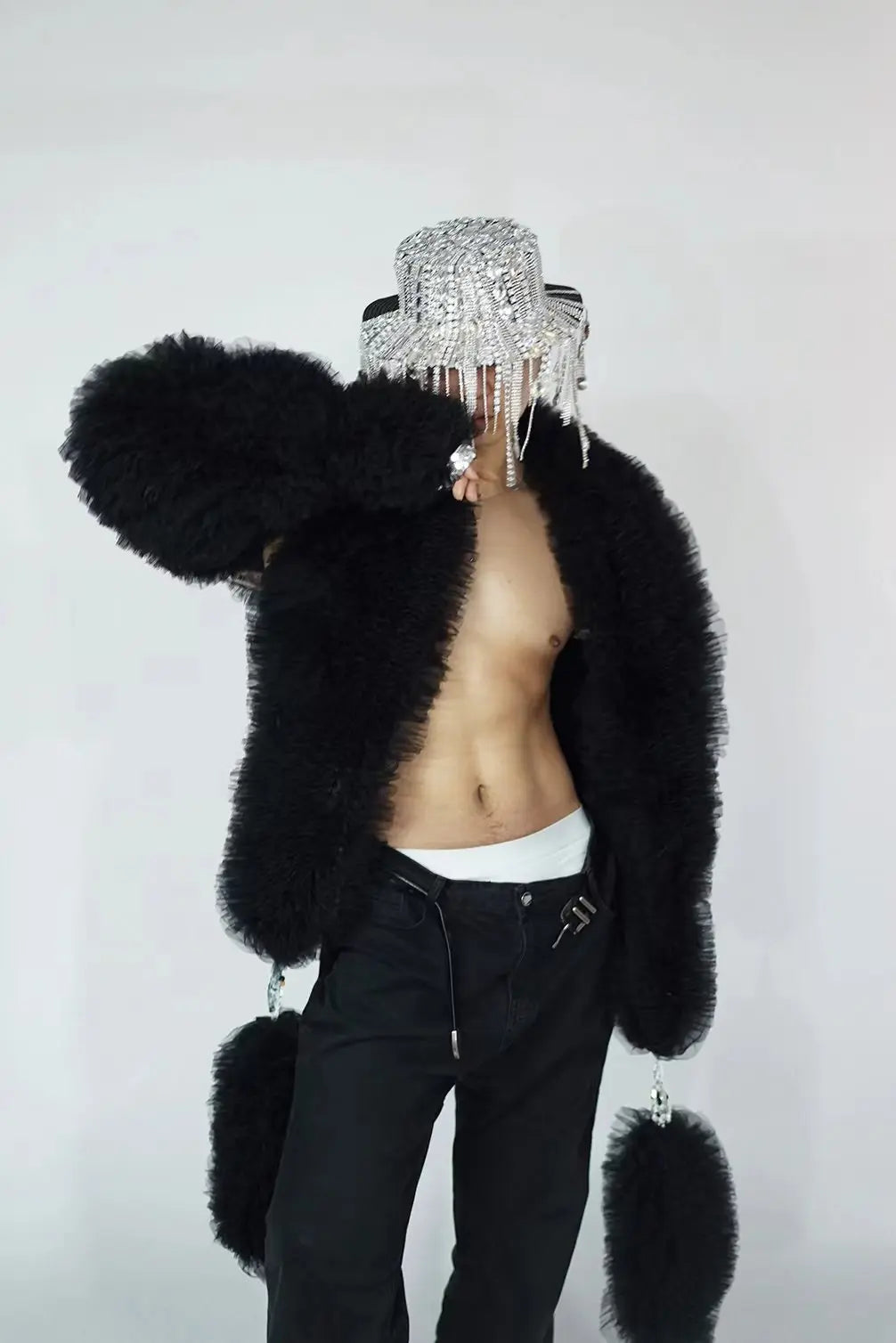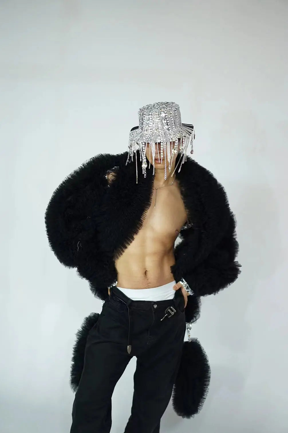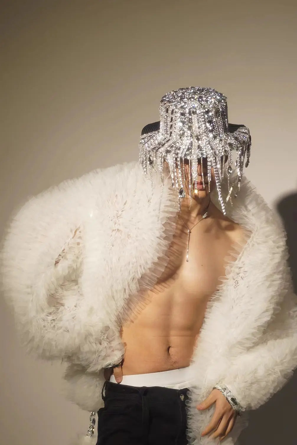 A dazzlingsparkly sequins white mesh coatdesigned as a unisex stage piece for singers, DJs, models, and performers. Combines breathable white mesh with high‑impact sequin fields and open‑stitch detailing to create an eye‑catching jacket or cloak that reads well on stage and in photos.