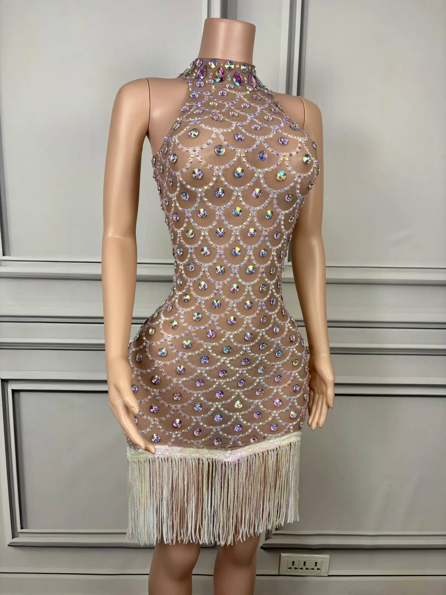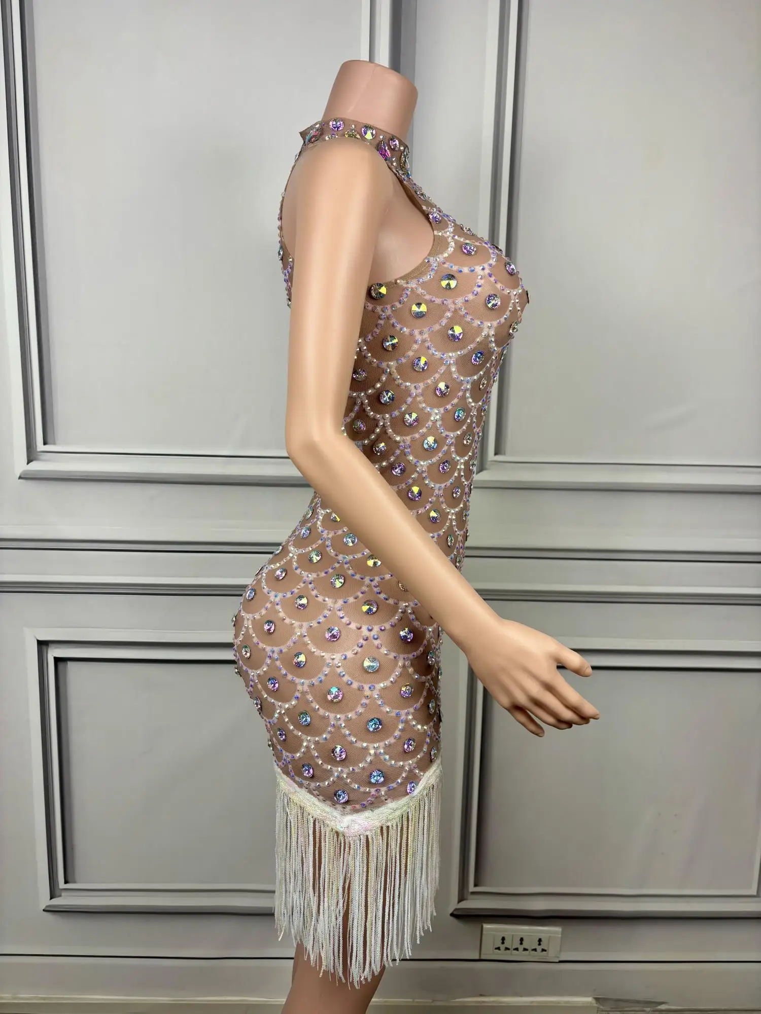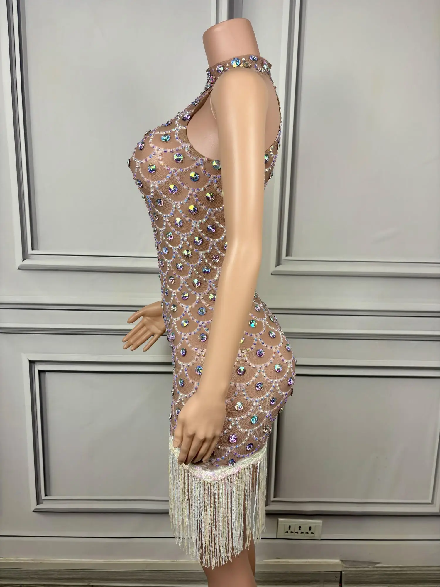 Fashion Tassel Rhinestones Luxurious Dresses Sexy Transparent Outfit Dance Stage Wedding Nightclub Handmade Costume Langhua