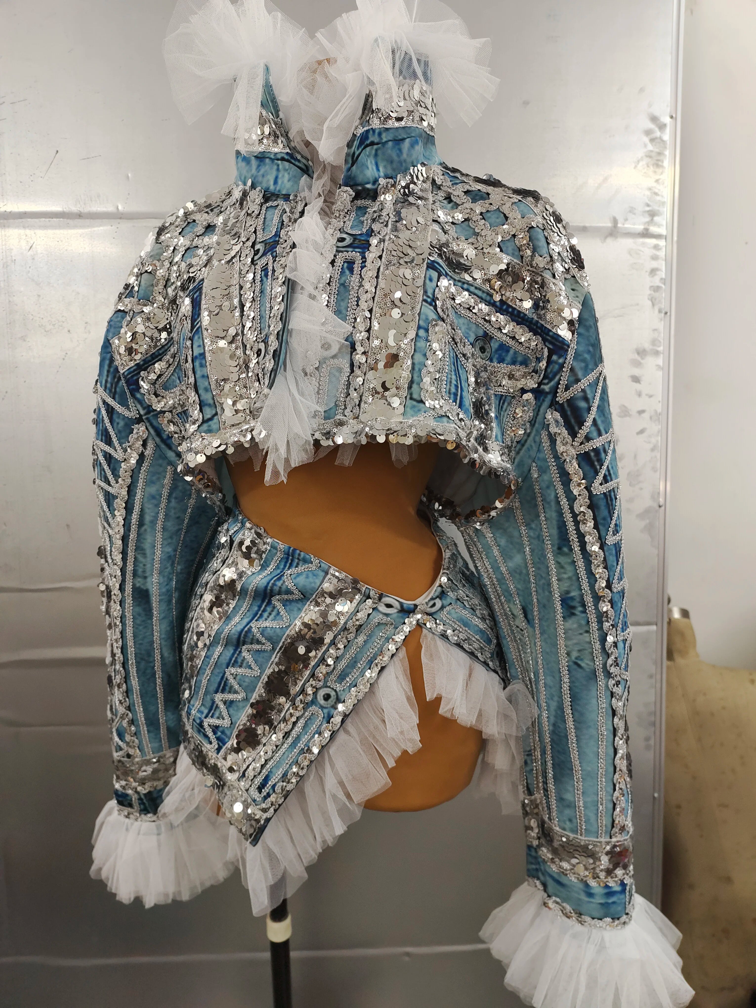 This faux denim short jacket and skirt outfit is a stylish and versatile choice for women's stage costumes, perfect for singers, club parties, and birthday performances. The set is designed to make a statement, suitable for bar and club stages, as well as pole dance performances. Its alluring and sexy design makes it an ideal ensemble for those looking to captivate their audience with a fashionable and bold look.