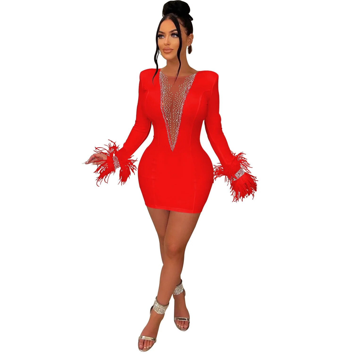 Feather Rhinestone Mesh Bodycon Mini Dress Women Night Club See Through Outfits Party Evening Sexy Diamond Prom Short Dresses