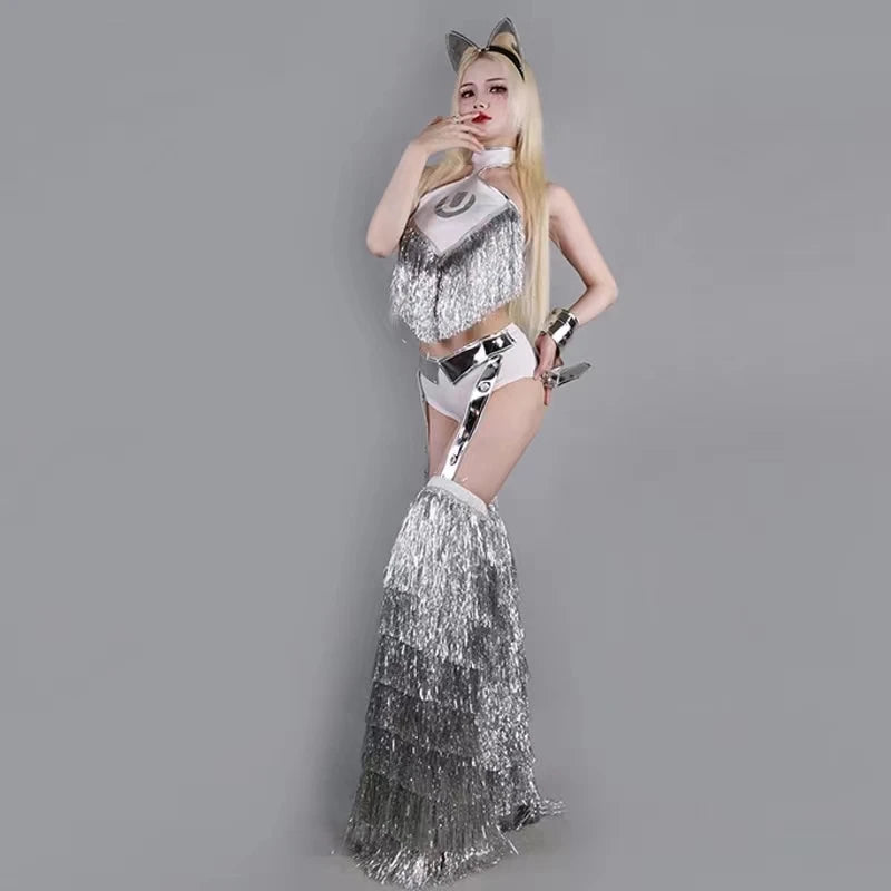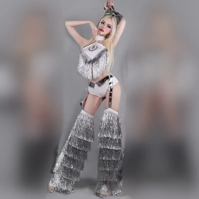 Turn heads with this eye-catching silver tassel bodysuit, designed for female jazz dance teams and nightclub performances. This stylish outfit features leg covers that add flair and movement, making it perfect for party shows and raves. Crafted for comfort and flexibility, this performance costume ensures you can dance with confidence, whether on stage or at a vibrant bar setting. Express your unique style and elevate your dance routine with this stunning bodysuit!