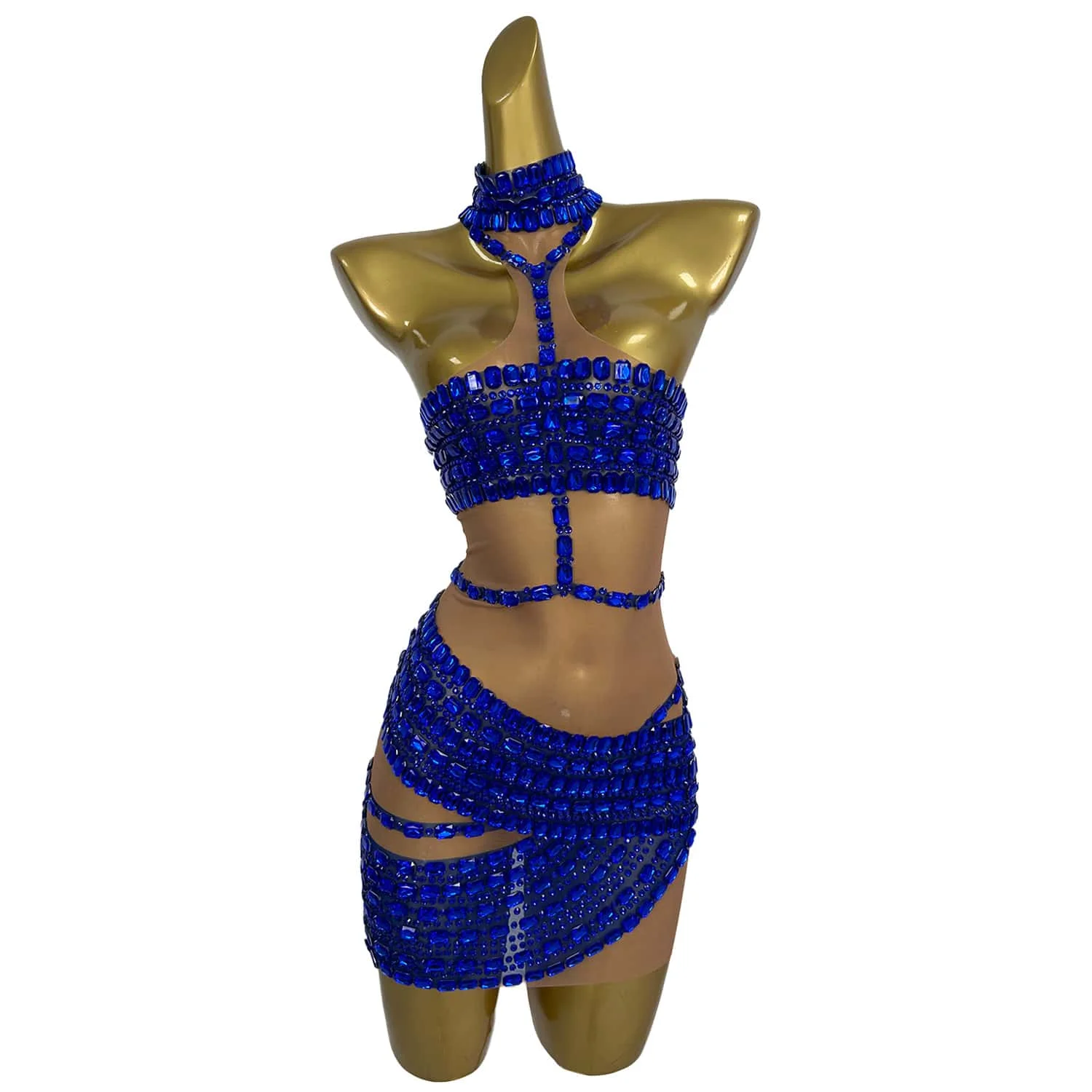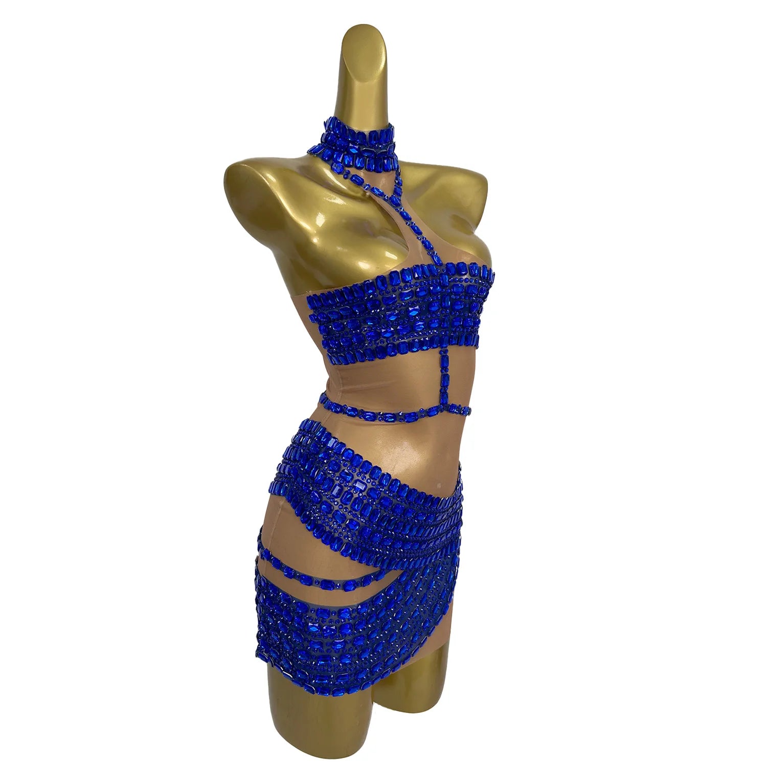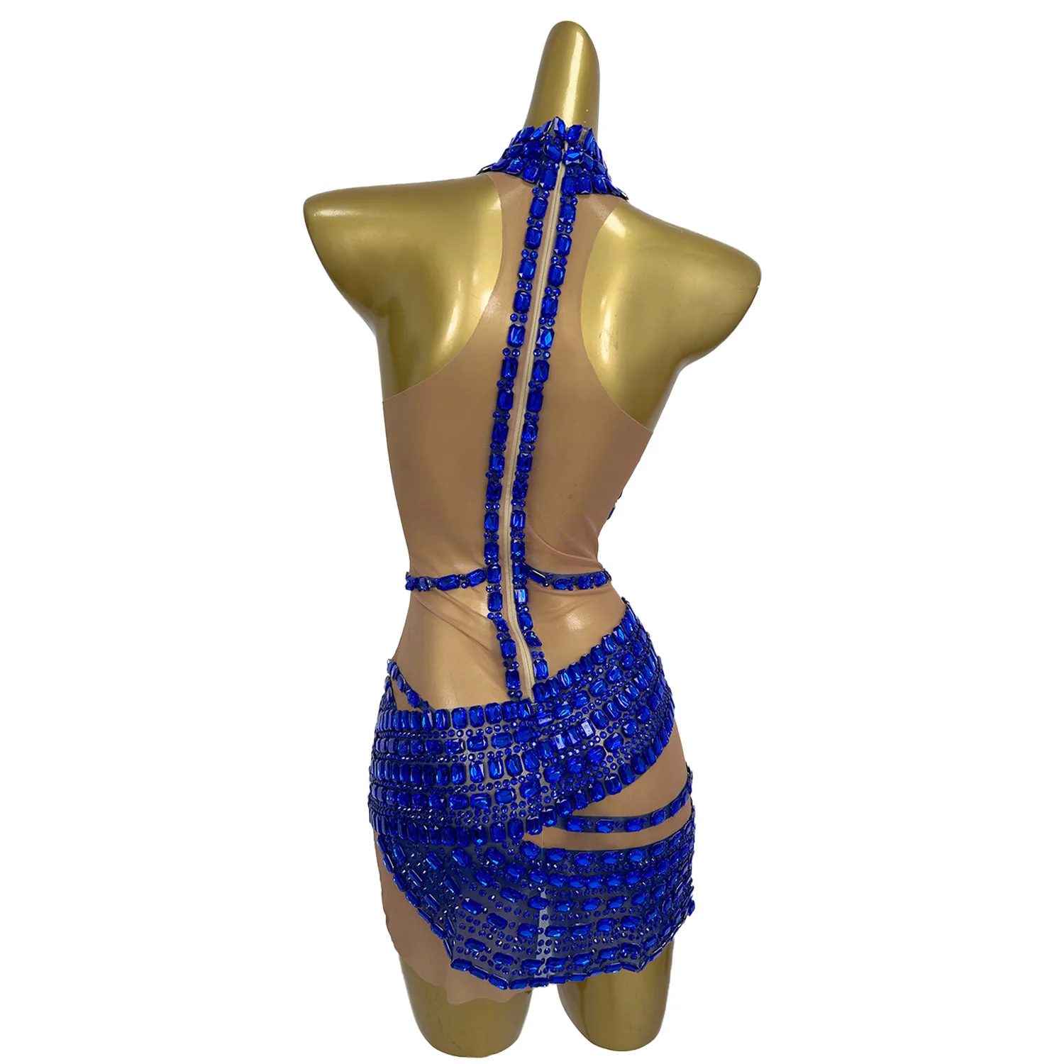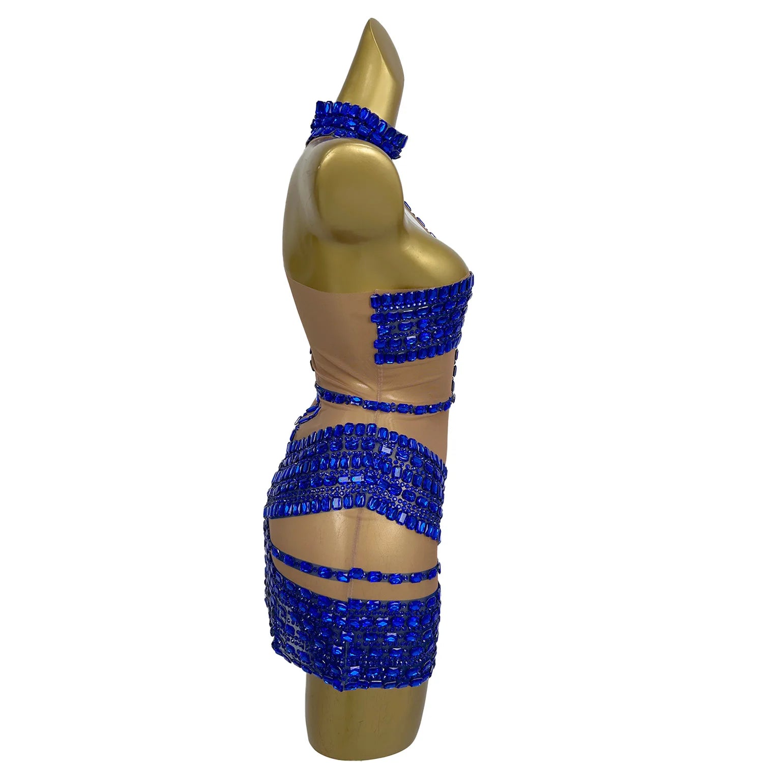 Flashing Blue Rhinestone Sexy Sleeveless Dress Luxury Women Prom Evening Party Gown Club Stage Performance Clothing Fangtang