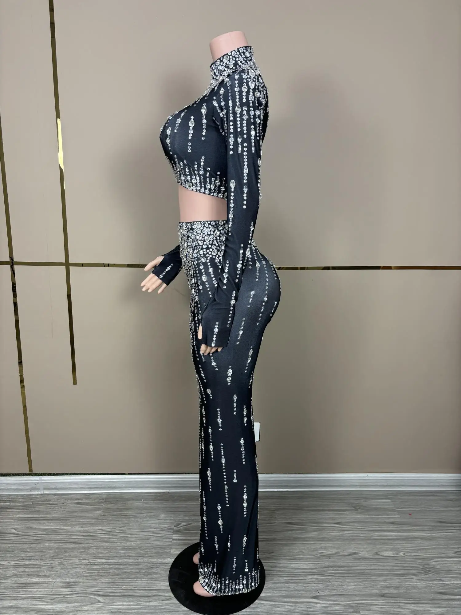 Flashing Diamond Black Tops and Skirt 2-Pieces Set Nightclub Party Bar Performance Costume Women Dress Stage Wear Liuxing