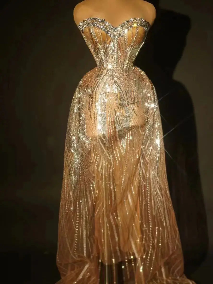 Get ready to steal the spotlight with this dazzling two-piece outfit! The Flashing Party Dress features a stunning strapless design embellished with shimmering silver sequins and sparkling diamonds, making it the perfect choice for celebrities and performers alike. Ideal for prom, club shows, or any stage event, this glamorous gown ensures you'll shine bright and turn heads wherever you go!