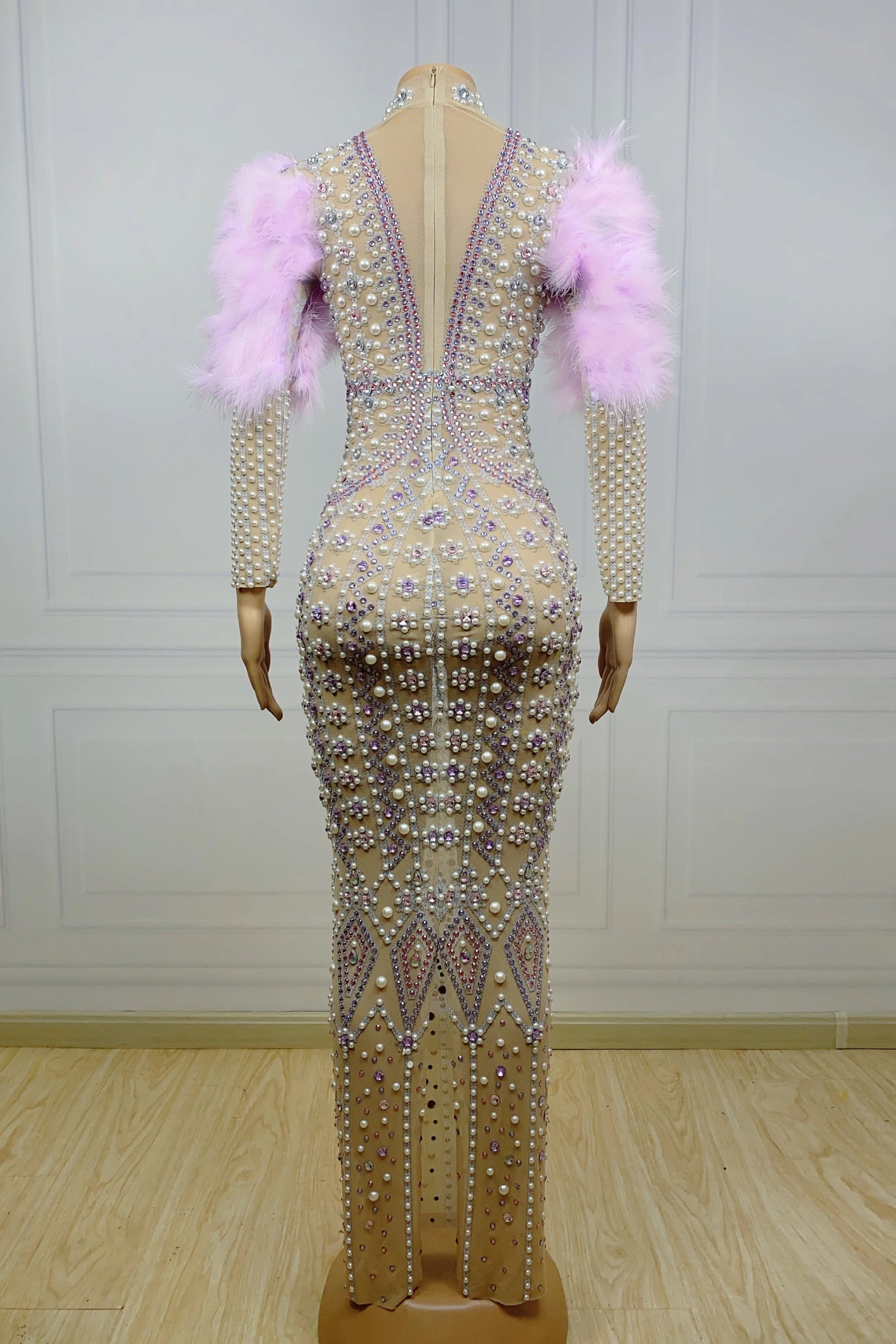 Indulge in luxury with this stunning Rhinestones Pearl Pink Feather Long Dress. Perfect for celebrating special occasions, this dress is an ideal choice for performances, costumes, proms, parties, and show-stopping events.