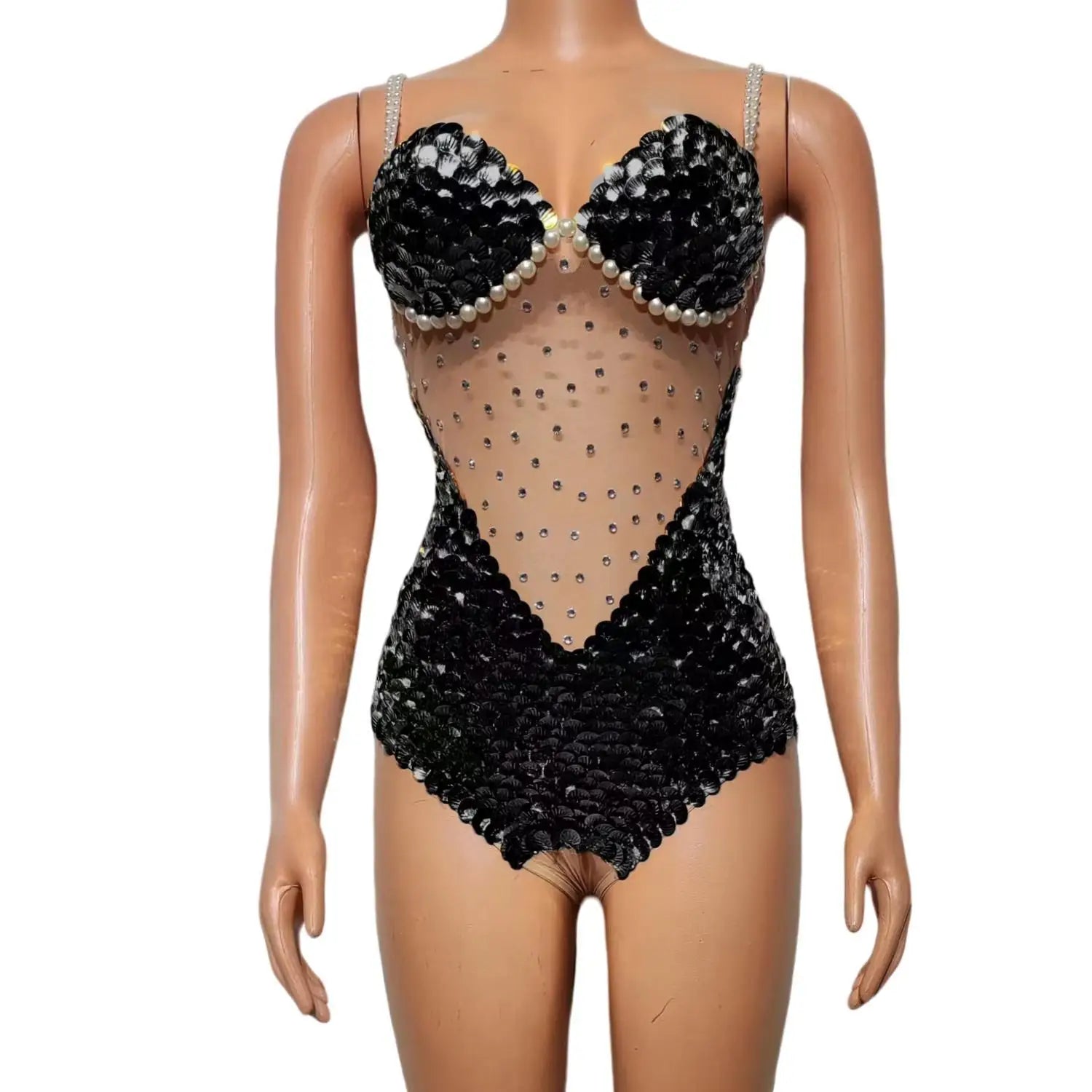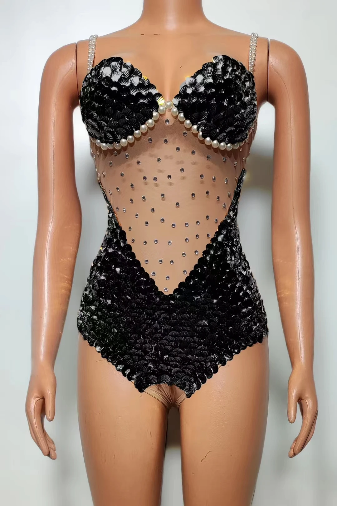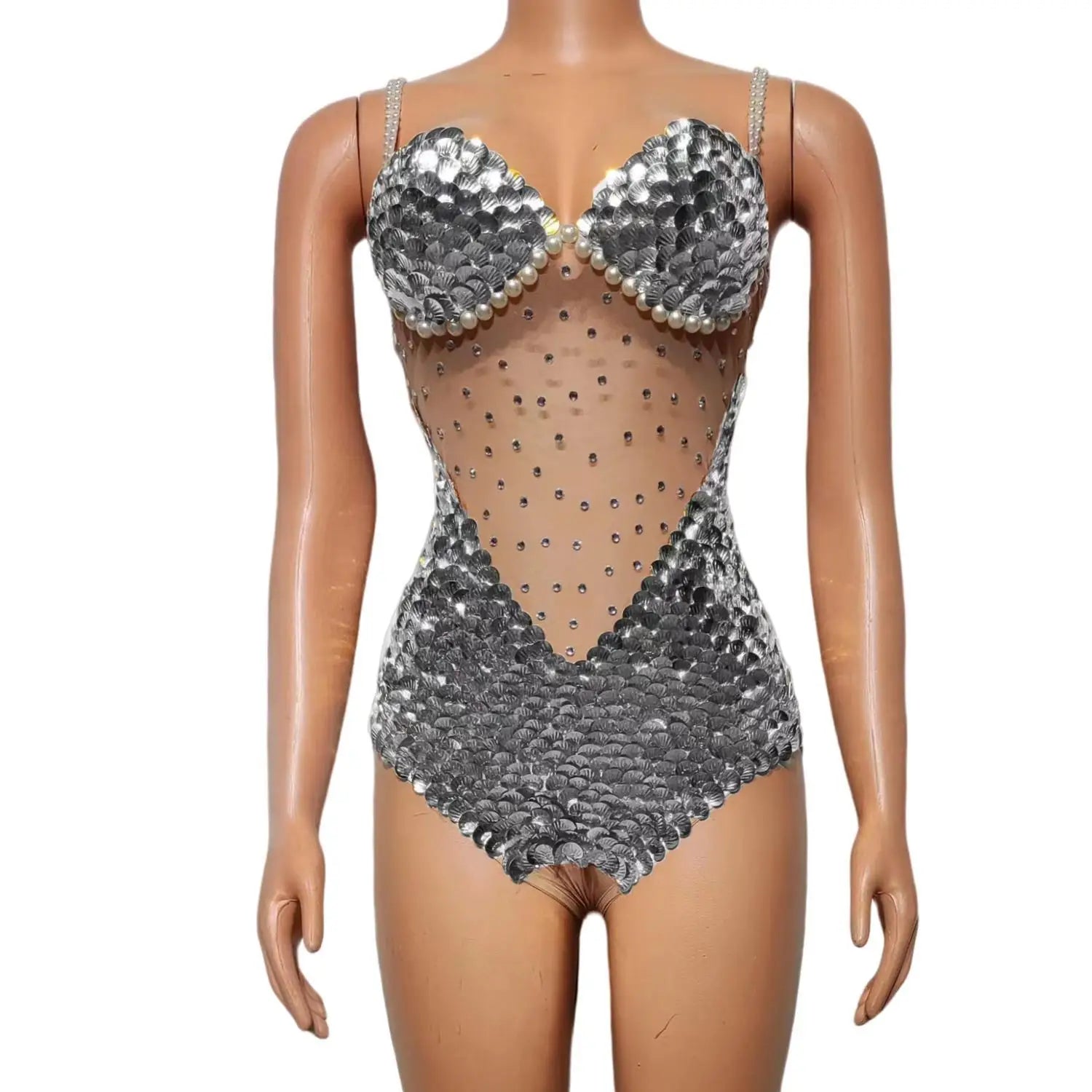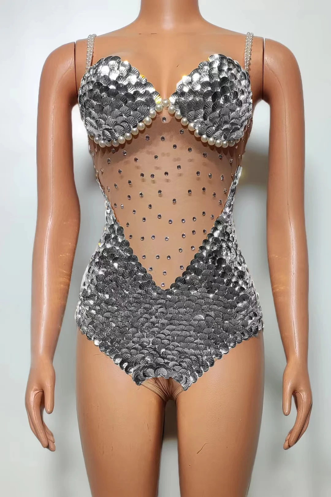 Flashing Sequins Pearls Leotard Sexy See Through Bodysuit Evening Party Celebrate Costume Dancer Prom Photoshoot Wear Bingfeng