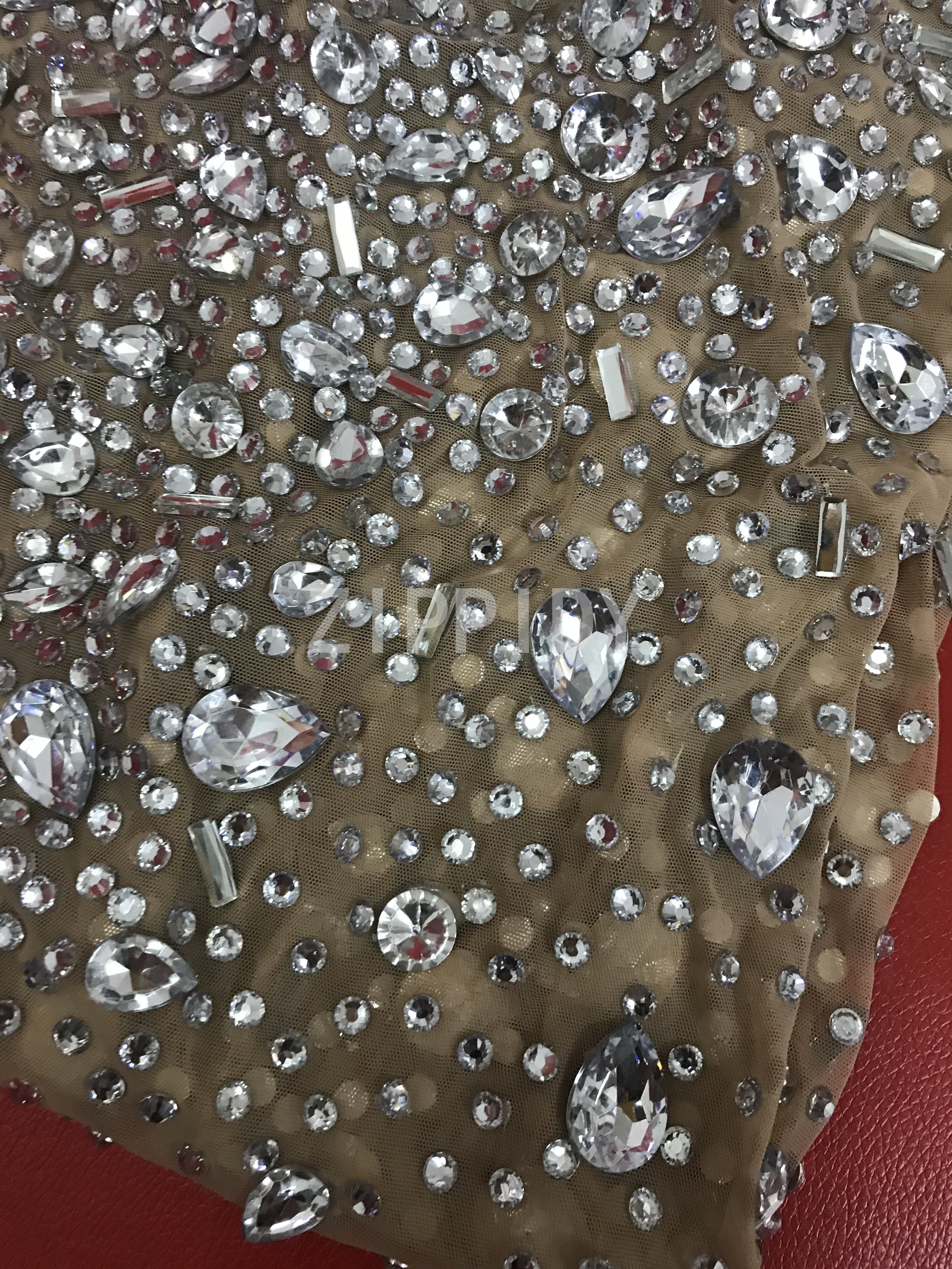 Flashing Silver Crystals Stones Transparent Long Dress Evening Birthday Celebrate Mesh Stretch Dance Long Sleeves Dress