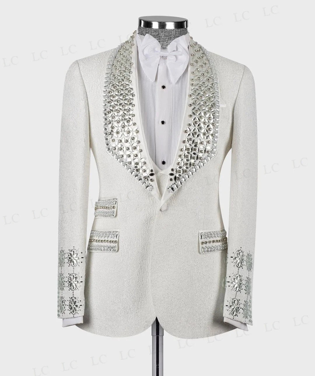 This elegant 2-piece men's suit features a floral design with groom diamonds, beading, and crystals. The blazer and vest set is perfect for formal occasions, work wear, and weddings. Tailored for a plus size fit, the suit is designed with a single button closure for a sophisticated look.