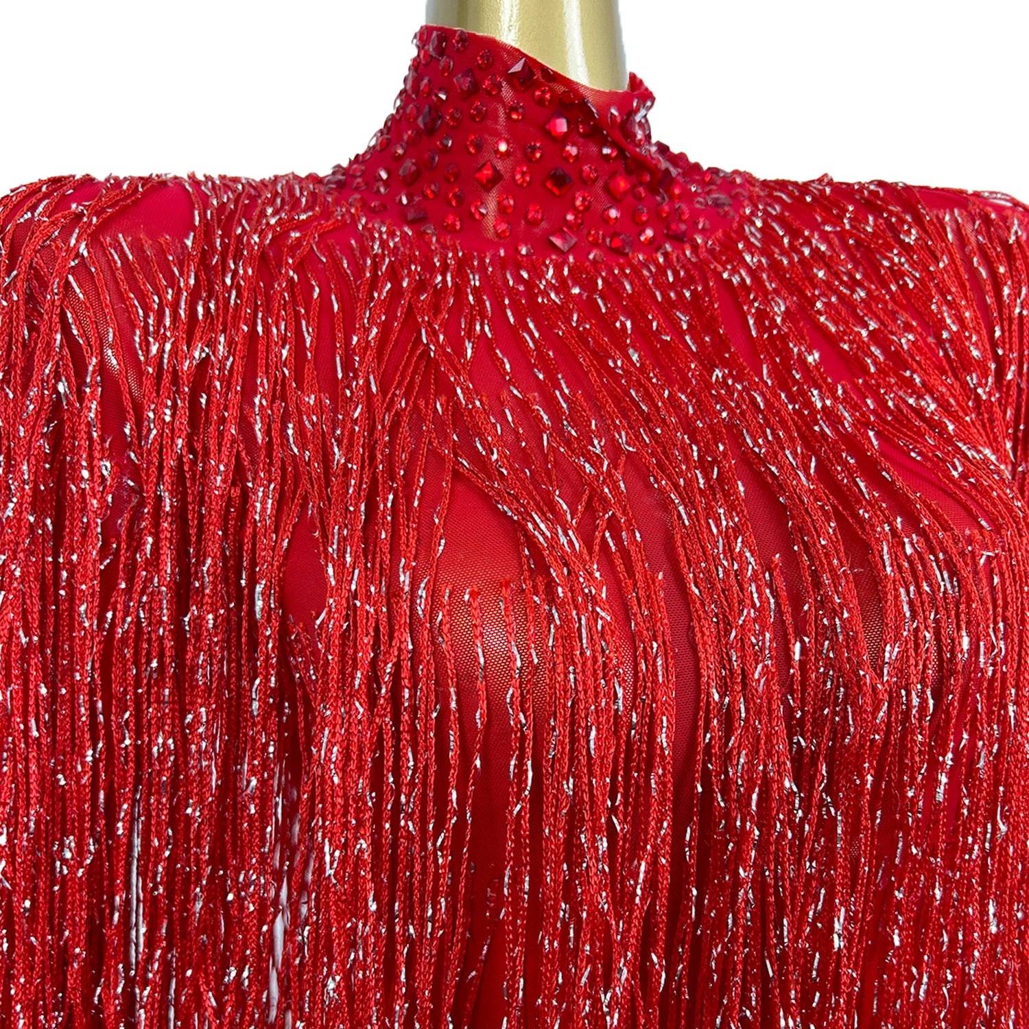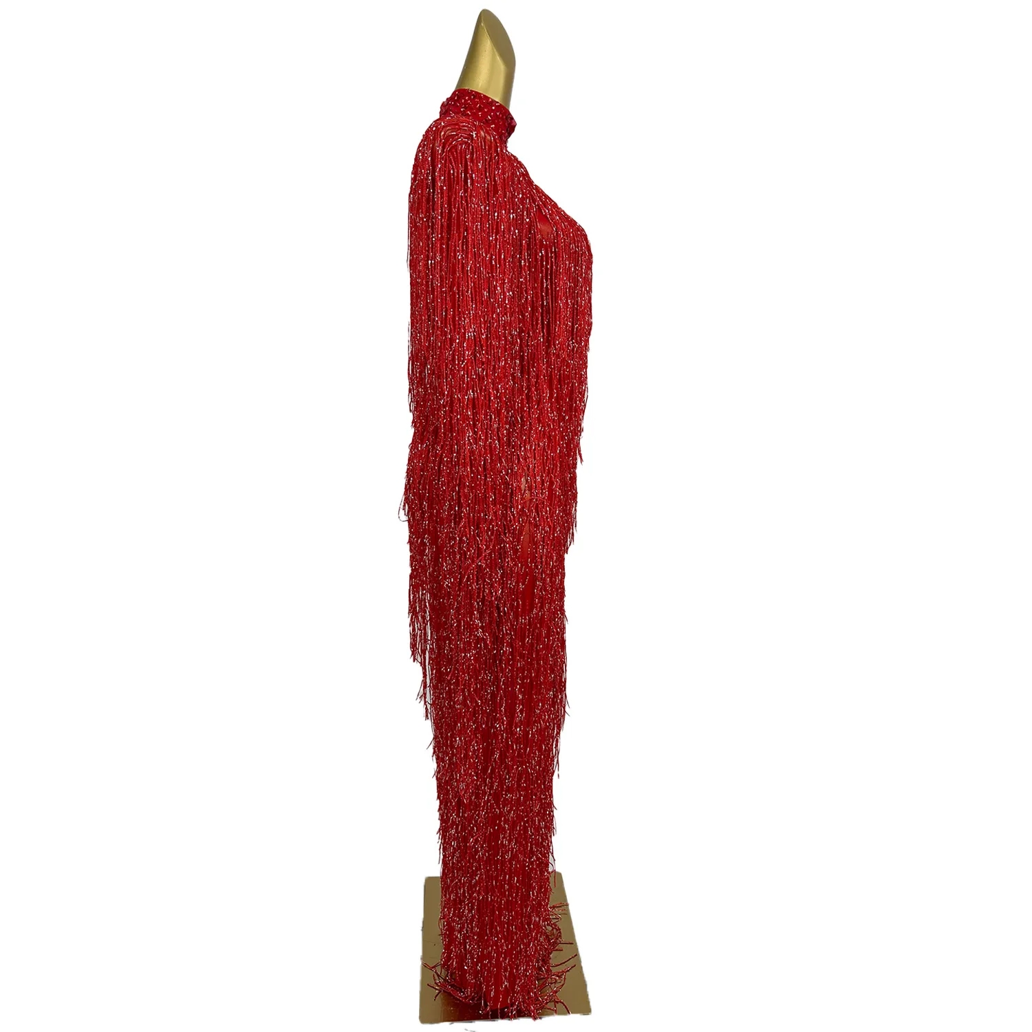 Full Tassel Dress Long Sleeves Stretch Party Fringes Dress Women Singer Stage Performance Dress Dance Costumes Shizichangqun