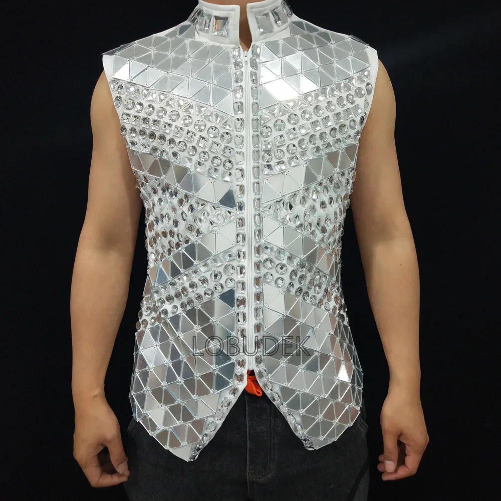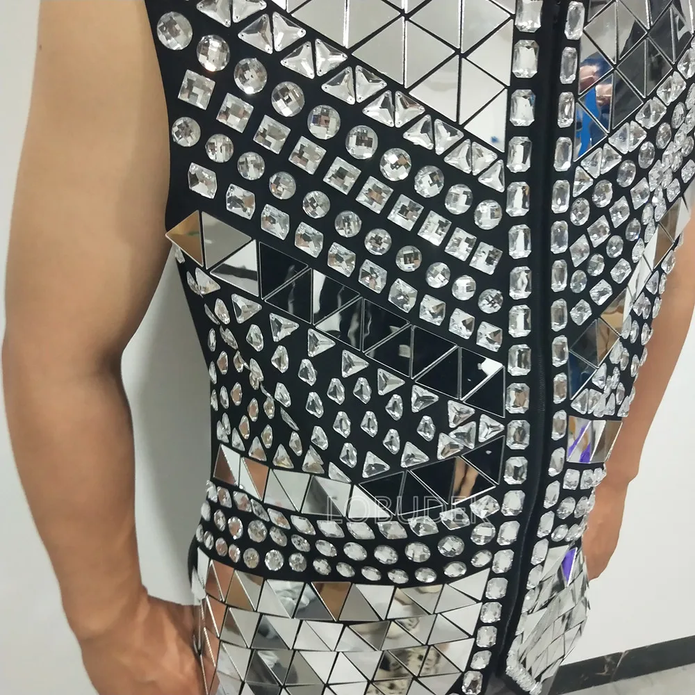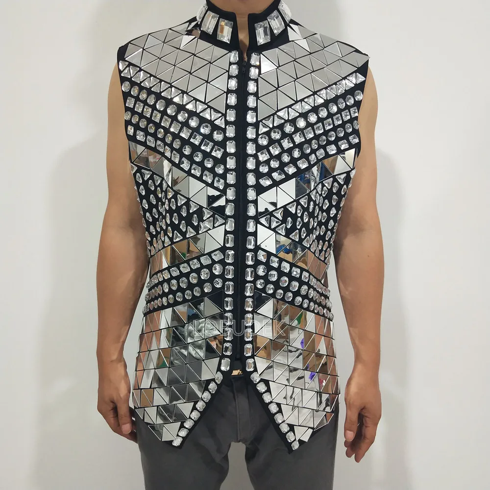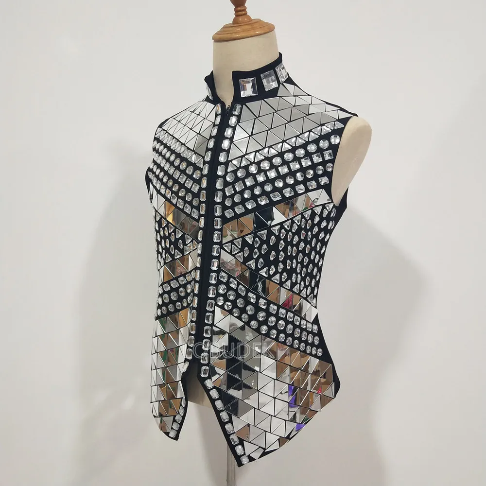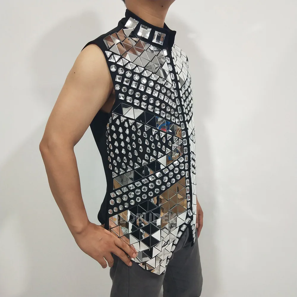 Glitter Mirror Rhinestone Waistcoat Sequin Crystal Vest Coat for Male Singer Bar Concert Stage Performance Drummer Dance Costume