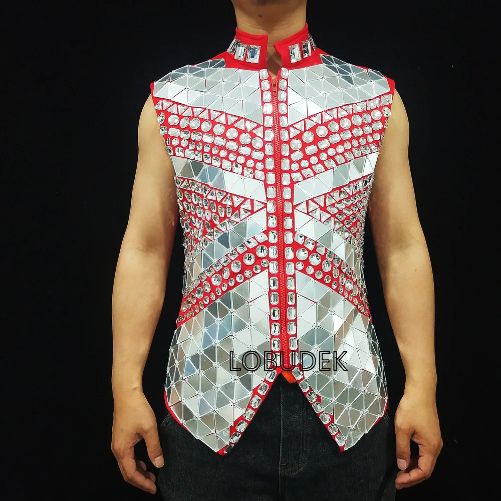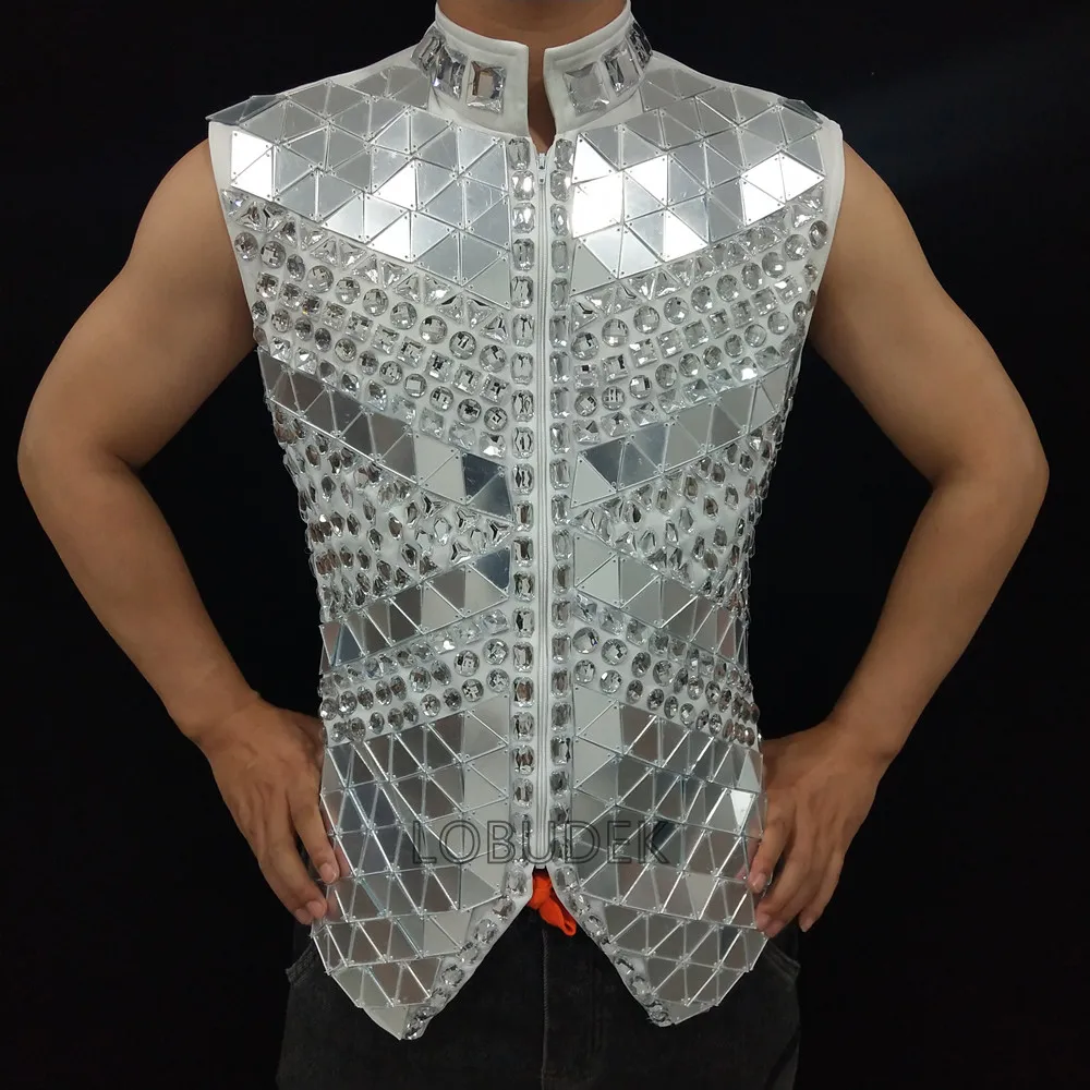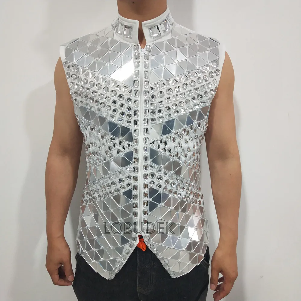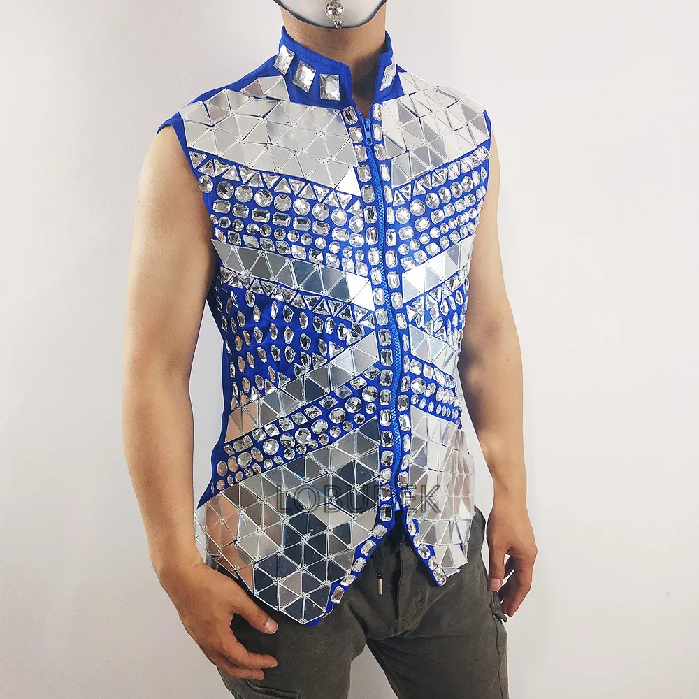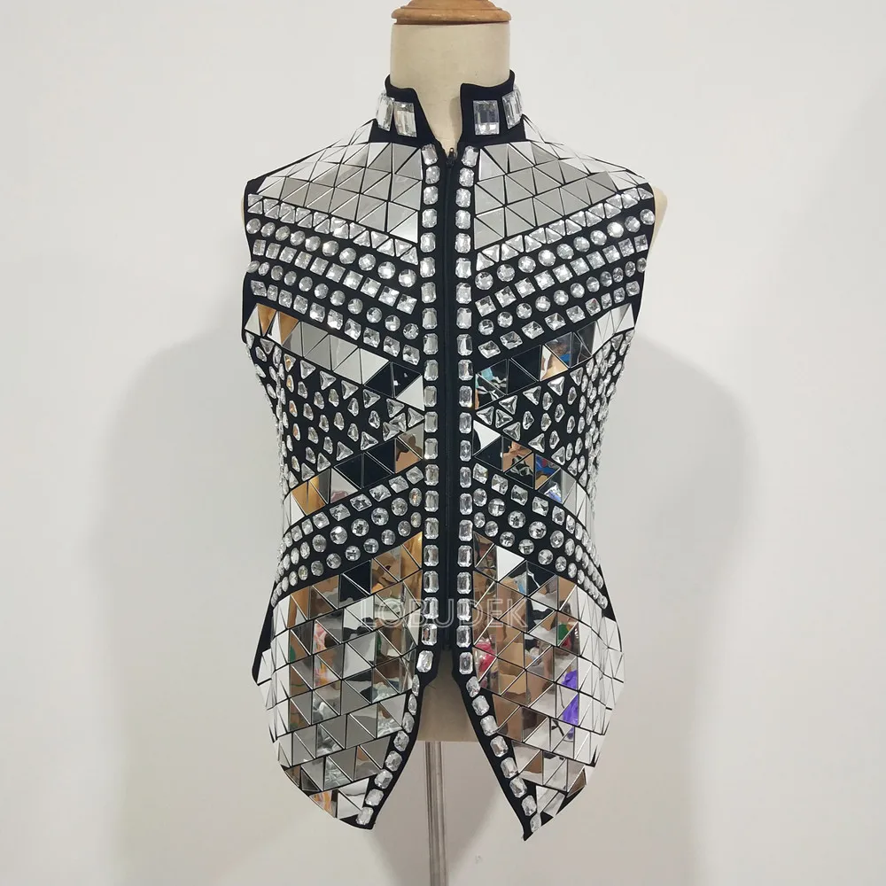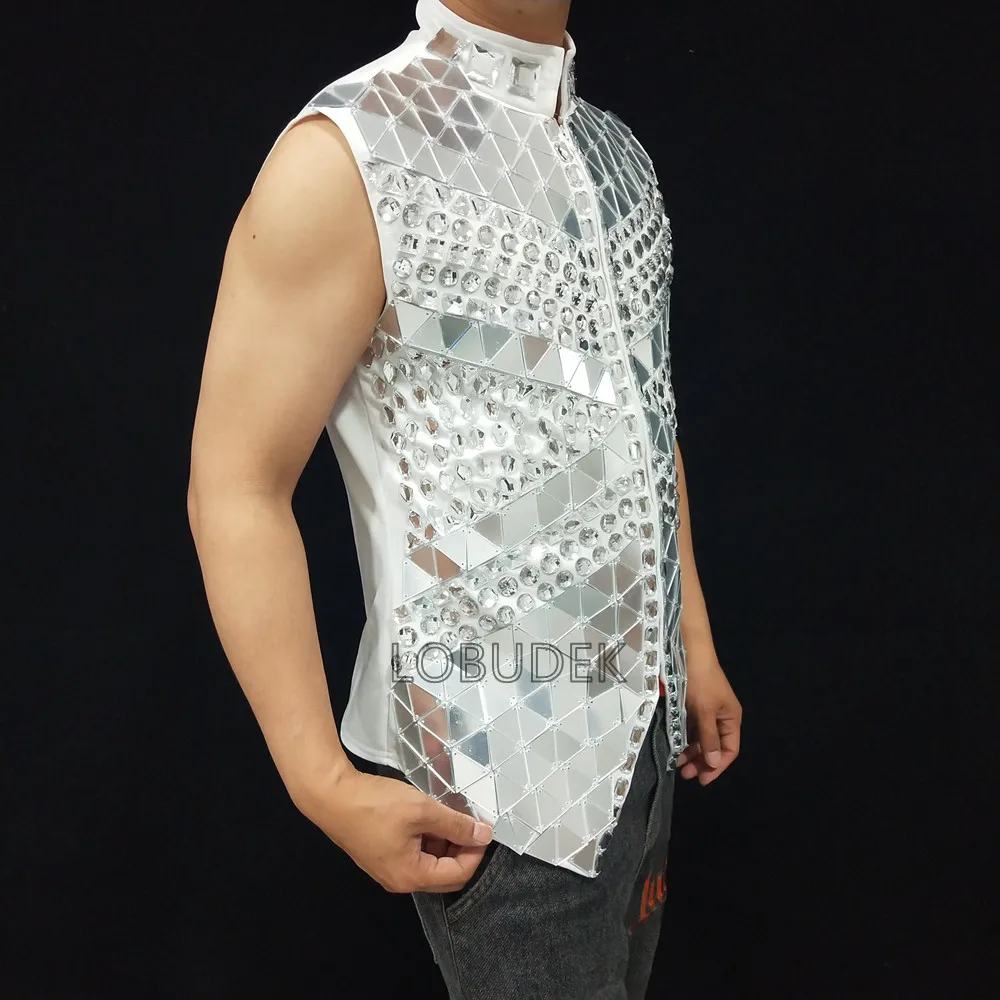 Glitter Mirror Rhinestone Waistcoat Sequin Crystal Vest Coat for Male Singer Bar Concert Stage Performance Drummer Dance Costume