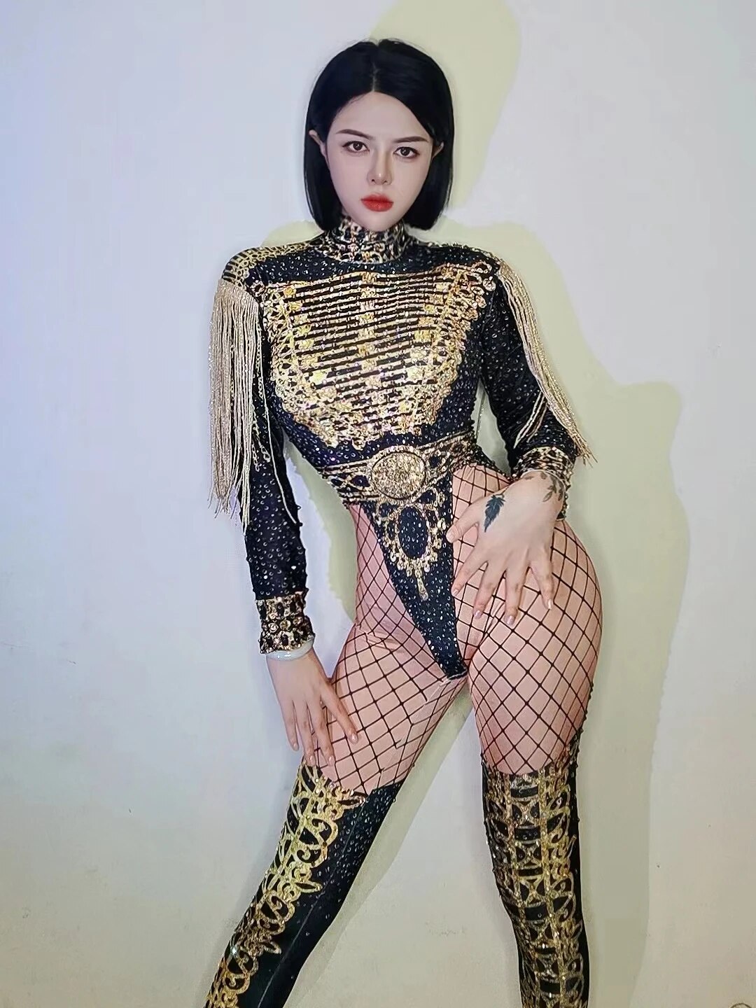 Gold Fringes Epaulet Rhinestones JumpsuitWomen Gogo Jazz Dance Nude Stretch BodysuitOutfit Evening Party Sexy Dance Wear