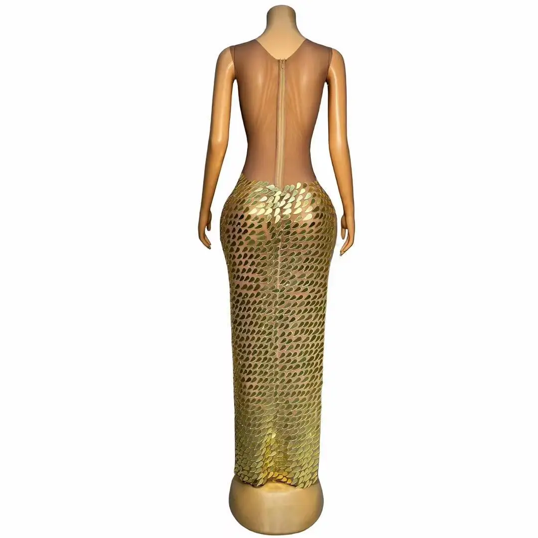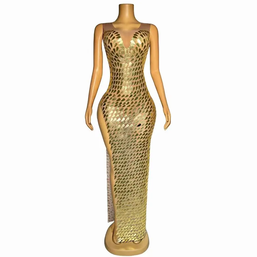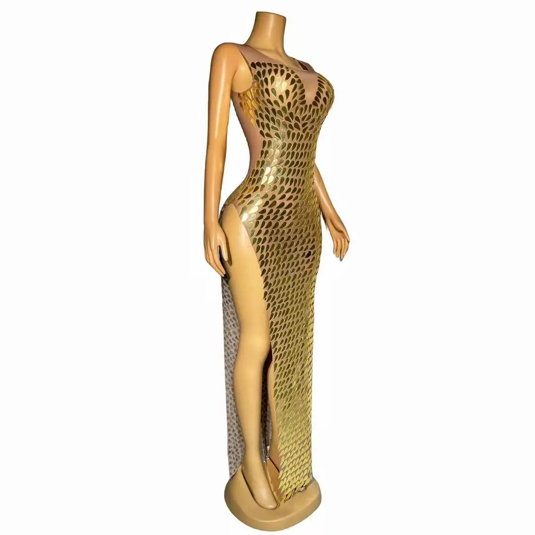 Gold Mirrors Prom Gowns High Split Sexy Dress Transparent Dance Outfit Evening Celebrate Wedding Handmade Costume Fenghuanglei