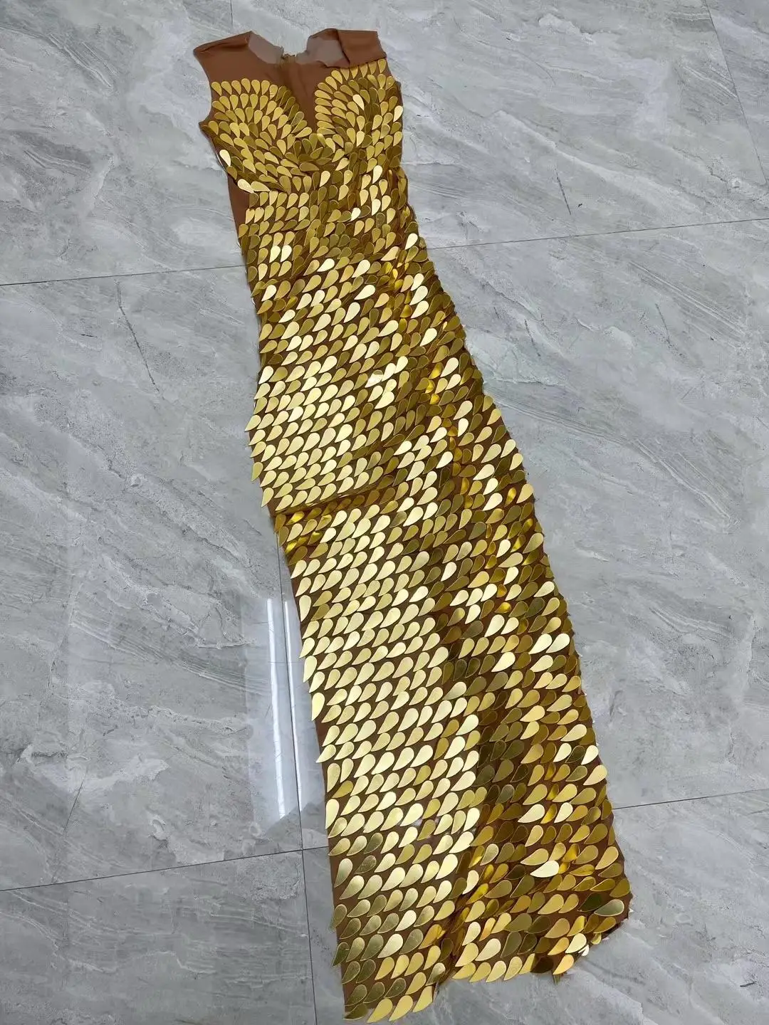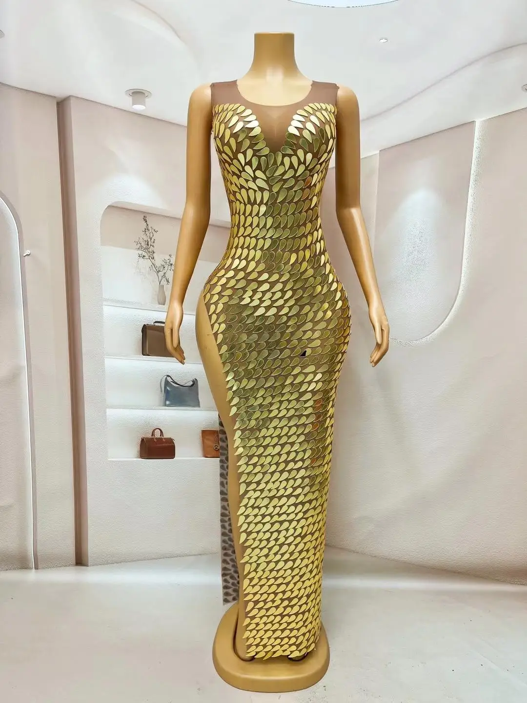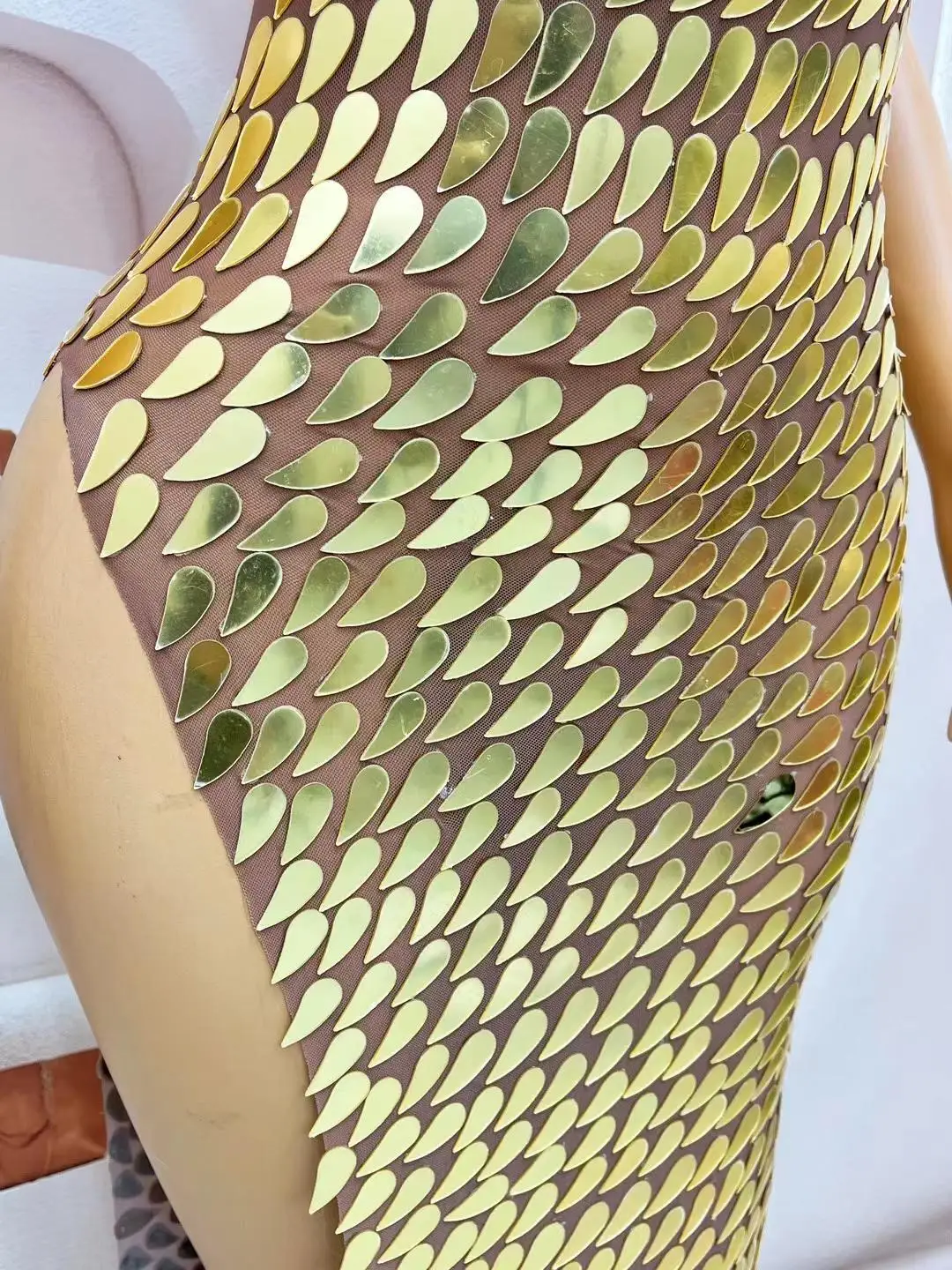 Gold Mirrors Prom Gowns High Split Sexy Dress Transparent Dance Outfit Evening Celebrate Wedding Handmade Costume Fenghuanglei