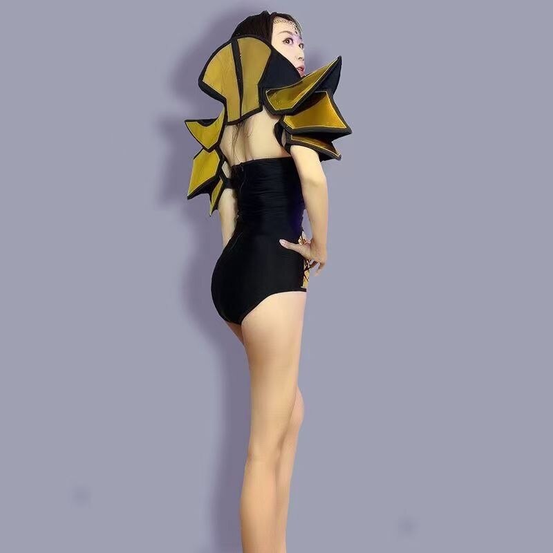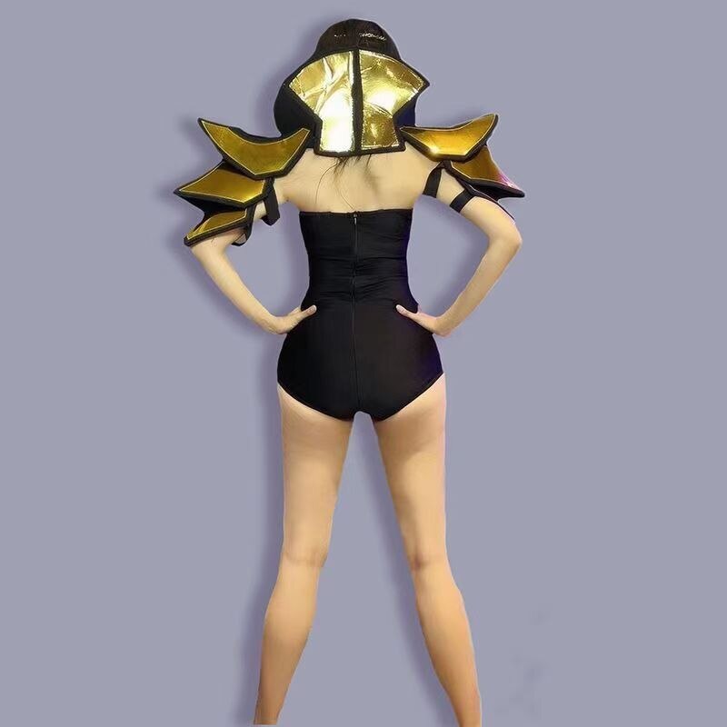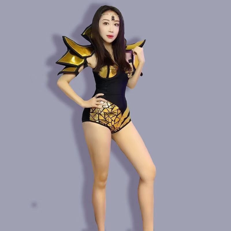 Gold Sequins Armour Black Skinny Bodysuit Evening Women Dance Show Performance Stage Wear Birthday Prom Outfit